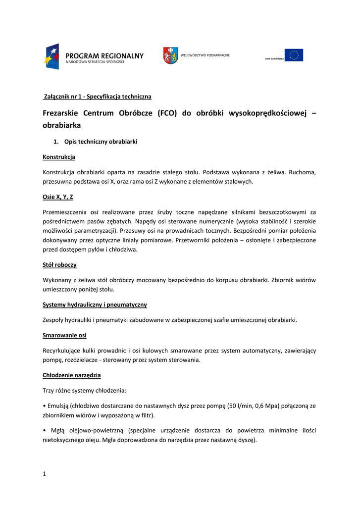 WOJEWÓDZTWO PODKARPACKIE UNIA EUROPEJSKA EUROPEJSKI FUNDUSZ Załącznik nr 1 - Specyfikacja techniczna Frezarskie Centrum Obróbcze (FCO) do obróbki wysokoprędkościowej – obrabiarka 1. Opis techniczny obrabiarki Konstrukcja Konstrukcja obrabiarki oparta na zasadzie stałego stołu. Podstawa wykonana z żeliwa. Ruchoma, przesuwna podstawa osi X, oraz rama osi Z wykonane z elementów stalowych. Osie X, Y, Z Przemieszczenia osi realizowane przez śruby toczne napędzane silnikami bezszczotkowymi za pośrednictwem pasów zębatych. Napędy osi sterowane numerycznie (wysoka stabilność i szerokie możliwości parametryzacji). Przesuwy osi na prowadnicach tocznych. Bezpośredni pomiar położenia dokonywany przez optyczne liniały pomiarowe. Przetworniki położenia – osłonięte i zabezpieczone przed dostępem pyłów i chłodziwa. Stół roboczy Wykonany z żeliwa stół obróbczy mocowany bezpośrednio do korpusu obrabiarki. Zbiornik wiórów umieszczony poniżej stołu. Systemy hydrauliczny i pneumatyczny Zespoły hydrauliki i pneumatyki zabudowane w zabezpieczonej szafie umieszczonej obrabiarki. Smarowanie osi Recyrkulujące kulki prowadnic i osi kulowych smarowane przez system automatyczny, zawierający pompę, rozdzielacze - sterowany przez system sterowania. Chłodzenie narzędzia Trzy różne systemy chłodzenia: • Emulsją (chłodziwo dostarczane do nastawnych dysz przez pompę (50 l/min, 0,6 Mpa) połączoną ze zbiornikiem wiórów i wyposażoną w filtr). • Mgłą olejowo-powietrzną (specjalne urządzenie dostarcza do powietrza minimalne ilości nietoksycznego oleju. Mgła doprowadzona do narzędzia przez nastawną dyszę). 1 • Powietrzem (bezpośrednio z systemu pneumatycznego doprowadzone do narzędzia przez dodatkowe nastawne dysze). Możliwość uruchomienia trzech systemów chłodzenia komendą w programie obróbczym, lub ręcznie specjalnym przyciskiem na panelu sterowania. Szafa elektryczna Klimatyzowana szafa elektryczna dla zagwarantowania stałej temperatury i wilgotności, oraz dla zabezpieczenia elementów elektrycznych i elektronicznych. Wyposażona w wewnętrzny system oświetlenia. Zabezpieczenie przeciw wypadkowe Obrabiarka wyposażona w zabezpieczenia przeciw wypadkowe zgodnie z wymaganiami Dyrektywy Maszynowej 2006/42/EC dla wyrobów oznaczonych znakiem CE. Obserwacja przestrzeni obróbczej możliwa przez okna wyposażone w szyby z poliwęglanu o grubości min. 5 mm. Dostęp do przestrzeni obróbczej możliwy przez parę przesuwnych drzwi, wyposażonych w elektromechaniczny system umożliwiający otwarcie drzwi wyłącznie po całkowitym zatrzymaniu obrotów wrzeciona. Przestrzeń obróbcza oświetlona przez energooszczędne lampy umieszczone wewnątrz obrabiarki i uruchamiane przyciskiem na pulpicie operatora. Zamknięcie przestrzeni obróbczej Osłona górna przestrzeni obróbczej – przesuwna osłona mieszkowa. Po otwarciu drzwi obrabiarki i ręcznym odsunięciu osłony możliwość dostępu dla dźwigu do stołu obróbczego dla załadunku obrabianej części. Magazyn narzędzi Magazyn narzędzi umieszczony wewnątrz kolumny osi Y, całkowicie zabezpieczony przed zanieczyszczeniami z przestrzeni obróbczej i wyposażony w automatyczne drzwi. System zawiera: • • • • Przesuwny łańcuch z 20 chwytakami oprawek HSK zgodnie z wyposażeniem wrzeciona Czujnik obecności narzędzia Oprogramowanie do zarządzania kolejnością narzędzi Oprogramowanie do kontroli czasu pracy każdego narzędzia. 2. Dane techniczne obrabiarki Osie liniowe • • • • • • • 2 Zakres X Y Z: min. 600 mm, 500 mm, 400 mm, odpowiednio Dokładność pozycjonowania X Y Z (wg normy VDI/DGQ 3441 - ISO 230-2): +/- 0,006 mm Powtarzalność (wg normy VDI/DGQ 3441 - ISO 230-2) X Y Z: 0,005 mm Max. prędkość liniowa: 30 m/min Max. przyspieszenie: 5 m/s² Rozmiar prowadnic X Y Z: min. 45 mm, 35 mm, 35 mm Rozmiar śrub tocznych X Y Z: min. 40 mm, 30 mm, 25 mm Stół obróbczy • • • Wymiary stołu standardowego: min. 1000 x 500 mm Wysokość stołu nad podłogą: min. 800 mm Max. obciążalność stołu: 700 kg Dane instalacyjne: • • • • Zasilanie elektryczne: napięcie i częstotliwość: 400 V ± 10%, 50 Hz zgodność z normą IEC/EN 60204-1 Zasilanie pneumatyczne: ciśnienie: 0.6 MPa ± 10% (6 bar ± 10%) zgodność z normą ISO 8573-1 Masa obrabiarki: max 6500 kg Mx. Wysokość: 3500 mm 3. Wrzeciono frezujące 3 osiowe • • • • • Moc (S6 - 60%): max. 55 kW Prędkość obrotowa wrzeciona: mx. 25000 1/min Mocowanie narzędzia (DIN 69 893): HSK Wewnętrzny rozmiar łożyska czoła wrzeciona: max. 65 mm Wysokość czoła wrzeciona nad stołem obróbczym: max. 650 mm 4. Stół obrotowo – uchylny i akcesoria Stół uchylno-obrotowy z ciągłymi osiami wykonany z odlewów żeliwnych i stopów aluminiowych o wysokich charakterystykach mechanicznych, montowany bezpośrednio do podstawy obrabiarki. Napęd osi C realizowana przez silnik z napędem bezpośrednim, napęd osi A realizowany jest przez silnik bezszczotkowy i przekładnię ślimakową. Pomiar położenia osi obrotowych realizowany w bezpośredni sposób przez czujniki optyczne. Osie wyposażone w hamulce hydrauliczne. • • • • Maksymalna obracana średnica: 570 / 520 mm Max wysokość obracanej części Φ570 / 520: 158 / 254 mm Rozmiary płyty: max. Φ 450 mm Max. Obciążenie: 350 Kg 5. Urządzenie do pomiaru narzędzi Automatyczny pomiar z sondą laserową. System umożliwia pomiar długości, średnicy i kształtu narzędzia w cyklu automatycznym. Sprawdza do 10 różnych kształtów narzędzia. Urządzenie pomiarowe – sonda laserowa umieszczona bezpiecznie na kolumnach korpusu osi Y, poza zakresem obróbczym osi. Zestaw zawiera: • System przedmuchu dla oczyszczenia narzędzi. • Kartę kontrolera i kable połączeniowe. • Oprogramowanie do ustawienia narzędzi. • Modele przykładowych narzędzi. 3 6. System pomiarowy z cyfrową sondą Zawiera: • • • • • • 