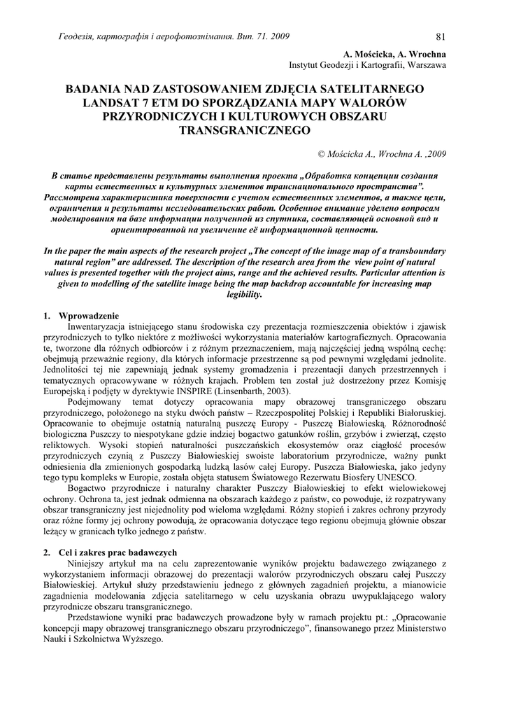Ƚɟɨɞɟɡɿɹ, ɤɚɪɬɨɝɪɚɮɿɹ ɿ ɚɟɪɨɮɨɬɨɡɧɿɦɚɧɧɹ. ȼɢɩ. 71. 2009 81 A. MoĞcicka, A. Wrochna Instytut Geodezji i Kartografii, Warszawa BADANIA NAD ZASTOSOWANIEM ZDJĉCIA SATELITARNEGO LANDSAT 7 ETM DO SPORZĄDZANIA MAPY WALORÓW PRZYRODNICZYCH I KULTUROWYCH OBSZARU TRANSGRANICZNEGO © MoĞcicka A., Wrochna A. ,2009 ȼ ɫɬɚɬɶɟ ɩɪɟɞɫɬɚɜɥɟɧɵ ɪɟɡɭɥɶɬɚɬɵ ɜɵɩɨɥɧɟɧɢɹ ɩɪɨɟɤɬɚ „Ɉɛɪɚɛɨɬɤɚ ɤɨɧɰɟɩɰɢɢ ɫɨɡɞɚɧɢɹ ɤɚɪɬɵ ɟɫɬɟɫɬɜɟɧɧɵɯ ɢ ɤɭɥɶɬɭɪɧɵɯ ɷɥɟɦɟɧɬɨɜ ɬɪɚɧɫɧɚɰɢɨɧɚɥɶɧɨɝɨ ɩɪɨɫɬɪɚɧɫɬɜɚ”. Ɋɚɫɫɦɨɬɪɟɧɚ ɯɚɪɚɤɬɟɪɢɫɬɢɤɚ ɩɨɜɟɪɯɧɨɫɬɢ ɫ ɭɱɟɬɨɦ ɟɫɬɟɫɬɜɟɧɧɵɯ ɷɥɟɦɟɧɬɨɜ, ɚ ɬɚɤɠɟ ɰɟɥɢ, ɨɝɪɚɧɢɱɟɧɢɹ ɢ ɪɟɡɭɥɶɬɚɬɵ ɢɫɫɥɟɞɨɜɚɬɟɥɶɫɤɢɯ ɪɚɛɨɬ. Ɉɫɨɛɟɧɧɨɟ ɜɧɢɦɚɧɢɟ ɭɞɟɥɟɧɨ ɜɨɩɪɨɫɚɦ ɦɨɞɟɥɢɪɨɜɚɧɢɹ ɧɚ ɛɚɡɟ ɢɧɮɨɪɦɚɰɢɢ ɩɨɥɭɱɟɧɧɨɣ ɢɡ ɫɩɭɬɧɢɤɚ, ɫɨɫɬɚɜɥɹɸɳɟɣ ɨɫɧɨɜɧɨɣ ɜɢɞ ɢ ɨɪɢɟɧɬɢɪɨɜɚɧɧɨɣ ɧɚ ɭɜɟɥɢɱɟɧɢɟ ɟɺ ɢɧɮɨɪɦɚɰɢɨɧɧɨɣ ɰɟɧɧɨɫɬɢ. In the paper the main aspects of the research project „The concept of the image map of a transboundary natural region” are addressed. The description of the research area from the view point of natural values is presented together with the project aims, range and the achieved results. Particular attention is given to modelling of the satellite image being the map backdrop accountable for increasing map legibility. 1. Wprowadzenie Inwentaryzacja istniejącego stanu Ğrodowiska czy prezentacja rozmieszczenia obiektów i zjawisk przyrodniczych to tylko niektóre z moĪliwoĞci wykorzystania materiaáów kartograficznych. Opracowania te, tworzone dla róĪnych odbiorców i z róĪnym przeznaczeniem, mają najczĊĞciej jedną wspólną cechĊ: obejmują przewaĪnie regiony, dla których informacje przestrzenne są pod pewnymi wzglĊdami jednolite. JednolitoĞci tej nie zapewniają jednak systemy gromadzenia i prezentacji danych przestrzennych i tematycznych opracowywane w róĪnych krajach. Problem ten zostaá juĪ dostrzeĪony przez KomisjĊ Europejską i podjĊty w dyrektywie INSPIRE (Linsenbarth, 2003). Podejmowany temat dotyczy opracowania mapy obrazowej transgraniczego obszaru przyrodniczego, poáoĪonego na styku dwóch paĔstw – Rzeczpospolitej Polskiej i Republiki Biaáoruskiej. Opracowanie to obejmuje ostatnią naturalną puszczĊ Europy - PuszczĊ Biaáowieską. RóĪnorodnoĞü biologiczna Puszczy to niespotykane gdzie indziej bogactwo gatunków roĞlin, grzybów i zwierząt, czĊsto reliktowych. Wysoki stopieĔ naturalnoĞci puszczaĔskich ekosystemów oraz ciągáoĞü procesów przyrodniczych czynią z Puszczy Biaáowieskiej swoiste laboratorium przyrodnicze, waĪny punkt odniesienia dla zmienionych gospodarką ludzką lasów caáej Europy. Puszcza Biaáowieska, jako jedyny tego typu kompleks w Europie, zostaáa objĊta statusem ĝwiatowego Rezerwatu Biosfery UNESCO. Bogactwo przyrodnicze i naturalny charakter Puszczy Biaáowieskiej to efekt wielowiekowej ochrony. Ochrona ta, jest jednak odmienna na obszarach kaĪdego z paĔstw, co powoduje, iĪ rozpatrywany obszar transgraniczny jest niejednolity pod wieloma wzglĊdami. RóĪny stopieĔ i zakres ochrony przyrody oraz róĪne formy jej ochrony powodują, Īe opracowania dotyczące tego regionu obejmują gáównie obszar leĪący w granicach tylko jednego z paĔstw. 2. Cel i zakres prac badawczych Niniejszy artykuá ma na celu zaprezentowanie wyników projektu badawczego związanego z wykorzystaniem informacji obrazowej do prezentacji walorów przyrodniczych obszaru caáej Puszczy Biaáowieskiej. Artykuá sáuĪy przedstawieniu jednego z gáównych zagadnieĔ projektu, a mianowicie zagadnienia modelowania zdjĊcia satelitarnego w celu uzyskania obrazu uwypuklającego walory przyrodnicze obszaru transgranicznego. Przedstawione wyniki prac badawczych prowadzone byáy w ramach projektu pt.: „Opracowanie koncepcji mapy obrazowej transgranicznego obszaru przyrodniczego”, finansowanego przez Ministerstwo Nauki i Szkolnictwa WyĪszego. 82 Ƚɟɨɞɟɡɿɹ, ɤɚɪɬɨɝɪɚɮɿɹ ɿ ɚɟɪɨɮɨɬɨɡɧɿɦɚɧɧɹ. ȼɢɩ. 71. 2009 W dostĊpnej literaturze krajowej i zagranicznej brak jest wystarczających doniesieĔ naukowych odnoĞnie metod prezentacji informacji przyrodniczych i krajobrazowych dotyczącej obszarów przygranicznych. Literatura przedmiotu podejmuje to zagadnienie gáównie pod kątem inwentaryzacji zasobów obszarów granicznych (Siwek, 2000). Powoduje to powstawanie opracowaĔ obejmujących odmienne kryteria doboru i prezentacji treĞci w zaleĪnoĞci od tego, którego paĔstwa czy narodu dotyczą, bądĨ opracowaĔ zawierających jedynie te informacje, które są jednolite dla caáego rozpatrywanego obszaru, a co za tym idzie, gromadząc jedynie wybrane, dalece niepeáne zasoby informacyjne. Brak jest takĪe Ĩródeá piĞmienniczych wskazujących w sposób wyczerpujący moĪliwoĞci wykorzystania materiaáów kartograficznych o obszarach transgranicznych w aspekcie prezentacji istniejących tam walorów przyrodniczych i krajobrazowych. W Ğwietle najnowszej literatury przedmiotu informacja obrazowa nabiera coraz wiĊkszego znaczenia, jednak jej wykorzystanie nadal nie jest powszechne (Cioákosz, 2000). Rola informacji obrazowej wzrasta, a problemy związane z przetwarzaniem i wykorzystaniem informacji obrazowej áączą wiele dziedzin nauki, techniki i sztuki. Informacja obrazowa inspiruje nowe koncepcje poznania i tworzenia modelu rzeczywistoĞci. ZdjĊcia satelitarne obejmujące duĪe obszary o powierzchni setek kilometrów kwadratowych, umoĪliwiają analizĊ zjawisk wielkoprzestrzennych, np. sukcesjĊ roĞlinnoĞci, koncentracjĊ chlorofilu, wylesienia, wystĊpowanie poĪarów itp. Mając