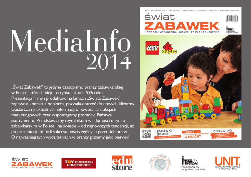 MediaInfo 2014 „Âwiat Zabawek” to jedyne czasopismo bran˝y zabawkarskiej w Polsce, które istnieje na rynku ju˝ od 1996 roku. Prezentacja firmy i produktów na ∏amach „Âwiata Zabawek” zapewnia kontakt z odbiorcà, pozwala dotrzeç do nowych klientów. Dostarczamy aktualnych informacji o nowoÊciach, akcjach marketingowych oraz wspomagamy promocje Paƒstwa asortymentu. Przedstawiamy czytelnikom wiadomoÊci o rynku zabawkarskim w Polsce i na Êwiecie – od najnowszych tendencji, a˝ po prezentacje historii sukcesu poszczególnych przedsi´biorstw. O najwa˝niejszych wydarzeniach w bran˝y piszemy jako pierwsi! Êwiat ZABAWEK NOWOÂCI | WYDARZENIA | BIZNES | PRAWO | CONSULTING TOY BUSINESS CONFERENCE Êwiat ZABAWEK NOWOÂCI Wymiary i ceny | WYDARZENIA | BIZNES | PRAWO | CONSULTING Format Rozmiar Cena O magazynie: (szerokoÊç x wysokoÊç) + 5 mm spad (czarno-bia∏y lub kolor) Cz´stotliwoÊç: miesi´cznik 460x100 mm 4 000 z∏ 2x 1/3 strony (poziom) Nak∏ad: 3500 egz. Wymiar: 230x300 mm 460x300 mm 82x300 mm (pion) 230x100 mm (poziom) 146x150 mm (pozycja naro˝na) 7 500 z∏ 2 400 z∏ Kana∏y dystrybucji: Prenumerata, sprzeda˝ w salonach prasowych, kwalifikowana wysy∏ka rotacyjna, dystrybucja na targach krajowych i zagranicznych. 1/3 strony (pion, poziom, 2 strony pozycja naro˝na) Dane techniczne: 230x300 mm 4 000 z∏ 460x75 mm 3 000 z∏ 2x 1/4 strony (poziom) 1 strona Format pliku: pdf, tiff, eps Kolor: CMYK Fonty zamienione na krzywe. Bitmapy w rozdzielczoÊci 300 dpi. Za∏àczony wydruk kolorowy: proof, cromalin, matchprint 460x150 mm 5 000 z∏ 2x 1/2 strony (poziom) 1/4 strony (pion, poziom, 66x300 mm (pion) 230x75 mm (poziom) 113x150 mm (pozycja naro˝na) 1 900 z∏ pozycja naro˝na) 113x300 mm (pion) 230x150 mm (poziom) Wydawnictwo nie ponosi odpowiedzialnoÊci za niedok∏adne odwzorowanie kolorów w momencie niedostarczenia proofu wydruku. 230x50 mm (poziom) 75x150 mm (pozycja naro˝na) 2 900 z∏ Materia∏y nale˝y przes∏aç na adres: [email protected] lub ftp.tradebizz.pl, login: qwerty, has∏o:12345 1 500 z∏ UNIT Wydawnictwo Informacje Bran˝owe Sp. z o.o. ul. Kierbedzia 4, 00-728 Warszawa 1/6 strony (poziom, pozycja 1/2 strony (pion, poziom) naro˝na) Do cen nale˝y doliczyç 23% VAT Ceny ok∏adek: I ok∏adka – 5 900 z∏ III ok∏adka – 4 400 z∏ II ok∏adka – 4 850 z∏ IV ok∏adka – 5 250 z∏ Reklama: Anna Piskorska tel. 22 320 16 04, faks 22 320 16 40 e-mail: [email protected] Êwiat Bannery reklamowe / Terminarz wydawniczy ZABAWEK NOWOÂCI | WYDARZENIA | BIZNES | PRAWO | CONSULTING Terminarz wydawniczy 2014 Bannery reklamowe Format: Rozmiar Cena za miesiàc w px. ekspozycji Cena za tydzieƒ ekspozycji Numer miesiàce Data wydania Zamówienia Materia∏y dzieƒ/miesiàc dzieƒ/miesiàc dzieƒ/miesiàc XL-banner 959x100 px 700 z∏ 175,00 z∏ 1-2 styczeƒ/luty 17.01 2.01 11.01 Fullsize 620x100 px 550 z∏ 137,50 z∏ 3 marzec 28.02 06.02 15.02 Button 322x100 px 250 z∏ 62,50 z∏ 4/5 kwiecieƒ/maj 16.04 21.03 2.04 do 30 mb 700 z∏* 175,00 z∏ 6 czerwiec 03.06 6.05 15.05 7-8 lipiec/sierpieƒ 16.07 21.06 2.07 9 wrzesieƒ 01.09 04.08 12.08 10 paêdziernik 24.10 1.10 10.10 11-12 listopad/grudzieƒ 27.11 31.10 13.11 Video Do cen nale˝y doliczyç 23% VAT * video konwertowane przez Wydawnictwo – dodatkowa op∏ata 200 z∏ Data dostarczenia: 3 dni przed planowanà publikacjà na adres: [email protected] Format plików: flash, gif, jpg Kontakt: Redakcja: Anna Wakulak e-mail: [email protected] tel. 48 22 320 15 32, fax. 48 22 32 01 640 Dzia∏ reklamy: Anna Piskorska e-mail: [email protected] tel. 48 22 32 01 604, fax 48 22 32 01 640 Prenumerata: e-mail: [email protected] tel. 48 22 32 01 666, fax 48 22 32 01 506 Êwiat ZABAWEK NOWOÂCI Terminarz wydawniczy 2014 | WYDARZENIA | BIZNES | PRAWO | CONSULTING Numer miesiàce Data wydania Zamówienia Materia∏y dzieƒ/miesiàc dzieƒ/miesiàc dzieƒ/miesiàc Tematyka 1-2 styczeƒ/luty 17.01 2.01 11.01 • Walentyntynki • Wielkanoc • zabawki drewniane • plusz 3 marzec 28.02 6.02 15.02 • modele pojazdów • klocki • zabawki interaktywne i elektroniczne 4/5 kwiecieƒ/maj 16.04 21.03 2.04 6 czerwiec 03.06 6.05 15.05 7-8 lipiec/sierpieƒ 16.07 21.06 2.07 • zabawki edukacyjne • art&craft • lalki • figurki akcji 9 wrzesieƒ 01.09 04.08 12.08 • zabawki dla dzieci do lat trzech • artykuły licencyjne • Halloween • zabawki papierowe 10 paêdziernik 24.10 1.10 10.10 • gry i puzzle • upominki • gwiazdkowe hity 11-12 listopad/grudzieƒ 27.11 31.10 13.11 • artykuły karnawałowe • instrumenty muzyczne • bi˝uteria dzieci´ca • outdoor • jeêdziki • artykuły licencyjne • Dzieƒ Dziecka • puzzle • gry planszowe, elektroniczne, karciane • ksià˝eczki dla dzieci Êwiat ZABAWEK NOWOÂCI Wydarzenia TOY BUSINESS CONFERENCE | WYDARZENIA | BIZNES | PRAWO | CONSULTING TOY Business Conference to: inspiracja, edukacja i integracja profesjonalistów z bran˝y zabawkarskiej. TOY Business Conference to czas i miejsce aby: • dowiedzieç si´ o kondycji bran˝y zabawkarskiej, • pog∏´biç wiedz´ na tematy zwiàzane z prowadzeniem biznesu, tak aby sprzedawa∏o si´ wi´cej, • wymieniç poglàdy i doÊwiadczenia z innymi przedstawicielami z bran˝y. EDU STORE warsztaty i semiarium dla profesjonalistów EDU STORE to autorski projekt edukacyjny dla profesjonalistów. Sprzeda˝, wn´trza komercyjne, nowe media, e-commerce – to główne wàtki, jakie przewijajà si´ w szkoleniach dla sklepów, hurtowni czy producentów. Adresatami sà zarówno właÊciciele jak i pracownicy. Do współpracy zapraszani sà uznani na rynku eksperci, praktycy i pasjonaci, którzy w przyst´pny sposób pokazujà rozwiàzania problemów z jakimi spotykajà si´ nasi słuchacze na co dzieƒ. Minimum teorii – maksimum praktyki – to przewodnia idea naszych warsztatów. Aktualne szkolenia mo˝na znaleêç na: www.unit.pl/oferta/szkolenia. Wirtualny Lider Bran˝owy to: konkurs 