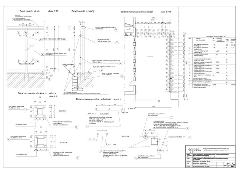 Detal barierki widok 11 skala 1:10 Detal barierki przekrój Schemat rozstawu barierek w osiach skala 1:100 poręcz: rura stalowa 100/40/2mm stal nierdzewna przykręcona do barierki poręcz-rura stalowa nierdzewna 100/40/2mm 11 9 1 9 10 3 system mocowania szkła "pająk" słupek A 80/60mm stal nierdzewna 2mm 1 1 1 7 7 4 3 7 3 1 7 3 1 1 1 7 7 3 3 3 1 1 6 9 10 3 szkło hartowane warstwowe typu VSG 8 mm szkło hartowane warstwowe typu VSG 8 mm 100cmx100cm 9 rynna ocynkowana o15 6 płytki gres wg rysunku tarasu nr 32 płytki gres 5 śruby rozporowe metalowe M 14, l=200mm 5 8 8 Detal mocowania słupków do podłoża 7 7 3 4 2 4 6 ZESTAWIENIE ELEMENTÓW 1 Poz 3 6 1 3 6 1 1 3 6 1 2 3 6 1 3 6 1 3 6 1 3 6 1 3 6 1 7 3 6 1 7 3 6 1 3 6 1 10 3 6 1 11 4 6 1 3 4 5 6 6 8 9 Profil / typ elementu słup stalowy nierdzewn 80x60x2mm słup stalowy nierdzewn 80x80x2mm mocowanie typu pająk dwuramienny mocowanie typu pająk jednoramienny dł. cm długość łączna (m) 111 22 24,42 111 1 1,11 podstawa ze stali nierdzewn 150x 150x 5mm szkło hartowane wartsw VSG 1000x1000x8mm szkło hartowane wartsw VSG 1000x1000x8mm szkło hartowane wartsw VSG 1000x1000x8mm szkło hartowane wartsw VSG 1000x1000x8mm śruby rozporowe metalowe 20 M14 mocowanie punktowe sztywne 30mm( systemowe) śruba nierdzewna systemowa rura stalowa nierdzewn 10x40x2mm mocowana do słupków systemowo wymiary ilość w osiach otworów (cm) sztuk 2273 15,7 40 11 8 23 70,6 12 75,5 2 73,6 6 78,5 2 92 88 48 1 22,73 mocowanie szkła : 8 mocowanie szkła sztywne punktowe, średnica o 30mm, skala 1: 5 Detal mocowania szkła do barierki rura stalowa nierdzewna 80x 60 mmx 2mm 1 SŁUPEK A SŁUPEK A o 14 mm śr. otworu 20 mm podstawa ze stali nierdzewnej 150x150x5mm przyspawana do barierki szkło hartowane warstwowe typu VSG 8 mm 7 mocowanie szkła : mocowanie szkła sztywne punktowe, średnica o 30mm, śruba A2 M8, podkładka POM, EPDM otwór w szkle o16, otwór przelotowy prosty np. firmy PROGLAS artykuł PTS. 20.03 8 3 rura stalowa nierdzewna 80x 80 mmx 2mm SŁUPEK B rura stalowa 80x 80x2 mm 2 o 14 mm SŁUPEK B śr. otworu 20 mm o 14 mm o 16,5 mm dwuramienne mocowanie punktowe szkła typu pająk (krzyżak) (np. firmy PROGLAS mocowanie PTS.S. 04.02) przykręcane do barierki 5 2 skala 1: 5 o 16,5 4 podstawa ze stali nierdzewnej 150x150x5mm przyspawana do barierki 5 mm jednoramienne mocowanie punktowe szkła typu pająk (krzyżak) (np. firmy PROGLAS mocowanie PTS.S. 04.01) przykręcane do barierki autorska pracownia projektowania architektury "APPA-Jan Pudło" 41-605 Świętochłowice ul. Moniuszki 3/8 tel.,fax: 0/32 245 39 61 6 szkło hartowane warstwowe typu VSG 8 mm zadanie inwestycyjne Zmiana funkcji dworca kolejowego Będzin Miasto na administracyjno-handlową wraz z pełną modernizacją budynku adres Będzin, dworzec kolejowy Będzin Miasto dz. nr 27 Projekt wykonawczy przebudowy budynku dworca kolejowego PKP w Będzinie na działce nr 27 projekt nazwa rys. Balustada na tarasie - detal branża Architektura i Konstrukcja projektował mgr inż. arch. Jan Pudło upr. proj. 482/85 sprawdził mgr inż. arch. Piotr Kózka upr. proj. 1275/94 skala: edycja 0 1:5,1:10,1:100 nr rys AB21