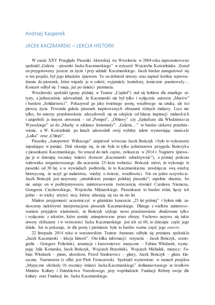 Andrzej Kasperek JACEK KACZMARSKI – LEKCJA HISTORII W czasie XXV Przeglądu Piosenki Aktorskiej we Wrocławiu w 2004 roku zaprezentowa no spektakl „Galeria – piosenki Jacka Kaczmarskiego” w reżyserii Wojciecha Kościelniaka. Został on przygotowany jeszcze za życia i przy udziale Kaczmarskiego. Jacek bardzo zaangażował się w ten projekt, był jego łabędzim śpiewem. To on dobierał utwory oraz napisał krótkie wprowadzenia do piosenek, które wiązały je w całość, wyjaśniały konteksty, ironicznie puentowały… Koncert odbył się 3 maja, już po śmierci pieśniarza. Wrocławski spektakl (grany później w Teatrze „Capitol”) stał się hołdem dla zmarłego artysty, a jednocześnie udowadniał, że Kaczmarski nie był tylko i wyłącznie autorem „Murów” i bardem „Solidarności”. Pokazywał go jako świetnego poetę, wrażliwego na sztukę, ale też piewcę życia. Powstała galeria piosenek inspirowanych obrazami różnych malarzy. Lecz nie tylko, bo autorzy przedstawienia zdecydowali się na odejście od klucza inspiracji malarskic h i uzupełnili je innymi utworami – od „Pompei”, „Obławy” czy „Epitafium dla Włodzimier za Wysockiego” aż do „Muchy w szklance lemoniady”. „Galeria…” to bardzo ciekawe przedstawienie, a W. Kościelniak po latach udowodnił swój wybitny talent wystawiając musica le „Lalka” oraz „Chłopi”. Piosenkę „Autoportret Witkacego” zaśpiewał wówczas Jacek Bończyk i było to wykonanie zapadające w pamięć. Dziś okazuje się, że nie była to tylko jednorazowa przygoda Bończyka z piosenkami Kaczmarskiego, bo wracał do nich często, zwłaszcza w 2014 r. Najpierw śpiewając je w dziesiątą rocznicę śmierci (koncert „Kaczmarski subiektywnie”), a później podczas widowiska zorganizowanego dla uczczenia 25-lecia wolności. Bończyk mówi, że wykonuje te piosenki od 30 lat, a w wywiadach podkreśla, że to Kaczmarskiemu zawdzięcza swą wiedzę historyczną, że uczył go malarstwa, wiedzy o świecie, wrażliwości. Nie on jeden oczywiśc ie. Jacek Bończyk jest nazywany „strażnikiem pamięci polskiej piosenki”; zupełnie słusznie, bo nie ustaje on w podtrzymywaniu zainteresowania twórczością również Czesława Niemena, Grzegorza Ciechowskiego, Wojciecha Młynarskiego. Piosenkarze to bardzo różni, łączy ich jedno – to wielcy artyści; tacy, którzy zdarzają się raz na sto lat. Miałem przyjemność uczestniczyć w gdańskim koncercie „25 lat później” i byłem mile zaskoczony niektórymi interpretacjami piosenek Kaczmarskiego. Dlatego z wielkim zainteresowaniem przyjąłem wiadomość, że Bończyk szykuje nowe przedstawienie zbudowane tylko i wyłącznie z tekstów, które zostały zainspirowane przez obrazy. Fachowo nazywa się takie utwory ekfrazami i w twórczości Jacka Kaczmarskiego jest ich aż 60, to dziesiąta część jego dzieła. Już to pokazuje, że dla poety i pieśniarza była to bardzo ważna część jego oeuvre. 22 listopada 2014 roku w warszawskim Teatrze Ateneum odbyła się premiera spektaklu „Jacek Kaczmarski – lekcja historii”. Oto kilka informacji: reżyseria – Jacek Bończyk, scenografia – Grzegorz Policiński, aranżacje i kierownictwo muzyczne – Fabian Włodarek, występują: Julia Konarska, Jacek Bończyk, Wojciech Brzeziński, Wojciech Michalak, muzycy: Fabian Włodarek – piano, akordeon, Paweł Stankiewicz – gitary, Jacek Bończyk – gitara klasyczna. Narratorem (z offu) jest Piotr Fronczewski. Spektakl wystawiono w ramach projektu „Muzyczne obchody 10. rocznicy śmierci Jacka Kaczmarskiego” dofinansowanego ze środków Ministra Kultury i Dziedzictwa Narodowego, przy współudziale Fundacji Róbmy swoje dla kultury oraz Fundacji im. Jacka Kaczmarskiego. Okazało się, że nie trzeba jechać do stolicy, żeby obejrzeć nowe przedstawienie, bo 13 grudnia 2014 r. dzięki staraniom obu fundacji „Lekcję historii” pokazano w Europejskim Centrum Solidarności. Piękny prezent dla miłośników twórczości autora „Wojny postu z karnawałem”. Występ poprzedził swoisty wstęp – Mirosław Baka i Klementyna Umer zaprezentowali fragment jednego z ostatnich wywiadów prasowych Kaczmarskiego, w którym mówił on o swoich piosenkach i rozumieniu zadań artysty. Chciałbym na początku zaznaczyć, że ten tekst to tylko kilka moich refleksji na temat przedstawienia, a nie recenzja. Nie robiłem notatek, nie poszedłem do ECS jako recenzent. Gdańskie przedstawienie upamiętniało rocznicę wprowadzenia stanu wojennego i dobrze się stało, że wybrano na tę okazję właśnie je. Bez martyrologii, bez rozdrapywania ran – koncert pięknych piosenek w dobrym i bardzo dobrym wykonaniu. Pewnie niektórzy spodziewali się większej ilości polityki, wspominek… Ale nic z tego. „Lekcja historii” to Kaczmarski, którego najbardziej lubię i tą częścią jego twórczości zajmuję się naukowo od kilku lat – autor mądrych piosenek o obrazach, historii, życiu. I świetny poeta, czego wielu odbiorców do dziś nie dostrzegło. Powtórzę słowa, które wypowiadam od dawna: Na odbiorze twórczości Jacka Kaczmarskiego ciągle jeszcze ciąży etykietka poety politycznego, barda Solidarności. To bardzo zawęża recepcję. Zęby krat dawno zostały wyrwane, kajdany zerwane, mury runęły. Marzenia o wolności spełniają się, a wielu z nas nie potrafi tego dostrzec. Takie wąskie odbieranie Jego twórczości jest krzywdzące dla autora „Naszej klasy”. A to, że koncert odbył się w Gdańsku jest dowodem, że miasto pamięta o twórcy, który wybrał to miejsce, żeby przeżyć tu swe ostatnie lata. Zacznę od pochwał – to jest świetne przedstawienie! Jacek Bończyk wybrał 16 utworów. Od „Pejzażu z szubienicą” z 1978 r. do „Alegorii malarstwa” napisanej rok przed śmiercią poety. Można więc mówić o dużym spektrum owej śpiewanej lekcji historii ilustrowanej obrazami. Połowa utworów 