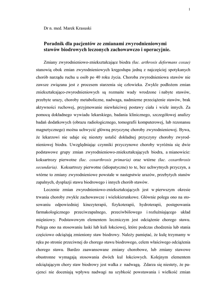 1 Dr n. med. Marek Krasuski Poradnik dla pacjentów ze zmianami zwyrodnieniowymi stawów biodrowych leczonych zachowawczo i operacyjnie. Zmiany zwyrodnieniowo-zniekształcające biodra (łac. arthrosis deformans coxae) stanowią obok zmian zwyrodnieniowych kręgosłupa jedną z najczęściej spotykanych chorób narządu ruchu u osób po 40 roku Ŝycia. Choroba zwyrodnieniowa stawów nie zawsze związana jest z procesem starzenia się człowieka. Zwykle podłoŜem zmian zniekształcająco-zwyrodnieniowych są rozmaite wady wrodzone i nabyte stawów, przebyte urazy, choroby metaboliczne, nadwaga, nadmierne przeciąŜenie stawów, brak aktywności ruchowej, przyjmowanie niewłaściwej postawy ciała i wiele innych. Za pomocą dokładnego wywiadu lekarskiego, badania klinicznego, szczegółowej analizy badań dodatkowych (obrazu radiologicznego, tomografii komputerowej, lub rezonansu magnetycznego) moŜna uchwycić główną przyczynę choroby zwyrodnieniowej. Bywa, Ŝe lekarzowi nie udaje się niestety ustalić dokładnej przyczyny choroby zwyrodnieniowej biodra. Uwzględniając czynniki przyczynowe choroby wyróŜnia się dwie podstawowe grupy zmian zwyrodnieniowo-zniekształcających biodra, a mianowicie: koksartrozy pierwotne (łac. coxarthrosis primaria) oraz wtórne (łac. coxarthrosis secundaria). Koksartrozy pierwotne (idiopatyczne) to te, bez uchwytnych przyczyn, a wtórne to zmiany zwyrodnieniowe powstałe w następstwie urazów, przebytych stanów zapalnych, dysplazji stawu biodrowego i innych chorób stawów. Leczenie zmian zwyrodnieniowo-zniekształcających jest w pierwszym okresie trwania choroby zwykle zachowawcze i wielokierunkowe. Głównie polega ono na stosowaniu odpowiedniej farmakologicznego kinezyterapii, przeciwzapalnego, fizykoterapii, hydroterapii, przeciwbólowego postępowania i rozluźniającego układ mięśniowy. Podstawowym elementem leczniczym jest odciąŜenie chorego stawu. Polega ono na stosowaniu laski lub kuli łokciowej, które podczas chodzenia lub stania częściowo odciąŜają zmieniony staw biodrowy. NaleŜy pamiętać, Ŝe kulę trzymamy w ręku po stronie przeciwnej do chorego stawu biodrowego, celem właściwego odciąŜenia chorego stawu. Bardzo zaawansowane zmiany chorobowe, lub zmiany stawowe obustronne wymagają stosowania dwóch kul łokciowych. Kolejnym elementem odciąŜającym chory staw biodrowy jest walka z nadwagą. Zdarza się niestety, Ŝe pacjenci nie doceniają wpływu nadwagi na szybkość powstawania i wielkość zmian 2 zwyrodnieniowych. W tabeli nr 1 przedstawiono krotności obciąŜenia stawu biodrowego w zaleŜności od sposobu jego obciąŜania. Jeśli stoimy na jednej nodze, wówczas biodro obciąŜane przenosi cięŜar równy 2,5 krotnej wielkości naszej wagi. ObciąŜenie stawu biodrowego w zaleŜności od sytuacji • • • • • • • krotność cięŜaru ciała stanie na jednej kończynie dolnej stanie na jednej kończynie z kulą łokciową w przeciwnej ręce stanie na dwóch kończynach stanie na dwóch kończynach ze zgiętymi kolanami i biodrami do 90° chodzenie bieganie uniesienie prostej kończyny dolnej w leŜeniu na plecach 2,5 1 0,5 1 3-5 7 - 12 1,5 Tabela 1 pokazująca obciąŜenie cięŜarem ciała stawu biodrowego w zaleŜności od pozycji w jakiej znajduje się człowiek. Sposobem na poprawienie funkcji stawu biodrowego w okresie wczesnym trwania choroby jest dobór właściwego kompleksowego leczenia. Jedną z form odciąŜenia poza korzystaniem z kuli łokciowej jest stosowanie pośrednich wyciągów za kończyny dolne, które są realizowane w odpowiednim systemie bloczkowym (Ryc.1.). Zasady budowy takiego sytemu, technikę zakładania wyciągów pośrednich za kończyny moŜna poznać w oddziale rehabilitacyjnym, by następnie stosować ten typ zabiegu w warunkach domowych. Kolejnym waŜnym elementem kinezyterapii jest stosowanie ćwiczeń poprawiających wydolność ogólną, a takŜe zakres ruchomości chorego stawu i wzmacniających siłę mięśni odpowiedzialnych za te ruchy. Ćwiczenia te realizowane są zwłaszcza w okresie bólowym w odciąŜeniu stawów, czyli w systemie podwieszek, utrzymujących w odciąŜeniu miednicę i obie kończyny dolne (Ryc.2). Zmiany zwyrodnieniowe prowadzą tez do powstawania przykurczów stawowych. W procesie usprawniania staramy się eliminować te przykurcze. 3 Ryc. 1. Wyciąg pośredni za kończyny dolne. Ryc. 2. Ćwiczenia w odciąŜeniu w systemie bloczkowym. Ryc. 3. Ćwiczenie wzmacniające mięśnie pośladkowe. 4 Zwykle w trakcie leczenia usprawniającego w warunkach oddziału rehabilitacji stosowane są zabiegi fizykalne (elektroterapia, magnetoterapia, hydroterapia, światłolecznictwo, termoterapia). Celem tych zabiegów jest działanie przeciwbólowe, rozluźniające układ mięśniowy i przeciwzapalne. Zabiegi fizykalne są elementem kompleksowego leczenia zachowawczego, przygotowującym do gimnastyki leczniczej. Uzupełnieniem leczenia usprawniającego moŜe być stosowanie leków dostawowych mających na celu spowolnienie degradacji chrząstki stawowej i ewentualne umoŜliwienie jej naprawy. Regeneracja chrząstki polega na tworzeniu w miejscu jej uszkodzenia chrząstki włóknistej (blizny), która nie ma takich samych właściwości jak chrząstka szklista. Obecnie, podejmowane są teŜ próby leczenia zmian zwyrodnieniowych przez wykonywanie jej przeszczepów, uzyskanych z hodowli odpowiednich komórek (chondrocytów). Najwłaściwsze kompleksowe postępowanie lecznicze nie zawsze prowadzi do zahamowania procesu zwyrodnieniowego stawów biodrowych. PowaŜne zmiany zwyrodnieniowe stawów biodrowych prowadzą do narastających dolegliwości bólowych, postępującego ograniczenia ruchomości w stawie i w konsekwencji zaburzenia lub braku moŜliwości chodzenia. Taka sytuacja zmusza lekarzy do wykonania operacji polegającej na usunięciu całego chorego stawu i wszczepienia w jego miejsce nowego sztucznego stawu biodrowego. Operacje wymiany