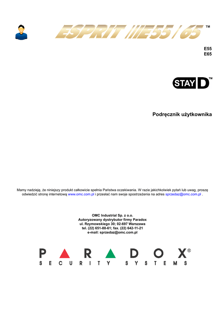 E55 E65 Podręcznik użytkownika Mamy nadzieję, że niniejszy produkt całkowicie spełnia Państwa oczekiwania. W razie jakichkolwiek pytań lub uwag, proszę odwiedzić stronę internetową www.omc.com.pl i przesłać nam swoje spostrzeżenia na adres [email protected] . OMC Industrial Sp. z o.o. Autoryzowany dystrybutor firmy Paradox ul. Rzymowskiego 30; 02-697 Warszawa tel. (22) 651-88-61; fax. (22) 642-11-21 e-mail: [email protected] Gwarancja Paradox Security Systems Ltd. („Sprzedający) gwarantuje, że przy normalnej eksploatacji jej produkty będą wolne od wszelkich wad materiałowych i wykonania przez okres jednego roku. O ile nie podano wyraźnie inaczej, niniejszym jednoznacznie wyłączone zostają wszelkie wyraźne lub dorozumiane gwarancje i rękojmie, włączając w to m.in. dorozumianą gwarancję nadawania się do sprzedaży i przydatności do określonego celu. Ponieważ Sprzedający nie instaluje i nie podłącza produktów oraz ponieważ produkty mogą być używane w połaczeniu z produktami innych producentów, Sprzedający nie może gwarantować prawidłowego działania systemu zabezpieczającego oraz nie może ponosić żadnej odpowiedzialności z tytułu niedziałania produktu. Zobowiązanie i odpowiedzialność Sprzedającego wynikająca z niniejszej gwarancji jest wyraźnie ograniczona do naprawy lub według uznania Sprzedającego wymiany produktów nie spełniających wymagań specyfikacji. Zwroty muszą zawierać dowód zakupu i mieścić się w okresie gwarancyjnym. W żadnym wypadku Sprzedający nie ponosi odpowiedzialności wobec nabywcy lub jakichkolwiek innych osób z tytułu szkód lub strat bezpośrednich, pośrednich, wtórnych lub nieprzewidzianych, włączając w to m.in. odszkodowanie z tytułu utraty zysków, kradzieży towaru lub roszczeń innych osób, spowodowanych wadami produktów lub też nieprawidłową, nieodpowiednią lub z innych powodów niewłaściwą instalacją lub eksploatacją sprzedanego towaru. Abstrahując od powyższego paragrafu, maksymalna odpowiedzialność Sprzedającego będzie ściśle ograniczona do ceny nabycia wadliwego produktu. Korzystanie z niniejszego produktu jest równoznaczne z wyrażeniem zgody na warunki niniejszej gwarancji. UWAGA: Dystrybutorzy, instalatorzy i/lub inne podmioty zajmujące się sprzedażą produktu nie są upoważnieni do zmieniania warunków niniejszej gwarancji ani też do udzielania dodatkowych gwarancji, które miałyby wiążący charakter dla Sprzedaj.cego. Ograniczenia systemów alarmowych Gorąco zachęcamy do zapoznania się i uwzględnienia treści opracowania pt. “Ograniczenia systemów alarmowych”, które jest dostępne na naszej stronie internetowej pod adresem http://paradox.com/Terms/. Ostrzeżenie dotyczące podłączania do nietradycyjnych sieci telefonicznych (np. VoIP) Urządzenia alarmowe firmy Paradox zostały zaprojektowane do efektywnej współpracy z tradycyjnymi sieciami telefonicznymi. Jeżli chodzi o tych klientów, którzy korzystają z panelu alarmowego firmy Paradox podłączonego do nietradycyjnej sieci telefonicznej, takiej jak VoIP (ang. Voice Over Internet Protocol) przekształcającej sygnał głosowy z telefonu na sygnał cyfrowy przesyłany drogą internetową, to powinni oni mieć świadomość, że ich system alarmowy może nie działać tak dobrze jak w przypadku tradycyjnych sieci telefonicznych. Na przykład, jeżli sprzęt VoIP nie posiada rezerwowego zasilania bateryjnego, awaria zasilania elektrycznego może niekorzystnie wpływać na zdolność systemu do przesyłania sygnałów do stacji centralnej, a w przypadku zerwania połączenia VoIP może nie działać funkcja monitoringu telefonicznego. Inne problemy obejmują m.in. zaniki połączenia internetowego, które mogą występować częściej niż awarie zwykłych linii telefonicznych. Dlatego też gorąco zachęcamy do przedyskutowania z firmą instalacyjną tych i innych ograniczeń towarzyszących korzystaniu z systemu alarmowego z wykorzystaniem technologii VoIP lub innej nietradycyjnej instalacji telefonicznej. Firma ta powinna być w stanie zaoferować lub polecić środki zmniejszające tego typu ryzyka oraz pomóc w ich lepszym zrozumieniu. OSTRZEŻENIA: Informacje dla użytkownika Zgodnie z Częścią 15 przepisów FCC sprzęt został przetestowany i stwierdzono, że spełnia on ograniczenia dla urządzeń cyfrowych klasy B. Celem tych ograniczeń jest zapewnienie odpowiedniej ochrony przed szkodliwymi zakłóceniami w instalacjach domowych. Sprzęt ten wytwarza, korzysta i może emitować energię o częstotliwości radiowej i jeśli nie zostanie zainstalowany i nie będzie eksploatowany zgodnie z instrukcją może wywoływać szkodliwe zakłócenia w komunikacji radiowej. Nie ma jednak gwarancji, że zakłócenia nie wystąpią w danej instalacji. Jeśli co pewien czas sprzęt wywołuje szkodliwe zakłócenia w innych urządzeniach, zachęca się użytkownika do tego, by spróbował skorygować zakłócenia podejmując jeden lub kilka z niżej wymienionych środków: (1) zmienił położenie anteny odbiorczej lub przenieść ją w inne miejsce (2) zwiększyć odstęp pomiędzy urządzeniem a odbiornikiem (3) podłączyć sprzęt do gniazda na innym obwodzie niż ten, do którego podłączy jest odbiornik lub (4) zwrócić się z prośbą o pomoc do dystrybutora lub doświadczonego technika radiowo-telewizyjnego. UWAGA: Ostrzega się użytkownika, że jakiekolwiek zmiany lub modyfikacje wyraźnie nie zatwierdzone przez Paradox Security Systems odbierają mu prawo do korzystania ze sprzętu/eksploatowania sprzętu. Nota prawna © 2004-2007 Paradox Security Systems Ltd. Wszelkie prawa zastrzeżone. Parametry techniczne mogą bez uprzedzenia ulec zmianie. Zastosowanie może mieć jedne lub więcej spośród następujących patentów amerykańskich: 6215399, 6111256, 5751803, 5721542, 5287111, 5119069, 5077549, 5920259, 5886632. Zastosowanie mog. mie. tak.e patenty kanadyjskie i m