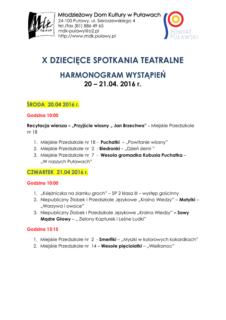 X DZIECIĘCE SPOTKANIA TEATRALNE HARMONOGRAM WYSTĄPIEŃ 20 – 21.04. 2016 r. ŚRODA 20.04 2016 r. Godzina 10:00 Recytacja wiersza – „Przyjście wiosny „ Jan Brzechwa” - Miejskie Przedszkole nr 18 1. Miejskie Przedszkole nr 18 - Puchatki – „Powitanie wiosny” 2. Miejskie Przedszkole nr 2 - Biedronki – „Dzień ziemi ” 3. Miejskie Przedszkole nr 7 - Wesoła gromadka Kubusia Puchatka – „W naszych Puławach” CZWARTEK 21.04 2016 r. Godzina 10:00 1. „Księżniczka na ziarnku groch” – SP 2 klasa III – występ gościnny 2. Niepubliczny Żłobek i Przedszkole Językowe „Kraina Wiedzy” – Motylki – „Warzywa i owoce” 3. Niepubliczny Żłobek i Przedszkole Językowe „Kraina Wiedzy” – Sowy Mądre Głowy – „ Zielony Kapturek i Leśne Ludki” Godzina 13:15 1. Miejskie Przedszkole nr 2 - Smerfiki – „Myszki w kolorowych kokardkach” 2. Miejskie Przedszkole nr 14 – Wesołe pięciolatki – „Wielkanoc”