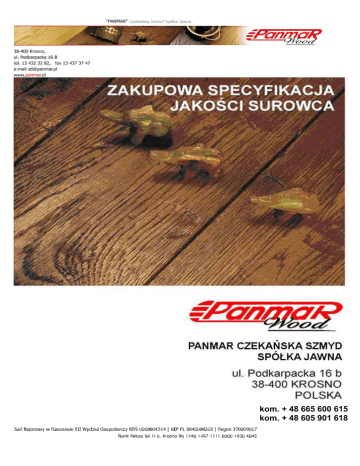 kom. + 48 665 600 615 kom. + 48 605 901 618 tel.: + 48 13 43 737 62 fax: + 48 13 43 737 47 tel./fax: + 48 13 43 232 82 www.panmar.pl e-mail: [email protected] [email protected] WARUNKI JAKOŚCIOWE NA FRYZY DĘBOWE KL I/II (A/B) Cięcie: Stan: Jakość: KLASA AB: Usłojenie fryzów powinno być w miarę proste i równoległe. Krawędzie muszą być ostrokrawężne, równolegle przycięte pod kątem prostym. Fryzy świeże bez pleśni, trocin, znaków po przekładkach i uszkodzeń powstałych podczas magazynowania. Obowiązkowe parafinowanie czół elementów. Wszystkie klasy wolne od następujących wad: kora, oblina, zakorki, pęknięcia, sęki na krawędzi i końcach, skręt włókien i ukośny przebieg włókien, biel wewnętrzny, rdzeń i materiał przyrdzeniowy, mursz, zaparzenia, plamy, grzybów (cytrynka), deformacje, szkody wyrządzone przez owady i uszkodzenia mechaniczne. Dopuszczalne są: na stronie „A” (szer. 53 mm), pojedyncze, dobrze wrośnięte, jasne, zdrowe sęki o średnicy do 5 mm, a na stronie B o średnicy do 10 mm. Na stronie lewej, zdrowy biel na całej szerokości i nie więcej niż 1/2 grubości fryzy. Sęki na bokach do 15 mm. Wszystkie sęki odsunięte od krawędzie min.10mm. UWAGA: w dostawie wymagane 30 % elementów w klasie AA Pakowanie: Wg „INSTRUKCJA UKŁADANIA ELEMENTÓW”. Kontrola jakości dostaw: Kontrola wejściowa na terenie firmy Panmar na jest przeprowadzana na 30% losowo wybranych paletach z danego ładunku. Z wybranych palet, z fryzą podajemy kontroli 100 szt., danej palety. Wynik kontroli przelicza się na całą partię. Jeżeli dostawa przekroczy założony próg, dostawa jest reklamowana i zabierana przez dostawcę na jego koszt lub przyjmowana według odrębnych uzgodnień. SPECYFIKACJA WYMIAROWA NA FRYZY DĘBOWE. Fryzy świeże 1. Wymiar cięcia: Wymiar obliczeniowy: Tolerancja: grubość - 0 + 2 szerokość - 0 + 3 długość - 0 + 5 53 x 53 x 270 ÷ 520 co 50 mm 48 x 48 x 250 – 500 co 50 mm WARUNKI JAKOŚCIOWE NA FRYZY DĘBOWE KL II/III (B/C) Cięcie: Usłojenie fryzów powinno być w miarę proste i równoległe. Krawędzie muszą być ostrokrawężne, równolegle przycięte pod kątem prostym. Stan: Fryzy świeże bez pleśni, trocin, znaków po przekładkach i uszkodzeń powstałych podczas magazynowania. Obowiązkowe parafinowanie czół elementów. Jakość: Wszystkie fryzy wolne od następujących wad: kora, oblina, zakorki, pęknięcia, sęki na krawędzi i końcach, skręt włókien i ukośny przebieg włókien, rdzeń i materiał przyrdzeniowy, mursz, zaparzenia, plamy, grzybów (cytrynka), deformacje, szkody wyrządzone przez owady i uszkodzenia mechaniczne. KLASA BC: Dopuszczalne są: pojedyncze, dobrze wrośnięte, jasne, zdrowe sęki o średnicy do 7 mm na stronie A (szer. 53 mm), a na stronie B o średnicy do 20 mm. Biel wewnętrzna zdrowa i zewnętrzna na stronie A i B bez ograniczeń. Sęki na bokach do 20 mm. Wszystkie sęki odsunięte od krawędzie min.10mm. Pakowanie: Wg „INSTRUKCJA UKŁADANIA ELEMENTÓW”. Kontrola jakości dostaw: Kontrola wejściowa na terenie firmy Panmar na jest przeprowadzana na 30% losowo wybranych paletach z danego ładunku. Z wybranych palet, z fryzą podajemy kontroli 100 szt., danej palety. Wynik kontroli przelicza się na całą partię. Jeżeli dostawa przekroczy założony próg, dostawa jest reklamowana i zabierana przez dostawcę na jego koszt lub przyjmowana według odrębnych uzgodnień. SPECYFIKACJA WYMIAROWA NA FRYZY DĘBOWE. Fryzy świeże 1. Wymiar cięcia: Wymiar obliczeniowy: Tolerancja: grubość - 0 + 2 szerokość - 0 + 3 długość - 0 + 5 53 x 53 x 270 ÷ 520 co 50 mm 48 x 48 x 250 – 500 co 50 mm WARUNKI JAKOŚCIOWE NA FRYZY DĘBOWE KL MIX (50% AB / BC) Cięcie: Usłojenie fryzów powinno być w miarę proste i równoległe. Krawędzie muszą być ostrokrawężne, równolegle przycięte pod kątem prostym. Stan: Fryzy świeże bez pleśni, trocin, znaków po przekładkach i uszkodzeń powstałych podczas magazynowania. Obowiązkowe parafinowanie czół elementów. KLASA AB: Dopuszczalne są: na stronie „A” (szer. 53 mm), pojedyncze, dobrze wrośnięte, jasne, zdrowe sęki o średnicy do 5 mm, a na stronie B o średnicy do 10 mm. Na stronie lewej, zdrowy biel na całej szerokości i nie więcej niż 1/2 grubości fryzy. Sęki na bokach do 15 mm. Wszystkie sęki odsunięte od krawędzie min.10mm. KLASA BC: Dopuszczalne są: pojedyncze, dobrze wrośnięte, jasne, zdrowe sęki o średnicy do 7 mm na stronie A (szer. 53 mm), a na stronie B o średnicy do 20 mm. Biel wewnętrzna zdrowa i zewnętrzna na stronie A i B bez ograniczeń. Sęki na bokach do 20 mm. Wszystkie sęki odsunięte od krawędzie min.10mm. Pakowanie: Wg „INSTRUKCJA UKŁADANIA ELEMENTÓW”. Kontrola jakości dostaw: Kontrola wejściowa na terenie firmy Panmar na jest przeprowadzana na 30% losowo wybranych paletach z danego ładunku. Z wybranych palet, z fryzą podajemy kontroli 100 szt., danej palety. Wynik kontroli przelicza się na całą partię. Jeżeli dostawa przekroczy założony próg, dostawa jest reklamowana i zabierana przez dostawcę na jego koszt lub przyjmowana według odrębnych uzgodnień. SPECYFIKACJA WYMIAROWA NA FRYZY DĘBOWE. Fryzy świeże 1.Wymiar cięcia: Wymiar obliczeniowy: 2.Wymiar cięcia: Wymiar obliczeniowy: Tolerancja: grubość - 0 + 2 szerokość - 0 + 3 długość - 0 + 5 38 x 53 x 270 ÷ 520 co 50 mm 34 x 48 x 250 – 500 co 50 mm 29 x 53 x 270 ÷ 520 co 50 mm 26 x 48 x 250 – 500 co 50 mm Specyfikacja wymiarowa na elementy lite w klasie AA Elementy lite świeże. Wymiar ciecia w mm Wymiar fakturowany w mm 53 x 53 x 950/1050/1150 53 x 53 x 1250 53 x 53 x 1400 53 x 53 x 1500 53 x 53 x 1600 53 x 53 x 1700 53 x 53 x 1900 53 x 53 x 2300 48 x 48 x 900/1000/1100 48 x 48 x 1200 48 x 48 x 1300 48 x 48 x 1400 48 x 48 x 1500 48 x 48 x 1600 48 x 48 x 1800 48 x 48 x 2200 Cięcie: Usłojenie fryzów powinno być w miarę proste i równoległe. Krawędzie muszą być ostr