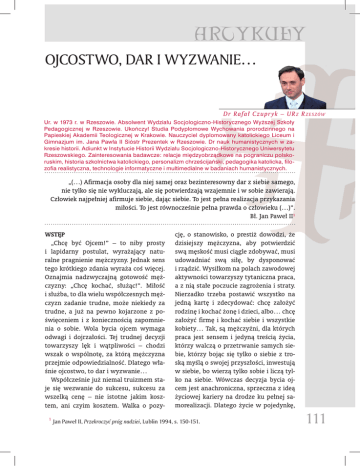 ARTYKUŁY OJCOSTWO, DAR I WYZWANIE… Dr Rafał C zupr yk – UR z R z e s z ó w Ur. w 1973 r. w Rzeszowie. Absolwent Wydziału Socjologiczno-Historycznego Wyższej Szkoły Pedagogicznej w Rzeszowie. Ukończył Studia Podyplomowe Wychowania prorodzinnego na Papieskiej Akademii Teologicznej w Krakowie. Nauczyciel dyplomowany katolickiego Liceum i Gimnazjum im. Jana Pawła II Sióstr Prezentek w Rzeszowie. Dr nauk humanistycznych w zakresie historii. Adiunkt w Instytucie Historii Wydziału Socjologiczno-Historycznego Uniwersytetu Rzeszowskiego. Zainteresowania badawcze: relacje międzyobrządkowe na pograniczu polskoruskim, historia szkolnictwa katolickiego, personalizm chrześcijański, pedagogika katolicka, filozofia realistyczna, technologie informatyczne i multimedialne w badaniach humanistycznych. „(…) Afirmacja osoby dla niej samej oraz bezinteresowny dar z siebie samego, nie tylko się nie wykluczają, ale się potwierdzają wzajemnie i w sobie zawierają. Człowiek najpełniej afirmuje siebie, dając siebie. To jest pełna realizacja przykazania miłości. To jest równocześnie pełna prawda o człowieku (…)”. Bł. Jan Paweł II1 Wstęp „Chcę być Ojcem!” – to niby prosty i lapidarny postulat, wyrażający naturalne pragnienie mężczyzny. Jednak sens tego krótkiego zdania wyraża coś więcej. Oznajmia nadzwyczajną gotowość mężczyzny: „Chcę kochać, służąc!”. Miłość i służba, to dla wielu współczesnych mężczyzn zadanie trudne, może niekiedy za trudne, a już na pewno kojarzone z poświęceniem i z koniecznością zapomnienia o sobie. Wola bycia ojcem wymaga odwagi i dojrzałości. Tej trudnej decyzji towarzyszy lęk i wątpliwości – chodzi wszak o wspólnotę, za którą mężczyzna przejmie odpowiedzialność. Dlatego właśnie ojcostwo, to dar i wyzwanie… Współcześnie już niemal truizmem staje się wezwanie do sukcesu, sukcesu za wszelką cenę – nie istotne jakim kosztem, ani czyim kosztem. Walka o pozy1 cję, o stanowisko, o prestiż dowodzi, że dzisiejszy mężczyzna, aby potwierdzić swą męskość musi ciągle zdobywać, musi udowadniać swą siłę, by dysponować i rządzić. Wysiłkom na polach zawodowej aktywności towarzyszy tytaniczna praca, a z nią stałe poczucie zagrożenia i straty. Nierzadko trzeba postawić wszystko na jedną kartę i zdecydować: chcę założyć rodzinę i kochać żonę i dzieci, albo… chcę założyć firmę i kochać siebie i wszystkie kobiety… Tak, są mężczyźni, dla których praca jest sensem i jedyną treścią życia, którzy walczą o przetrwanie samych siebie, którzy bojąc się tylko o siebie z troską myślą o swojej przyszłości, inwestują w siebie, bo wierzą tylko sobie i liczą tylko na siebie. Wówczas decyzja bycia ojcem jest anachroniczna, sprzeczna z ideą życiowej kariery na drodze ku pełnej samorealizacji. Dlatego życie w pojedynkę, Jan Paweł II, Przekroczyć próg nadziei, Lublin 1994, s. 150-151. 111 ARTICLES bez zbędnych zobowiązań, współzależności i odpowiedzialności za innych, to w opinii niektórych bardziej nowoczesne kryterium męskiego sukcesu. W tej sytuacji niechęć (lęk) przed ojcostwem, nawet duchowym, kładzie się szerokim cieniem na sercach wielu „gentlemanów z bilbordów”. Oni odnieśli sukces, zdobyli stanowisko, wywalczyli sobie pozycję i cieszą się prestiżem. Jednakże ich serce jest puste, nie potrafią kochać; są samotni, bo żyją chwilą; ukradkiem płaczą, gdyż rozpaczliwie wołają o miłość… W interesujący sposób na temat ojcostwa pisze Xavier Lacroix, który w książce Naucz mnie żyć. Esej o ojcostwie2, stawia odważne pytania: Kim jest ojciec i kto jest ojcem? Jaka jest jego tożsamość i jego rola? Autor nie daje odpowiedzi prostych i oczywistych. Zagrożone ojcostwo wymaga wszak podjęcia wielkich poszukiwań ojca, którego postać stała się współcześnie niewyraźna, nieostra i dwuznaczna. X. Lacroix ukazuje ojca jako tego, który przekazuje życie nie tylko biologiczne, ale także emocjonalne, intelektualne i duchowe. Przedstawia ojcostwo jako piękną i głęboką przygodę. Ma odwagę twierdzić, że w ostatecznym rozrachunku ojcostwo ma charakter duchowy. Podobną, inspirującą wartość przedstawiają dwie publikacje, pozornie niekorespondujące z tematyką niniejszego artykułu, niezwykle komplementarne wobec siebie, przygotowane pod redakcją O. Józefa Augustyna SJ: Duchowość kobiety i Duchowość mężczyzny3. We Wstępie do treści książki Duchowość kobiety, czytamy: „Obok wątków teologicznych, psychologicznych i eklezjalnych ważne miejsce w rozważaniach odgrywają także wątki 112 kulturowe, medialne i literackie. Zdarza się bowiem, że na duchowość kobiet, ale także i mężczyzn, więcej światła może rzucić jedno przenikliwe dzieło literackie niż wielotomowe rozważania oparte na empirycznych badaniach psychologicznych czy socjologicznych. Wbrew temu, co może sugerować tytuł książki: Duchowość kobiety, jest ona przeznaczona w jednakowej mierze tak dla kobiet, jak i dla mężczyzn. Dla kobiet może ona stanowić inspirację do odkrywania i pogłębiania kobiecej tożsamości, dla mężczyzn zaś może być okazją do refleksji nad sposobem traktowania kobiet, z którymi żyją na co dzień”4. Druga publikacja Duchowość mężczyzny, jest istotnym dopełnieniem książki Duchowość kobiety. We Wstępie czytamy: „Czytanie rozważań o męskości jedynie przez mężczyzn, z jednoczesnym unikaniem rozważań o kobiecości, jak też zainteresowanie przez kobiety jedynie własną kobiecością, przy równoczesnym lekceważeniu refleksji dotyczących męskości, owocuje egocentrycznym koncentrowaniem się na własnych pragnieniach, potrzebach i oczekiwaniach, a zaniedbaniem pragnień, potrzeb i oczekiwań płci komplementarnej. Płeć męska nie jest dla kobiet przeciwną czy nawet odmienną, ale jest płcią „dopełniającą” – „komplem