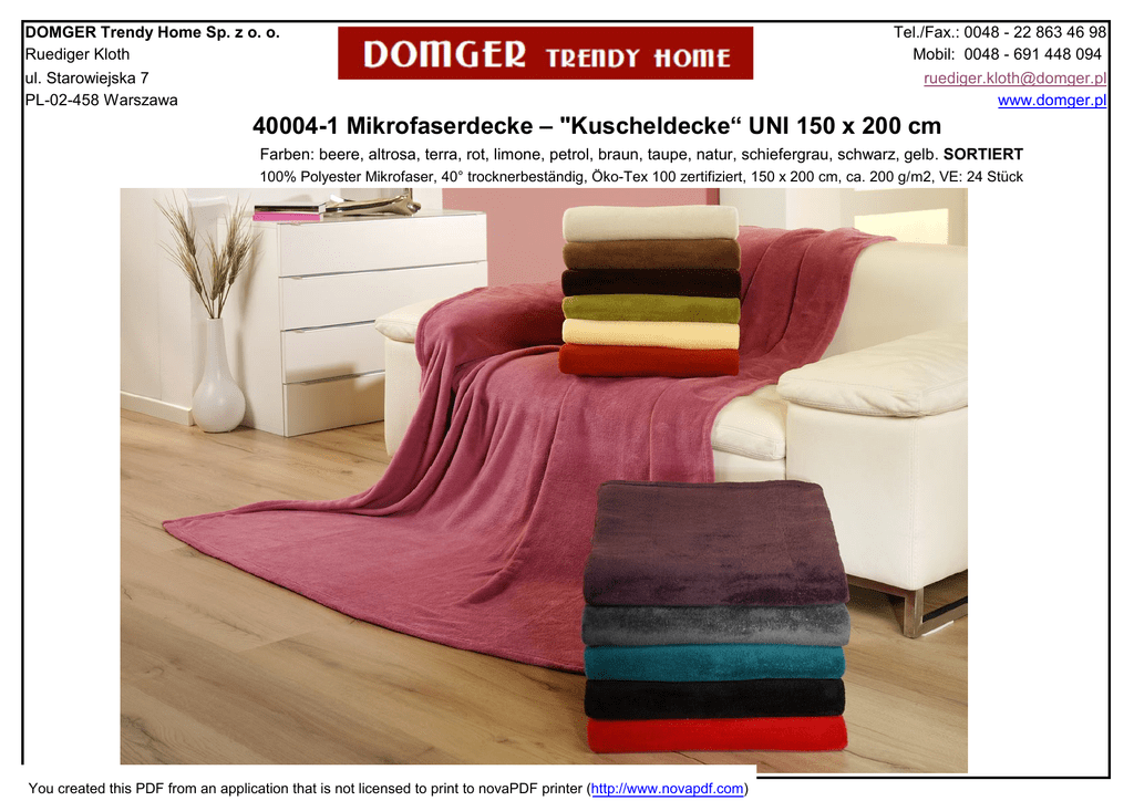 DOMGER Trendy Home Sp. z o. o. Ruediger Kloth ul. Starowiejska 7 PL-02-458 Warszawa Tel./Fax.: 0048 - 22 863 46 98 Mobil: 0048 - 691 448 094 [email protected] www.domger.pl 40004-1 Mikrofaserdecke – "Kuscheldecke“ UNI 150 x 200 cm Farben: beere, altrosa, terra, rot, limone, petrol, braun, taupe, natur, schiefergrau, schwarz, gelb. SORTIERT 100% Polyester Mikrofaser, 40° trocknerbeständig, Öko-Tex 100 zertifiziert, 150 x 200 cm, ca. 200 g/m2, VE: 24 Stück You created this PDF from an application that is not licensed to print to novaPDF printer (http://www.novapdf.com) DOMGER Trendy Home Sp. z o. o. Ruediger Kloth ul. Starowiejska 7 PL-02-458 Warszawa Tel./Fax.: 0048 - 22 863 46 98 Mobil: 0048 - 691 448 094 [email protected] www.domger.pl Mikrofaserdecke – „Memphis Premium“ UNI 150 x 200 cm, 180 x 220cm, 220 x 240cm 88769-150200 88769-180220 XXL 88769-220240 XXXL Farben: grün, orange, gelb, weiß, türkis, flieder, lila, anthrazit, creme, sand, schokolade, schwarz, bordeaux, marineblau 100% Polyester Mikrofaser, Öko-Tex 100 zertifiziert, 40° trocknerbeständig, ca. 280 g/m2, VE: 6 Stück You created this PDF from an application that is not licensed to print to novaPDF printer (http://www.novapdf.com) DOMGER Trendy Home Sp. z o. o. Tel./Fax.: 0048 - 22 863 46 98 Ruediger Kloth ul. Starowiejska 7 PL-02-458 Warszawa Mikrofaserdecke UNI in Cashmere-Feeling Mobil: 0048 - 691 448 094 [email protected] www.domger.pl Qualität, 130 x 170 cm, 180 x 220cm, 220 x 240cm + 50x50cm Farben: wollweiß, sand, taupe, schoko-braun, rot, anthrazit, schwarz, marine, terra/orange, bordeaux, limonegrün, gelb/orange, tannengrün, petrol 40024 100% Polyester Mikrofaser, Öko-Tex 100 zertifiziert, 40° trocknerbeständig, ca. 500 g/m2, VE: 4 Stück You created this PDF from an application that is not licensed to print to novaPDF printer (http://www.novapdf.com) DOMGER Trendy Home Sp. z o. o. Ruediger Kloth ul. Starowiejska 7 PL-02-458 Warszawa Tel./Fax.: 0048 - 22 863 46 98 Mobil: 0048 - 691 448 094 [email protected] www.domger.pl Mikrofaserdecke Antigua in Cashmere-Feeling Qualität, 150 x 200 cm 100% Polyester Mikrofaser 150 x 200 cm, ca. 500 g/m2 VE: 4 Stück, Farben: 2 Öko-Tex 100 zertifiziert 40° trocknerbeständig 40015-36 orange 40015-71 taupe You created this PDF from an application that is not licensed to print to novaPDF printer (http://www.novapdf.com) DOMGER Trendy Home Sp. z o. o. Ruediger Kloth ul. Starowiejska 7 PL-02-458 Warszawa Tel./Fax.: 0048 - 22 863 46 98 Mobil: 0048 - 691 448 094 [email protected] www.domger.pl Mikrofaserdecke Borneo in Cashmere-Feeling Qualität, 150 x 200 cm 100% Polyester Mikrofaser 150 x 200 cm, ca. 500 g/m2 VE: 4 Stück, Farben: 4 Öko-Tex 100 zertifiziert 40° trocknerbeständig 40017-30-kaminrot 40017-36-orange 40017-71-taupe 40017-80-limonegruen You created this PDF from an application that is not licensed to print to novaPDF printer (http://www.novapdf.com) DOMGER Trendy Home Sp. z o. o. Tel./Fax.: 0048 - 22 863 46 98 Ruediger Kloth ul. Starowiejska 7 PL-02-458 Warszawa Mobil: 0048 - 691 448 094 [email protected] www.domger.pl Mikrofaserdecke KARO in Cashmere-Feeling Qualität, 150 x 200 cm 100% Polyester Mikrofaser 150 x 200 cm, ca. 500 g/m2 VE: 4 Stück, Farben: 2 Öko-Tex 100 zertifiziert 40° trocknerbeständig 40018-36 orange 40036-51 dunkelblau You created this PDF from an application that is not licensed to print to novaPDF printer (http://www.novapdf.com) DOMGER Trendy Home Sp. z o. o. Ruediger Kloth ul. Starowiejska 7 PL-02-458 Warszawa Tel./Fax.: 0048 - 22 863 46 98 Mobil: 0048 - 691 448 094 [email protected] www.domger.pl Mikrofaserdecke "Königstiger" in Cashmere-Feeling Qualität, 150 x 200 cm 40008-72-5020 100% Polyester Mikrofaser, 150 x 200 cm, ca. 500 g/m2, VE: 4 Stück, Öko-Tex 100 zertifiziert, 40° trocknerbeständig You created this PDF from an application that is not licensed to print to novaPDF printer (http://www.novapdf.com) DOMGER Trendy Home Sp. z o. o. Ruediger Kloth ul. Starowiejska 7 PL-02-458 Warszawa Tel./Fax.: 0048 - 22 863 46 98 Mobil: 0048 - 691 448 094 [email protected] www.domger.pl Mikrofaserdecke "Leopard" in Cashmere-Feeling Qualität, 150 x 200 cm 40087-72-5020 100% Polyester Mikrofaser, 150 x 200 cm, ca. 500 g/m2, VE: 4 Stück, Öko-Tex 100 zertifiziert, 40° trocknerbeständig You created this PDF from an application that is not licensed to print to novaPDF printer (http://www.novapdf.com) DOMGER Trendy Home Sp. z o. o. Ruediger Kloth ul. Starowiejska 7 PL-02-458 Warszawa Tel./Fax.: 0048 - 22 863 46 98 Mobil: 0048 - 691 448 094 [email protected] www.domger.pl Mikrofaserdecke Missouri in Cashmere-Feeling Qualität, 150 x 200 cm 100% Polyester Mikrofaser, Öko-Tex 100 zertifiziert, 150 x 200 cm, ca. 500 g/m2, VE: 4 Stück, Farben: 4, 40° trocknerbeständig 40009-11 mais 40009-51 dunkelblau 40009-37 rot 40009-10 schoko You created this PDF from an application that is not licensed to print to novaPDF printer (http://www.novapdf.com) DOMGER Trendy Home Sp. z o. o. Ruediger Kloth ul. Starowiejska 7 PL-02-458 Warszawa Tel./Fax.: 0048 - 22 863 46 98 Mobil: 0048 - 691 448 094 [email protected] www.domger.pl Mikrofaserdecke Rainbow in Cashmere-Feeling Qualität, 150 x 200 cm 100% Polyester Mikrofaser 40005 150 x 200 cm, ca. 500 g/m2 VE: 4 Stück, Farben: 6 Öko-Tex 100 zertifiziert, 40° trocknerbeständig You created this PDF from an application that is not licensed to print to novaPDF printer (http://www.novapdf.com) DOMGER Trendy Home Sp. z o. o. Ruediger Kloth ul. Starowiejska 7 PL-02-458 Warszawa Tel./Fax.: 0048 - 22 863 46 98 Mobil: 0048 - 691 448 094 [email protected] www.domger.pl Mikrofaserdecke "Schneeleopard" in Cashmere-Feeling Qualität, 150 x 200 cm 40087-90-5020 100% Polyester Mikrofaser, 150 x 200 cm, ca. 500 g/m2, VE: 4 Stück, Öko-Tex 100 zertifiziert, 40° trocknerbeständig You created this PDF from an application that is not licensed to print to novaPDF printer (http://www.novapdf.com) DOMGER