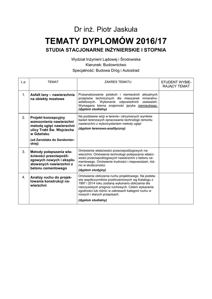 Dr inż. Piotr Jaskuła TEMATY DYPLOMÓW 2016/17 STUDIA STACJONARNE INŻYNIERSKIE I STOPNIA Wydział Inżynierii Lądowej i Środowiska Kierunek: Budownictwo Specjalność: Budowa Dróg i Autostrad L.p. TEMAT ZAKRES TEMATU 1. Asfalt lany – nawierzchnia na obiekty mostowe Przeanalizowanie polskich i niemieckich aktualnych przepisów technicznych dla mieszanek mineralnoasfaltowych. Wykonanie odpowiednich zestawień. Wymagana bierna znajomość języka niemieckiego. (dyplom studialny) 2. Projekt koncepcyjny wzmocnienia nawierzchni metodą ugięć nawierzchni ulicy Trakt Św. Wojciecha w Gdańsku Na podstawie wizji w terenie i otrzymanych wyników badań terenowych opracowanie technologii remontu nawierzchni z wykorzystaniem metody ugięć (dyplom terenowo-analityczny) (od Zaroślaka do Sandomierskiej) 3. Metody polepszania właściwości przeciwpoślizgowych nowych i eksploatowanych nawierzchni z betonu cementowego Omówienie właściwości przeciwpoślizgowych nawierzchni. Omówienie technologii polepszania właściwości przeciwpoślizgowych nawierzchni z betonu cementowego. Omówienie trudności i niepowodzeń, różnic w skuteczności. (dyplom studyjny) 4. Analizy ruchu do projektowania konstrukcji nawierzchni Omówienie obliczenia ruchu projektowego. Na podstawie współczynników przeliczeniowych wg Katalogu z 1997 i 2014 roku zostaną wykonano obliczenia dla rzeczywistych prognoz ruchowych. Celem wykazanie zgodności lub różnic w zakresach kategorii ruchu w nowych i starych przepisach. (dyplom studialny) STUDENT WYBIERAJĄCY TEMAT Doc. dr inż. Jacek Alenowicz TEMATY DYPLOMÓW 2016/17 STUDIA STACJONARNE INŻYNIERSKIE I STOPNIA Wydział Inżynierii Lądowej i Środowiska Kierunek: Budownictwo Specjalność: Budowa Dróg i Autostrad L.p. TEMAT ZAKRES TEMATU 1. Projekt wzmocnienia geosyntetykiem typowych konstrukcji dolnych warstw nawierzchni. Praca o charakterze studialnym i obliczeniowym. Wpływ wzmocnienia geosyntetykiem na nośność warstw nawierzchni. Omówienie zasad obliczania nośności warstw z materiału niezwiązanego, wzmocnionego geosyntetykiem. Obliczenia typowych, katalogowych układów dolnych warstw konstrukcji nawierzchni wzmocnionych geosyntetykiem. Analiza i wnioski. 2. Projektowanie i wykonawstwo dyblowania szczelin w drogowych nawierzchniach z betonu cementowego. Praca o charakterze studialnym i obliczeniowym. Zasady stosowania dybli w nawierzchniach betonowych. Projektowanie układu dybli w szczelinie poprzecznej. Wykonanie dyblowania – zasady, kontrola. Skutki błędów w projektowaniu i wykonawstwie. Podsumowanie i wnioski. Wskazana bierna znajomość języka angielskiego. 3. Remont zniszczonych nawierzchni asfaltowych z zastosowaniem nakładki z betonu cementowego. Praca o charakterze studialnym. Zasady ogólne technologii „whitetopping”, podział technologii. Warunki stosowania i kryteria oceny przydatności. Projektowanie. Wymagania materiałowe. Wady i zalety. Wnioski. Konieczna bierna znajomość języka angielskiego. 4. Porównanie oceny mrozoodporności konstrukcji nawierzchni drogowych w wybranych krajach. Praca o charakterze studialnym i obliczeniowym. Krótkie omówienie zjawiska wysadzinowości gruntów. Stosowane sposoby eliminacji lub ograniczenia wysadzin w nawierzchniach drogowych. Porównanie zasad projektowania mrozoodpornych nawierzchni. obowiązujących w Polsce i w wybranych krajach. Przykłady obliczeniowe. 5. Projekt nawierzchni drogowych z warstwą ścieralną z małowymiarowych elementów betonowych. Praca o charakterze studialnym i obliczeniowym Omówienie metod obliczeniowych, stosowanych w obliczeniach nośności nawierzchni kostkowych. Zastosowanie metod w obliczeniach konstrukcji nawierzchni dla ruchu od KR1 do KR7. Analiza wyników i propozycja konstrukcji. Wskazana bierna znajomość języka angielskiego. 6. Zastosowanie geokompozytów drenażowych w budowie dróg. Praca o charakterze studialnym. Charakterystyka kompozytów drenażowych stosowanych w budowie dróg. Omówienie sytuacji umożliwiających zastosowanie geokompozytów drenażowych. Zalety i ograniczenia rozwiązań z geokompozytami. Podsumowanie. Konieczna bierna znajomość języka angielskiego STUDENT WYBIERAJĄCY TEMAT 7. Nawierzchnie przepuszczalne z kostki betonowej z systemem magazynowania i rozsączania wody w budowie nawierzchni placów i parkingów. Praca o charakterze studialnym i obliczeniowym. Przegląd rozwiązań przepuszczalnych nawierzchni z kostki betonowej. Przykładowe systemy magazynowania wody opadowej. Omówienie zasad projektowania przejęcia, magazynowania i rozsączania wody w nawierzchni placu lub parkingu. Przykład obliczeniowy. Wskazana bierna znajomość języka angielskiego. Dr inż. Bohdan Dołżycki TEMATY DYPLOMÓW 2016/17 STUDIA STACJONARNE INŻYNIERSKIE I STOPNIA Wydział Inżynierii Lądowej i Środowiska Kierunek: Budownictwo Specjalność: Budowa Dróg i Autostrad L.p. 1. 2. TEMAT Asfalt spieniony w przebudowie dróg lokalnych. Remixing plus w naprawach dróg lokalnych ZAKRES TEMATU Praca o charakterze studialnym i projektowym. Należy opisać technologię recyklingu na zimno z zastosowaniem asfaltu spienionego. Należy podać zasady wykonywania tej technologii. Podać kiedy warto ją zastosować a kiedy nie ma takiej możliwości. W drugim etapie należy ocenić kilka wybranych odcinków dróg i określić czy ta technologia będzie miała tam zastosowanie czy też nie. Praca o charakterze studialnym i projektowym. Należy opisać technologię recyklingu powierzchniowego na gorąco jakim jest remixing plus. Należy podać zasady wykonywania tej technologii. Podać kiedy warto ją zastosować a kiedy nie ma takiej możliwości. W drugim etapie należy ocenić kilka wybranych odcinków dróg i określić czy ta technologia będzie miała tam zastosowanie czy też nie. 3. Kompozyty w budowie i przebudowie dróg Praca o charakterze studialnym i projektowym. Należy opisać co to są kompozyty, do czego się je stosuje, jak 