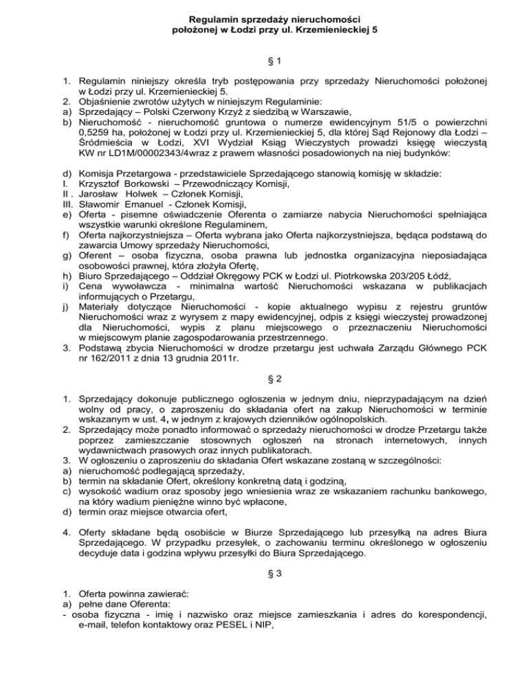 Regulamin sprzedaży nieruchomości położonej w Łodzi przy ul. Krzemienieckiej 5 §1 1. Regulamin niniejszy określa tryb postępowania przy sprzedaży Nieruchomości położonej w Łodzi przy ul. Krzemienieckiej 5. 2. Objaśnienie zwrotów użytych w niniejszym Regulaminie: a) Sprzedający – Polski Czerwony Krzyż z siedzibą w Warszawie, b) Nieruchomość - nieruchomość gruntowa o numerze ewidencyjnym 51/5 o powierzchni 0,5259 ha, położonej w Łodzi przy ul. Krzemienieckiej 5, dla której Sąd Rejonowy dla Łodzi – Śródmieścia w Łodzi, XVI Wydział Ksiąg Wieczystych prowadzi księgę wieczystą KW nr LD1M/00002343/4wraz z prawem własności posadowionych na niej budynków: d) I. II . III. e) f) g) h) i) j) 3. Komisja Przetargowa - przedstawiciele Sprzedającego stanowią komisję w składzie: Krzysztof Borkowski – Przewodniczący Komisji, Jarosław Holwek – Członek Komisji, Sławomir Emanuel - Członek Komisji, Oferta - pisemne oświadczenie Oferenta o zamiarze nabycia Nieruchomości spełniająca wszystkie warunki określone Regulaminem, Oferta najkorzystniejsza – Oferta wybrana jako Oferta najkorzystniejsza, będąca podstawą do zawarcia Umowy sprzedaży Nieruchomości, Oferent – osoba fizyczna, osoba prawna lub jednostka organizacyjna nieposiadająca osobowości prawnej, która złożyła Ofertę, Biuro Sprzedającego – Oddział Okręgowy PCK w Łodzi ul. Piotrkowska 203/205 Łódź, Cena wywoławcza - minimalna wartość Nieruchomości wskazana w publikacjach informujących o Przetargu, Materiały dotyczące Nieruchomości - kopie aktualnego wypisu z rejestru gruntów Nieruchomości wraz z wyrysem z mapy ewidencyjnej, odpis z księgi wieczystej prowadzonej dla Nieruchomości, wypis z planu miejscowego o przeznaczeniu Nieruchomości w miejscowym planie zagospodarowania przestrzennego. Podstawą zbycia Nieruchomości w drodze przetargu jest uchwała Zarządu Głównego PCK nr 162/2011 z dnia 13 grudnia 2011r. §2 1. Sprzedający dokonuje publicznego ogłoszenia w jednym dniu, nieprzypadającym na dzień wolny od pracy, o zaproszeniu do składania ofert na zakup Nieruchomości w terminie wskazanym w ust. 4, w jednym z krajowych dzienników ogólnopolskich. 2. Sprzedający może ponadto informować o sprzedaży nieruchomości w drodze Przetargu także poprzez zamieszczanie stosownych ogłoszeń na stronach internetowych, innych wydawnictwach prasowych oraz innych publikatorach. 3. W ogłoszeniu o zaproszeniu do składania Ofert wskazane zostaną w szczególności: a) nieruchomość podlegającą sprzedaży, b) termin na składanie Ofert, określony konkretną datą i godziną, c) wysokość wadium oraz sposoby jego wniesienia wraz ze wskazaniem rachunku bankowego, na który wadium pieniężne winno być wpłacone, d) termin oraz miejsce otwarcia ofert, 4. Oferty składane będą osobiście w Biurze Sprzedającego lub przesyłką na adres Biura Sprzedającego. W przypadku przesyłek, o zachowaniu terminu określonego w ogłoszeniu decyduje data i godzina wpływu przesyłki do Biura Sprzedającego. §3 1. Oferta powinna zawierać: a) pełne dane Oferenta: - osoba fizyczna - imię i nazwisko oraz miejsce zamieszkania i adres do korespondencji, e-mail, telefon kontaktowy oraz PESEL i NIP, - b) c) d) e) f) 2. a) b) c) d) e) f) g) 3. 4. 5. 6. 7. 8. przedsiębiorca będący osobą fizyczną prowadzącą działalność gospodarczą - imię i nazwisko oraz miejsce zamieszkania i adres do korespondencji, nawę firmy, nr wpisu do ewidencji działalności gospodarczej, nazwę organu prowadzącego ewidencję, e-mail, telefon kontaktowy oraz PESEL, NIP, REGON, jednostka organizacyjna nieposiadająca osobowości prawnej - dane wspólników (dla osób fizycznych, przedsiębiorców będących osobami fizycznymi, osoby prawnej wg wytycznych z niniejszego punktu), NIP, REGON osoba prawna - firmę, siedzibę i adres do korespondencji, e-mail, telefon kontaktowy oraz NIP i REGON, nr KRS; datę sporządzenia Oferty, określenie przedmiotu sprzedaży, którego dotyczy Oferta, proponowaną cenę nabycia Nieruchomości, nie niższą od ceny wywoławczej, wskazanie okresu związania Ofertą, nie krótszego niż 3 miesiące. wskazanie innej niż organ upoważniony do reprezentowania Oferenta osoby (osób) upoważnionych do kontaktów w sprawie Oferty i podstaw jej umocowania. Do Oferty należy dołączyć: oryginał dokumentu potwierdzający wniesienie Wadium, dokumenty określające status prawny Oferenta oraz sposób jego reprezentacji, oświadczenie Oferenta zawierające informacje, czy oferent jest cudzoziemcem w rozumieniu przepisów ustawy z dnia 24 marca 1920 r. wraz z późniejszymi zmianami o nabywaniu nieruchomości przez cudzoziemców, w przypadku osób prawnych - oświadczenie Oferenta, że do dokonania nabycia Nieruchomości nie jest wymagana zgoda jakiegokolwiek organu tej osoby prawnej lub gdy taka zgoda jakiegokolwiek organu tej osoby prawnej jest wymagana – dokument zawierający zgodę na dokonanie nabycia Nieruchomości albo oświadczenie Oferenta, że wymagane zgody zostaną przedłożone przed terminem wyznaczonym do zawarcia Umowy sprzedaży w formie aktu notarialnego, pod rygorem uznania nie dopełnienia tego obowiązku za przyczynę nie zawarcia Umowy sprzedaży z przyczyn dotyczących Oferenta, ze skutkiem opisanym w § 4 ust. 7 Regulaminu, w przypadku osoby fizycznej lub przedsiębiorcy będącego osobą fizyczną prowadzącą działalność gospodarczą lub jednostki organizacyjnej nieposiadającej osobowości prawnej, w której chociaż jeden wspólnik jest osobą fizyczną lub przedsiębiorcą będącym osobą fizyczną prowadzącą działalność gospodarczą - oświadczenie, że Oferent lub wspólnik nie pozostaje w związku małżeńskim, a jeżeli Oferent pozostaje w związku małżeńskim, dokument zawierający zgodę współmałżonka na dokonanie nabycia Nieruchomości, w formie pisemnej z podpisem poświadczonym notarialnie lub oświadczenie Ofere