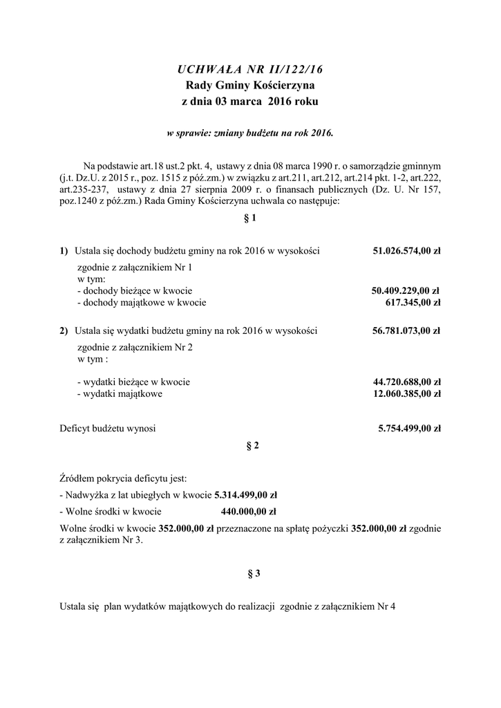 UCHWAŁA NR II/122/16 Rady Gminy Kościerzyna z dnia 03 marca 2016 roku w sprawie: zmiany budżetu na rok 2016. Na podstawie art.18 ust.2 pkt. 4, ustawy z dnia 08 marca 1990 r. o samorządzie gminnym (j.t. Dz.U. z 2015 r., poz. 1515 z póź.zm.) w związku z art.211, art.212, art.214 pkt. 1-2, art.222, art.235-237, ustawy z dnia 27 sierpnia 2009 r. o finansach publicznych (Dz. U. Nr 157, poz.1240 z póź.zm.) Rada Gminy Kościerzyna uchwala co następuje: §1 1) Ustala się dochody budżetu gminy na rok 2016 w wysokości zgodnie z załącznikiem Nr 1 w tym: - dochody bieżące w kwocie - dochody majątkowe w kwocie 51.026.574,00 zł 50.409.229,00 zł 617.345,00 zł 2) Ustala się wydatki budżetu gminy na rok 2016 w wysokości 56.781.073,00 zł zgodnie z załącznikiem Nr 2 w tym : - wydatki bieżące w kwocie - wydatki majątkowe 44.720.688,00 zł 12.060.385,00 zł Deficyt budżetu wynosi 5.754.499,00 zł §2 Źródłem pokrycia deficytu jest: - Nadwyżka z lat ubiegłych w kwocie 5.314.499,00 zł - Wolne środki w kwocie 440.000,00 zł Wolne środki w kwocie 352.000,00 zł przeznaczone na spłatę pożyczki 352.000,00 zł zgodnie z załącznikiem Nr 3. §3 Ustala się plan wydatków majątkowych do realizacji zgodnie z załącznikiem Nr 4 §4 Ustala się dochody i wydatki na zadania zlecone administracji rządowej zgodnie z załącznikiem Nr 5A i 5B. §5 Ustala się dotacje celowe na zadania własne gminy zgodnie z załącznikiem Nr 6 §6 Uchwała wchodzi w życie z dniem podjęcia Przewodniczący Rady Gminy Andrzej Bober