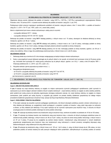 Załącznik nr 4 OBJAŚNIENIA DO DEKLARACJI DLA PODATKU OD TOWARÓW I USŁUG (VAT-7, VAT-7K i VAT-7D) Objaśnienia dotyczą wzorów deklaracji dla podatku od towarów i usług (VAT-7(15), VAT-7K(9) i VAT-7D(6)) wprowadzonych rozporządzeniem Ministra Finansów z dnia 18 czerwca 2015 r. w sprawie wzorów deklaracji dla podatku od towarów i usług (Dz. U. poz. 914). Podstawowym aktem prawnym regulującym opodatkowanie podatkiem od towarów i usług jest ustawa z dnia 11 marca 2004 r. o podatku od towarów i usług (Dz. U. z 2011 r. Nr 177, poz. 1054, z późn. zm.), zwana dalej „ustawą”. Ilekroć w objaśnieniach jest mowa o okresie rozliczeniowym, należy przez to rozumieć: - w przypadku deklaracji VAT-7 - miesiąc, - w przypadku deklaracji VAT-7K i VAT-7D - kwartał. Deklaracje dla podatku od towarów i usług VAT-7 składają podatnicy, o których mowa w art. 15 ustawy, obowiązani do składania deklaracji za okresy miesięczne, zgodnie z art. 99 ust. 1 ustawy. Deklaracje dla podatku od towarów i usług VAT-7K składają mali podatnicy, o których mowa w art. 2 pkt 25 ustawy, rozliczający podatek za okresy kwartalne, zgodnie z art. 99 ust. 2 lub 3 ustawy, niemający obowiązku płacenia zaliczek na podatek za okresy miesięczne. Deklaracje dla podatku od towarów i usług VAT-7D składają podatnicy inni niż mali, rozliczający podatek za okresy kwartalne, zgodnie z art. 99 ust. 3 ustawy oraz podatnicy, którzy w ciągu roku podatkowego przekroczą kwoty, o których mowa w art. 2 pkt 25 ustawy. OBJAŚNIENIA OGÓLNE 1. Deklarację składa się w terminie do 25. dnia miesiąca następującego po każdym kolejnym okresie rozliczeniowym. 2. Kwoty z poszczególnych pozycji deklaracji zaokrągla się do pełnych złotych w ten sposób, że końcówki kwot wynoszące mniej niż 50 groszy pomija się, a końcówki kwot wynoszące 50 i więcej groszy podwyższa się do pełnych złotych, zgodnie z art. 63 § 1 ustawy z dnia 29 sierpnia 1997 r. Ordynacja podatkowa (Dz. U. z 2015 r. poz. 613, z późn. zm.). 3. Wszystkie wielkości ujemne poprzedza się znakiem minus ( - ). 4. Niewypełnienie którejkolwiek pozycji: - od 10 do 58 w przypadku deklaracji dla podatku od towarów i usług VAT-7 lub VAT-7K, - od 10 do 64 w przypadku deklaracji dla podatku od towarów i usług VAT-7D jest równoznaczne z wpisaniem zera (0). I . OB J A Ś N I EN I A D O D E K L A R A C J I D L A P OD A T K U OD T O WA R Ó W I U SŁ U G ( VA T - 7 i VA T - 7 K ) OBJAŚNIENIA SZCZEGÓŁOWE Część A. MIEJSCE SKŁADANIA DEKLARACJI W poz. 6 wpisuje się urząd skarbowy właściwy ze względu na miejsce wykonywania czynności podlegających opodatkowaniu; jeżeli czynności te wykonywane są na terenie objętym zakresem działania różnych urzędów skarbowych - urząd skarbowy właściwy ze względu na adres siedziby podatnika, jeżeli podatnik jest osobą prawną lub jednostką organizacyjną niemającą osobowości prawnej, lub urząd skarbowy właściwy ze względu na miejsce zamieszkania, jeżeli podatnik jest osobą fizyczną; w przypadku gdy podatnik nie posiada siedziby działalności gospodarczej lub stałego miejsca prowadzenia działalności gospodarczej na terytorium kraju, wpisuje się Drugi Urząd Skarbowy Warszawa-Śródmieście. Część C. ROZLICZENIE PODATKU NALEŻNEGO 1. W tej części wykazuje się wszystkie czynności podlegające opodatkowaniu, dla których obowiązek podatkowy powstał w okresie rozliczeniowym, za który składana jest deklaracja, po uwzględnieniu korekt wynikających z przepisów o podatku od towarów i usług, jeżeli mają wpływ na rozliczenie w okresie, za który składana jest deklaracja. W tej części wykazuje się też czynności wykonywane poza terytorium kraju, w stosunku do których przysługuje prawo do obniżenia podatku należnego lub zwrotu podatku naliczonego. 2. W poz. 10 wykazuje się dostawę towarów oraz świadczenie usług na terytorium kraju, zwolnione od podatku na podstawie art. 43 lub art. 82 ustawy. 3. W poz. 11 wykazuje się dostawę towarów oraz świadczenie usług poza terytorium kraju, w stosunku do których przysługuje podatnikowi prawo do obniżenia kwoty podatku należnego, o którym mowa w art. 86 ust. 8 pkt 1 ustawy, lub prawo do zwrotu kwoty podatku naliczonego, o którym mowa w art. 87 ust. 5 ustawy. W pozycji tej nie uwzględnia się wartości dostaw towarów i świadczonych usług dokonywanych w ramach działalności gospodarczej zarejestrowanej poza terytorium kraju oraz świadczonych usług rozliczanych w ramach procedury szczególnej dotyczącej usług telekomunikacyjnych, usług nadawczych lub usług elektronicznych. 4. W poz. 12 wykazuje się świadczenie usług, o których mowa w art. 100 ust. 1 pkt 4 ustawy, tj. usług, do których stosuje się art. 28b ustawy, na rzecz podatników podatku od wartości dodanej lub osób prawnych niebędących takimi podatnikami, zidentyfikowanych na potrzeby podatku od wartości 2 dodanej, świadczonych na terytorium państwa członkowskiego innym niż terytorium kraju, innych niż zwolnionych od podatku od wartości dodanej lub opodatkowanych stawką 0%, dla których zobowiązanym do zapłaty podatku od wartości dodanej jest usługobiorca. 5. W wierszu 4 „Dostawa towarów oraz świadczenie usług na terytorium kraju, opodatkowane stawką 3% albo 5%” w poz. 15 wykazuje się podstawę opodatkowania transakcji opodatkowanych stawką, o której mowa w art. 41 ust. 2a ustawy (od dnia 1 stycznia 2011 r. jest to stawka w wysokości 5%), a w poz. 16 wykazuje się podatek należny od tych transakcji. W wierszu tym wykazuje się również transakcje opodatkowane wg stawki 3% (podstawa opodatkowania i podatek należny), jeżeli w okresie rozliczeniowym, za który składana jest deklaracja, wystąpił taki przypadek, a także uwzględniane są korekty takich transakcji, jeżeli mają wpływ na rozliczenie podatku należnego w okresie, za który składana jest deklaracja. 6. W wierszu 5 „Dostawa