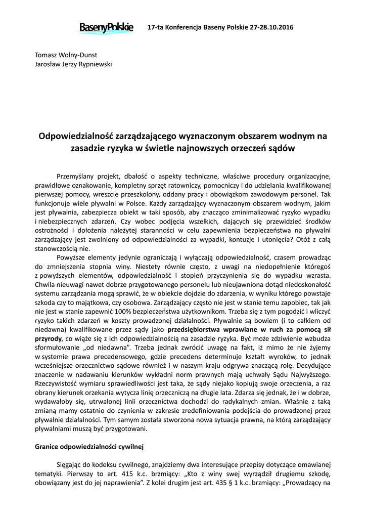 17-ta Konferencja Baseny Polskie 27-28.10.2016 Tomasz Wolny-Dunst Jarosław Jerzy Rypniewski Odpowiedzialność zarządzającego wyznaczonym obszarem wodnym na zasadzie ryzyka w świetle najnowszych orzeczeń sądów Przemyślany projekt, dbałość o aspekty techniczne, właściwe procedury organizacyjne, prawidłowe oznakowanie, kompletny sprzęt ratowniczy, pomocniczy i do udzielania kwalifikowanej pierwszej pomocy, wreszcie przeszkolony, oddany pracy i obowiązkom zawodowym personel. Tak funkcjonuje wiele pływalni w Polsce. Każdy zarządzający wyznaczonym obszarem wodnym, jakim jest pływalnia, zabezpiecza obiekt w taki sposób, aby znacząco zminimalizować ryzyko wypadku i niebezpiecznych zdarzeń. Czy wobec podjęcia wszelkich, dających się przewidzieć środków ostrożności i dołożenia należytej staranności w celu zapewnienia bezpieczeństwa na pływalni zarządzający jest zwolniony od odpowiedzialności za wypadki, kontuzje i utonięcia? Otóż z całą stanowczością nie. Powyższe elementy jedynie ograniczają i wyłączają odpowiedzialność, czasem prowadząc do zmniejszenia stopnia winy. Niestety równie często, z uwagi na niedopełnienie któregoś z powyższych elementów, odpowiedzialność i stopień przyczynienia się do wypadku wzrasta. Chwila nieuwagi nawet dobrze przygotowanego personelu lub nieujawniona dotąd niedoskonałość systemu zarządzania mogą sprawić, że w obiekcie dojdzie do zdarzenia, w wyniku którego powstaje szkoda czy to majątkowa, czy osobowa. Zarządzający często nie jest w stanie temu zapobiec, tak jak nie jest w stanie zapewnić 100% bezpieczeństwa użytkownikom. Trzeba się z tym pogodzić i wliczyć ryzyko takich zdarzeń w koszty prowadzonej działalności. Pływalnie są bowiem (i to całkiem od niedawna) kwalifikowane przez sądy jako przedsiębiorstwa wprawiane w ruch za pomocą sił przyrody, co wiąże się z ich odpowiedzialnością na zasadzie ryzyka. Być może zdziwienie wzbudza sformułowanie „od niedawna”. Trzeba jednak zwrócić uwagę na fakt, iż mimo że nie żyjemy w systemie prawa precedensowego, gdzie precedens determinuje kształt wyroków, to jednak wcześniejsze orzecznictwo sądowe również i w naszym kraju odgrywa znaczącą rolę. Decydujące znaczenie w nadawaniu kierunków wykładni norm prawnych mają uchwały Sądu Najwyższego. Rzeczywistość wymiaru sprawiedliwości jest taka, że sądy niejako kopiują swoje orzeczenia, a raz obrany kierunek orzekania wytycza linię orzeczniczą na długie lata. Zdarza się jednak, że i w dobrze, wydawałoby się, utrwalonej linii orzecznictwa dochodzi do radykalnych zmian. Właśnie z taką zmianą mamy ostatnio do czynienia w zakresie zredefiniowania podejścia do prowadzonej przez pływalnie działalności. Tym samym została stworzona nowa sytuacja prawna, na którą zarządzający pływalniami muszą być przygotowani. Granice odpowiedzialności cywilnej Sięgając do kodeksu cywilnego, znajdziemy dwa interesujące przepisy dotyczące omawianej tematyki. Pierwszy to art. 415 k.c. brzmiący: „Kto z winy swej wyrządził drugiemu szkodę, obowiązany jest do jej naprawienia”. Z kolei drugim jest art. 435 § 1 k.c. brzmiący: „Prowadzący na 17-ta Konferencja Baseny Polskie 27-28.10.2016 własny rachunek przedsiębiorstwo lub zakład wprawiany w ruch za pomocą sił przyrody (pary, gazu, elektryczności, paliw płynnych itp.) ponosi odpowiedzialność za szkodę na osobie lub mieniu, wyrządzoną komukolwiek przez ruch przedsiębiorstwa lub zakładu, chyba że szkoda nastąpiła wskutek siły wyższej albo wyłącznie z winy poszkodowanego lub osoby trzeciej, za którą nie ponosi odpowiedzialności”. Te dwa artykuły kodeksu cywilnego zakreślają granice odpowiedzialności cywilnej pływalni wobec ich użytkowników. Na czym polega owo rozróżnienie? W skrócie (zainteresowanych zgłębieniem tematu odsyłamy do publikacji prawniczych) w prawie cywilnym odpowiedzialność można ponosić na zasadzie winy lub na zasadzie ryzyka. Odpowiedzialność na zasadzie winy Odnosząc zakres odpowiedzialność do winy, przytoczyć należy właśnie art. 415 k.c. Bez zbędnej analizy przepisu wykazać można, że owa odpowiedzialność wymaga wykazania winy ze strony zarządzającego pływalnią. Winę można ująć w znaczeniu obiektywnym, jako uznane za zawinione zachowania niezgodne z przepisami prawa lub określonymi zasadami, lub w ujęciu subiektywnym, jako uznane za zawinione zachowania rozmyślnie wyrządzające szkodę oraz niedbalstwo prowadzące do wyrządzenia szkody. W komentowanym przepisie określona jest więc ogólna reguła odpowiedzialności za szkodę, do której doszło wskutek zdarzeń nazywanych czynami niedozwolonymi. Jest to tzw. odpowiedzialność deliktowa, która może z kolei być przypisywana podmiotom za zachowania zawinione, jak i niezawinione, a także za zdarzenia niebędące czynami tych podmiotów, których odpowiedzialność została w jakimś stopniu uzasadniona. W zakresie udowodnienia winy należy wykazać, że istnieją przesłanki odpowiedzialności, tj. musi zaistnieć zdarzenie, z którym system prawny wiąże odpowiedzialność na określonej zasadzie, i musi wystąpić związek przyczynowo-skutkowy pomiędzy owym zdarzeniem a doznaną szkodą. Do niedawna sądy w Polsce w przeważającej mierze oceniały wypadki na pływalniach właśnie w ujęciu winy. Badały wskazane przesłanki odpowiedzialności, umyślność i nieumyślność, zdarzenie oraz związek przyczynowo-skutkowy pomiędzy zdarzeniem a szkodą. Jako przykład warto podać tutaj sprawę kobiety (orzeczenie Sądu Okręgowego w Gdańsku z dnia 14 stycznia 2014 r., I C 919/11), która pozwała Gminę M., w której znajdowała się pływalnia, na kwotę 300 000 zł, miesięczną rentę w kwocie 5000 zł oraz odszkodowanie w kwocie 86 226,87 zł, wskazując w uzasadnieniu, że: „pływała samodzielnie i nie brała udziału w organizowanych na t