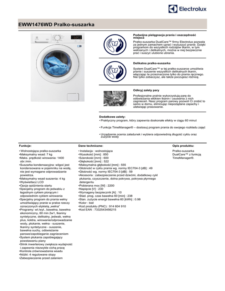EWW1476WD Pralko-suszarka Podwójna pielęgnacja prania i oszczędność miejsca Pralko-suszarka DualCare™ firmy Electrolux pozwala za jednym zamachem uprać i wysuszyć pranie. Dzięki programom do wszystkich rodzajów tkanin, w tym wełnianych i delikatnych, można w niej bezpiecznie prać i suszyć ulubione ubrania. Delikatna pralko-suszarka System DualCare™ w tej pralko-suszarce umożliwia pranie i suszenie wszystkich delikatnych tkanin, włączając te przeznaczone tylko do prania ręcznego. Nie tylko zobaczysz, ale także poczujesz różnicę. Odkryj zalety pary Profesjonalne pralnie wykorzystują parę do odświeżania włókien tkanin i usuwania z nich zagnieceń. Nasz program parowy pozwoli Ci zrobić to samo w domu, eliminując niepożądane zapachy i ułatwiając prasowanie. Dodatkowe zalety: • Praktyczny program, który zapewnia doskonałe efekty w ciągu 60 minut • Funkcja TimeManager® – dostosuj program prania do swojego rozkładu zajęć • Urządzenie ocenia załadunek i wybiera odpowiednią długość cyklu oraz zużycie wody Funkcje: Dane techniczne: Opis produktu: • Wolnostojąca pralko-suszarka •Maksymalny wsad: 7 kg •Maks. prędkość wirowania: 1400 obr./min. •Suszarka kondensacyjna: wilgoć jest kondensowana w pojemniku na wodę, nie jest wymagane odprowadzanie powietrza. •Maksymalny wsad suszenia: 4 kg •Wyświetlacz LCD •Opcja opóźnienia startu •Specjalny program do jedwabiu z łagodnym cyklem piorącym i odpowiednim cyklem wirowania •Specjalny program do prania wełny umożliwiający pranie w pralce rzeczy oznaczonych etykietą „wełna” •Programy: wł./wył., bawełna, bawełna ekonomiczny, 60 min 2w1, tkaniny syntetyczne, delikatny, jedwab, wełna plus, kołdra, wirowanie/odprowadzanie wody, płukanie, wełna - suszenie, tkaniny syntetyczne - suszenie, bawełna suchy, odświeżanie parowe/zapobieganie zagnieceniom •System płukania zapobiegający powstawaniu piany •Silnik inwerterowy zwiększa wydajność i zapewnia niezwykle cichą pracę •Kontrola zrównoważenia wsadu •Nóżki: 4 regulowane stopy •Zabezpieczenie przed zalaniem • Instalacja : wolnostojąca •Wysokość [mm] : 850 •Szerokość [mm] : 600 •Głębokość [mm] : 522 •Maksymalna głębokość [mm] : 555 •Głośność w cyklu prania wg. normy IEC704-3 [dB] : 49 •Głośność wg. normy IEC704-3 [dB] : 59 •Akcesoria : zabezpieczenie przed dziećmi, dodatkowy cykl płukania, czyszczenie, dolna pokrywa, pokrywa płynnego detergentu •Pobierana moc [W] : 2200 •Napięcie [V] : 230 •Wymagany bezpiecznik [A] : 10 •Stad. prog. czas bawełna 60 [min] : 238 •Stan. zużycie energii bawełna 60 [kWh] : 0.98 •Kolor : biel •Kod produktu (PNC) : 914 604 910 •Kod EAN : 7332543456215 Pralko-suszarka DualCare™ z funkcją TimeManager®.