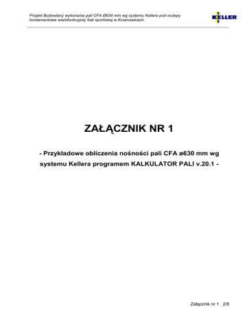 Projekt Budowlany wykonania pali CFA Ø630 mm wg systemu Kellera pod oczepy fundamentowe wielofunkcyjnej Sali sportowej w Krzanowicach. ZAŁĄCZNIK NR 1 - Przykładowe obliczenia nośności pali CFA ø630 mm wg systemu Kellera programem KALKULATOR PALI v.20.1 - Załącznik nr 1 2/8 Obliczenia nośności pali fundamentowych wg PN-83/B-02482 (wersja zgodna z nr. 20.1.0) Nazwa zadania : posadowienie na palach wielofunkcyjnej Sali sportowej w Krzanowicach. • Dane : Pale : CFA (uŜytkownika), w grupie rodzaj: wiercone wykonanie: w rurach obsadowych wyciąganych przekrój pala: kołowy, o średnicy 63,00 (cm) długość pala: 6,50 (m) od poziomu -0,68 (m) typ głowicy: utwierdzona klasa betonu: B 30, beton silnie ubity układ pali: 2 pale w układzie liniowym, wzdłuŜ osi X : rzędy co 1,80 (m) powtórzone 1 raz PodłoŜe gruntowe: woda gruntowa poniŜej poziomu -5,00 (m) brak warstw osiadających Układ warstw : Rodzaj gruntu Nasyp niebudowlany Piasek pylasty Glina pylasta Pył piaszczysty Glina piaszczysta ID/IL 0,20 0,40 0,30 0,20 0,25 wn [%] 15,00 16,00 25,00 18,00 12,00 z [m] 0,00 -0,80 -1,60 -2,40 -3,30 g [kN/m3] 19,00 17,50 20,00 21,00 22,00 t [kN/m2] 0,00 29,41 38,60 24,40 40,50 q [kN/m2] 0,00 1359,28 1290,00 950,00 1400,00 Do obliczeń przyjęto warstwę zastępczą o poziomie stropu z0 = -0,18 (m) • Nośność pojedynczego pala: Wytrzymałości gruntu na pobocznicy pala wciskanego Rodzaj gruntu Nasyp niebudowlany Piasek pylasty Glina pylasta Pył piaszczysty Glina piaszczysta Glina piaszczysta zśr [m] -0,74 -1,20 -2,00 -2,85 -4,24 -6,18 h [m] 0,12 0,80 0,80 0,90 1,88 2,00 Ssi 1,00 1,00 1,00 1,00 1,00 1,00 ti [kN/m2] 0,00 6,01 14,06 13,04 32,89 40,50 Nsi [kN] 0,00 8,56 20,04 20,90 110,06 144,39 Wykres zmiany wytrzymałości wzdłuŜ pala wciskanego Załącznik nr 1 3/8 Wytrzymałości gruntu pod podstawą pala : q = 980,20 (kN/m2) /Spi = 1,00/ Nośność pala obciąŜonego siłą pionową Nośność Nt (w gruncie nośnym) Nośnośc Nw 578,95 (kN) - 189,06 (kN) Nośność pala obciąŜonego siłą poziomą wysokość zaczepienia siły nad poz. terenu obliczeniowy poziom terenu: współczynnik podatności bocznej gruntu zagłębienie pala w gruncie zagłębienie spręŜyste pala pal pośredni (1,5*hs < h < 3*hs), nośność moment Mmax od siły poziomej 100 kN (Np = 275,00, Ns = 303,95) hH = 0,00 (m) z0 = -0,68 (m) kx = 12170,90 (kN/m2) h = 6,50 (m) hS = 3,82 (m) Hr = 380,46 (kN) 190,97 (kN*m) • Przemieszczenia pojedynczego pala: Parametry: moduł średni odkszt. gruntu E0 = 25680,14 (kN/m2) moduł ściśliwości pala Et = 31000000,00 (kN/m2) = 24904,12 (kN/m2) moduł odkszt. w podstawie Eb poziom warstw nieodkszt. zS = -63,80 (m) obliczenia dla pala w warstwie jednorodnej = 1,44 Iok ( h/D, Ka ) = Iok ( 10,13, 1207,16 ) RA = 1,00 = 1,00 Rh osiadanie s dla Qn=1 000 kN : 8,8 (mm) (bez uwzględniania tarcia negatywnego i cięŜaru własnego) przemieszczenie y0 dla Hn = 100 kN : 4,5 (mm) • Nośność fundamentu palowego: Liczba pali: n=2 Najmniejsza odległość pali Zasięg strefy napręŜeń wokół pala : wciskanego wyciąganego Nośność obliczeniowa pala (w grupie) współczynnik korekc. r = 1,80 (m) m = 0,80 R = 0,79 (m) Rw = 0,97 (m) m1 = 1,00 m1 = 0,98 Załącznik nr 1 4/8 wciskanego Qr = 0,80*(1,00*303,95+275,00) = 463,08 (kN) wyciąganego Qrw = - 0,80 * 0,98 * 189,06 = -147,85 (kN) CięŜar obliczeniowy pala z uwzględnieniem wyporu wody: Gp = 45,14 (kN) Dopuszczalne pionowe obciąŜenie obliczeniowe przekazywane na pal: wciskany Pmax = -417,93 (kN) wyciągany Pmin = -192,99 (kN) • Kombinacje obciąŜeń: Nr 1 Typ SGN Q [kN] 207,80 HX [kN] 0,00 Punkt obciąŜenia układu: Środek cięŜkości układu: Punkt sugerowany: HY [kN] 71,00 x = 0,70 (m), x = 0,90 (m), x = -1,33 (m), MX [kN*m] MY [kN*m] 0,00 462,60 y = 0,00 (m) y = 0,00 (m) y = 0,00 (m) Układ pali : Wartości ekstremalne: Kombinacja SGN nr 1: = 337,81 (kN) (pal nr 2) Qmax H = 43,39 (kN) (pal nr 1) (pal nr 1) Qmax/Qmin = -2,60 Największa siła pionowa Największa siła pozioma Największy moment zginający Największy stosunek Qmax = 337,81 (kN) (dopuszczalna: 417,93 (kN)) = 43,39 (kN) (dopuszczalna: 380,46 (kN)) Hmax = 82,86 (kN*m) Mmax Qmax/Qmin= -2,60 Wymagana dla nośności długość pala 5,55 (m) < L = 6,50 (m) Warunek nośności jest spełniony. Załącznik nr 1 5/8