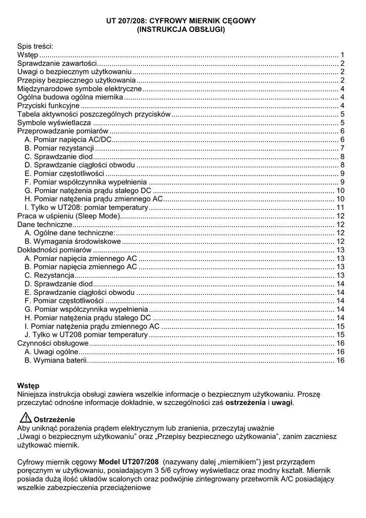 UT 207/208: CYFROWY MIERNIK CĘGOWY (INSTRUKCJA OBSŁUGI) Spis treści: Wstęp ................................................................................................................................................. 1 Sprawdzanie zawartości..................................................................................................................... 2 Uwagi o bezpiecznym uŜytkowaniu.................................................................................................... 2 Przepisy bezpiecznego uŜytkowania.................................................................................................. 2 Międzynarodowe symbole elektryczne............................................................................................... 4 Ogólna budowa ogólna miernika ........................................................................................................ 4 Przyciski funkcyjne ............................................................................................................................. 4 Tabela aktywności poszczególnych przycisków ................................................................................. 5 Symbole wyświetlacza ....................................................................................................................... 5 Przeprowadzanie pomiarów ............................................................................................................... 6 A. Pomiar napięcia AC/DC.............................................................................................................. 6 B. Pomiar rezystancji ...................................................................................................................... 7 C. Sprawdzanie diod....................................................................................................................... 8 D. Sprawdzanie ciągłości obwodu .................................................................................................. 8 E. Pomiar częstotliwości ................................................................................................................. 9 F. Pomiar współczynnika wypełnienia ............................................................................................ 9 G. Pomiar natęŜenia prądu stałego DC ........................................................................................ 10 H. Pomiar natęŜenia prądu zmiennego AC................................................................................... 10 I. Tylko w UT208: pomiar temperatury.......................................................................................... 11 Praca w uśpieniu (Sleep Mode)........................................................................................................ 12 Dane techniczne............................................................................................................................... 12 A. Ogólne dane techniczne:.......................................................................................................... 12 B. Wymagania środowiskowe ....................................................................................................... 12 Dokładności pomiarów ..................................................................................................................... 13 A. Pomiar napięcia zmiennego AC ............................................................................................... 13 B. Pomiar napięcia zmiennego AC ............................................................................................... 13 C. Rezystancja.............................................................................................................................. 13 D. Sprawdzanie diod..................................................................................................................... 14 E. Sprawdzanie ciągłości obwodu ................................................................................................ 14 F. Pomiar częstotliwości ............................................................................................................... 14 G. Pomiar współczynnika wypełnienia.......................................................................................... 14 H. Pomiar natęŜenia prądu stałego DC ........................................................................................ 14 I. Pomiar natęŜenia prądu zmiennego AC .................................................................................... 15 J. Tylko w UT208 pomiar temperatury .......................................................................................... 15 Czynności obsługowe....................................................................................................................... 16 A. Uwagi ogólne............................................................................................................................ 16 B. Wymiana baterii........................................................................................................................ 16 Wstęp Niniejsza instrukcja obsługi zawiera wszelkie informacje o bezpiecznym uŜytkowaniu. Proszę przeczytać odnośne informacje dokładnie, w szczególności zaś ostrzeŜenia i uwagi. ! OstrzeŜenie Aby uniknąć poraŜenia prądem elektrycznym lub zranienia, przeczytaj uwaŜnie „Uwagi o bezpiecznym uŜytkowaniu” oraz „Przepisy bezpiecznego uŜytkowania”, zanim zaczniesz uŜytkować miernik. Cyfrowy miernik cęgowy Model UT207/208 (nazywany dalej „miernikiem”) jest przyrządem poręcznym w uŜytkowaniu, posiadającym 3 5/6 cyfrowy wyświetlacz oraz modny kształt. Miernik posiada duŜą ilość układów scalonych oraz podwójnie zintegrowany przetwornik A/C posiadający wszelkie zabezpieczenia przeciąŜeniowe Miernik moŜe mierzyć napięcia AC/DC, natęŜenia AC/DC, częstotliwość, wsp