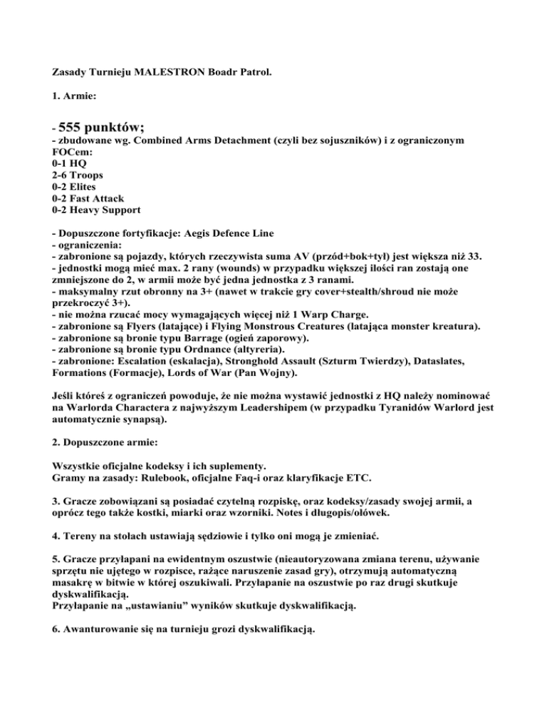 Zasady Turnieju MALESTRON Boadr Patrol. 1. Armie: - 555 punktów; - zbudowane wg. Combined Arms Detachment (czyli bez sojuszników) i z ograniczonym FOCem: 0-1 HQ 2-6 Troops 0-2 Elites 0-2 Fast Attack 0-2 Heavy Support - Dopuszczone fortyfikacje: Aegis Defence Line - ograniczenia: - zabronione są pojazdy, których rzeczywista suma AV (przód+bok+tył) jest większa niż 33. - jednostki mogą mieć max. 2 rany (wounds) w przypadku większej ilości ran zostają one zmniejszone do 2, w armii może być jedna jednostka z 3 ranami. - maksymalny rzut obronny na 3+ (nawet w trakcie gry cover+stealth/shroud nie może przekroczyć 3+). - nie można rzucać mocy wymagających więcej niż 1 Warp Charge. - zabronione są Flyers (latające) i Flying Monstrous Creatures (latająca monster kreatura). - zabronione są bronie typu Barrage (ogień zaporowy). - zabronione są bronie typu Ordnance (altyreria). - zabronione: Escalation (eskalacja), Stronghold Assault (Szturm Twierdzy), Dataslates, Formations (Formacje), Lords of War (Pan Wojny). Jeśli któreś z ograniczeń powoduje, że nie można wystawić jednostki z HQ należy nominować na Warlorda Charactera z najwyższym Leadershipem (w przypadku Tyranidów Warlord jest automatycznie synapsą). 2. Dopuszczone armie: Wszystkie oficjalne kodeksy i ich suplementy. Gramy na zasady: Rulebook, oficjalne Faq-i oraz klaryfikacje ETC. 3. Gracze zobowiązani są posiadać czytelną rozpiskę, oraz kodeksy/zasady swojej armii, a oprócz tego także kostki, miarki oraz wzorniki. Notes i długopis/ołówek. 4. Tereny na stołach ustawiają sędziowie i tylko oni mogą je zmieniać. 5. Gracze przyłapani na ewidentnym oszustwie (nieautoryzowana zmiana terenu, używanie sprzętu nie ujętego w rozpisce, rażące naruszenie zasad gry), otrzymują automatyczną masakrę w bitwie w której oszukiwali. Przyłapanie na oszustwie po raz drugi skutkuje dyskwalifikacją. Przyłapanie na „ustawianiu” wyników skutkuje dyskwalifikacją. 6. Awanturowanie się na turnieju grozi dyskwalifikacją. 7. Od decyzji sędziego głównego nie można się odwołać. Poza celami misji w każdej bitwie obowiązuje +1VP za First Blood (Pierwsza Krew) , Slay the Warlord (Zabij Głównodowodzącego), Linebreaker (Przełam Linię Wroga). Mealstorm: Każdy gracz otrzyma zmodyfikowana listę kart rozpisanych poniżej. Na początku pierwszej swojej tury gracz dociąga 2 karty. Następnie na początku każdej kolejnej swojej tury dociąga tyle kart aby mieć na ręku 2 karty. Kiedy cel karty jest wypełniony na koniec tury, należy zanotować zdobyte VP i odrzucić kartę. Każdy tactical objective może być użyty tylko raz na grę. Można użyć tylko dwóch kart na turę. Jeżeli jakiś objective nie może być spełniony, dla przykładu ‘zniszczenie budynku’ a przeciwnik ich nie ma, należy go zaraz po wylosowaniu odrzucić i dociągnąć od nowa. Oczywiście nie dotyczy to sytuacji, w której wylosujemy np. zniszczenie flyera gdy flyery przeciwnika są jeszcze poza stolem. Proszę mieć na uwadze, że niektóre objectivy zostały zmienione, dla przykładu wszystkie referencje do d3 vp zostały zmienione na 2vp. 8. Misje: Misje będą losowane zaraz po rozstawieniu terenu przez sędziów. Wybór misji odbywa się poprzez rzut K3 z pośród podanych poniżej. Następnie sędzia rozstawia Taktyczne cele misji. Gracze wybierają swoją stronę i kolejność rozstawienia oraz kto zaczyna 1 turę. Po tym następuje możliwość przejęcia 1 tury. 1. Wystawienie - Ćwiartki Malestorm - Contact lost– Stracony kontakt (2) Znacznik 5 i 6 są wystawione razem z armiami w strefach wystawienia i są warte po 3VP na koniec gry. 2. Wystawienie - Vanguard Strike– Uderzenie Awangardy Malestorm - Deadlock- Impas (6) Wszystkie Fast Attaki dostają Objective Secured, a za zabicie ich otrzymujemy po 1VP 3. Wystawienie - Dawn of war Malestorm - Spoils of war– Wojenne Łupy (4) Po 1VP za każdą przyjazną jednostkę we wrogiej strefie wystawienia. 9. Po zakończeniu bitwy punkty zliczają sędziowie. 10. Sędzia przyznaje punkty ujemne i dodatkowe. +1 – za pomalowaną w całości armie wraz z podstawkami, przynajmniej kolorami podstawowymi. - 1 – za brak rozpiski. - 1 – za brak kodeksu armii, miarki, wzorników, notesu i długopisu. - 1 – za każde 15 minut spóźnienie się na turniej.