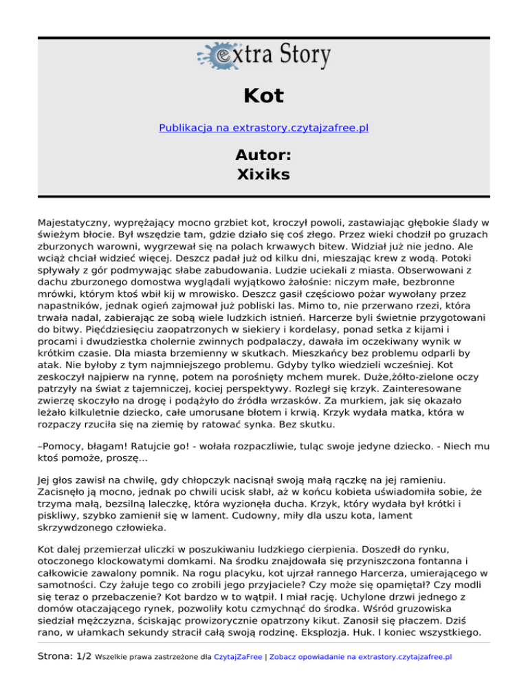 Kot Publikacja na extrastory.czytajzafree.pl Autor: Xixiks Majestatyczny, wyprężający mocno grzbiet kot, kroczył powoli, zastawiając głębokie ślady w świeżym błocie. Był wszędzie tam, gdzie działo się coś złego. Przez wieki chodził po gruzach zburzonych warowni, wygrzewał się na polach krwawych bitew. Widział już nie jedno. Ale wciąż chciał widzieć więcej. Deszcz padał już od kilku dni, mieszając krew z wodą. Potoki spływały z gór podmywając słabe zabudowania. Ludzie uciekali z miasta. Obserwowani z dachu zburzonego domostwa wyglądali wyjątkowo żałośnie: niczym małe, bezbronne mrówki, którym ktoś wbił kij w mrowisko. Deszcz gasił częściowo pożar wywołany przez napastników, jednak ogień zajmował już pobliski las. Mimo to, nie przerwano rzezi, która trwała nadal, zabierając ze sobą wiele ludzkich istnień. Harcerze byli świetnie przygotowani do bitwy. Pięćdziesięciu zaopatrzonych w siekiery i kordelasy, ponad setka z kijami i procami i dwudziestka cholernie zwinnych podpalaczy, dawała im oczekiwany wynik w krótkim czasie. Dla miasta brzemienny w skutkach. Mieszkańcy bez problemu odparli by atak. Nie byłoby z tym najmniejszego problemu. Gdyby tylko wiedzieli wcześniej. Kot zeskoczył najpierw na rynnę, potem na porośnięty mchem murek. Duże,żółto-zielone oczy patrzyły na świat z tajemniczej, kociej perspektywy. Rozległ się krzyk. Zainteresowane zwierzę skoczyło na drogę i podążyło do źródła wrzasków. Za murkiem, jak się okazało leżało kilkuletnie dziecko, całe umorusane błotem i krwią. Krzyk wydała matka, która w rozpaczy rzuciła się na ziemię by ratować synka. Bez skutku. –Pomocy, błagam! Ratujcie go! - wołała rozpaczliwie, tuląc swoje jedyne dziecko. - Niech mu ktoś pomoże, proszę... Jej głos zawisł na chwilę, gdy chłopczyk nacisnął swoją małą rączkę na jej ramieniu. Zacisnęło ją mocno, jednak po chwili ucisk słabł, aż w końcu kobieta uświadomiła sobie, że trzyma małą, bezsilną laleczkę, która wyzionęła ducha. Krzyk, który wydała był krótki i piskliwy, szybko zamienił się w lament. Cudowny, miły dla uszu kota, lament skrzywdzonego człowieka. Kot dalej przemierzał uliczki w poszukiwaniu ludzkiego cierpienia. Doszedł do rynku, otoczonego klockowatymi domkami. Na środku znajdowała się przyniszczona fontanna i całkowicie zawalony pomnik. Na rogu placyku, kot ujrzał rannego Harcerza, umierającego w samotności. Czy żałuje tego co zrobili jego przyjaciele? Czy może się opamiętał? Czy modli się teraz o przebaczenie? Kot bardzo w to wątpił. I miał rację. Uchylone drzwi jednego z domów otaczającego rynek, pozwoliły kotu czmychnąć do środka. Wśród gruzowiska siedział mężczyzna, ściskając prowizorycznie opatrzony kikut. Zanosił się płaczem. Dziś rano, w ułamkach sekundy stracił całą swoją rodzinę. Eksplozja. Huk. I koniec wszystkiego. Strona: 1/2 Wszelkie prawa zastrzeżone dla CzytajZaFree | Zobacz opowiadanie na extrastory.czytajzafree.pl Co się z nim stanie za kilka lat? Czy nie zabije się z rozpaczy lub czy sam nie zacznie zabijać? Czy w ogóle zasłużył sobie na taki los? Może. A może nie. I tak właśnie na świecie rozprzestrzenia się Zło. Wojna stawia na drodze zupełnie niewinnego człowieka tyle nieszczęść, szkód i smutków, że zakorzenia w nim chęć zemsty. Ten odpłaca złem za zło. Zupełnie prawidłowo. I koło się zamyka. -Zdrajcy narodu! Koryto dla świń, a stryczek dla zdrajcy! – wrzeszczeli Harcerze, którzy rano wtargnęli do miasta. Ich też ktoś kiedyś skrzywdził. Ile rodzin rozdzieliła dzisiejsza wojna? Ile rodzin, kochających siebie nawzajem? Setki tysięcy istnień budowało przyjaźnie, zaufanie i miłość. Była też druga strona medalu, bo jakby inaczej. Każdy musi ją mieć nieodzownie: Ile ludzi, zakopało dziś topór wojenny by dążyć razem, dla dobra sprawy? Ludzie potrafią się jednoczyć. Szkoda, że aż tyle litrów krwi musi przy tym wsiąknąć w ziemię. Zadowolony obrazkami kot, dalej penetrował uliczki swoimi żółto-zielonymi ślepkami w poszukiwaniu ludzkiego cierpienia. Tak, lubił na nie patrzeć. Od zarania dziejów. Zawsze. Cieszył go ten widok. Bo to był bardzo zły kot. Strona: 2/2 Wszelkie prawa zastrzeżone dla CzytajZaFree | Zobacz opowiadanie na extrastory.czytajzafree.pl
