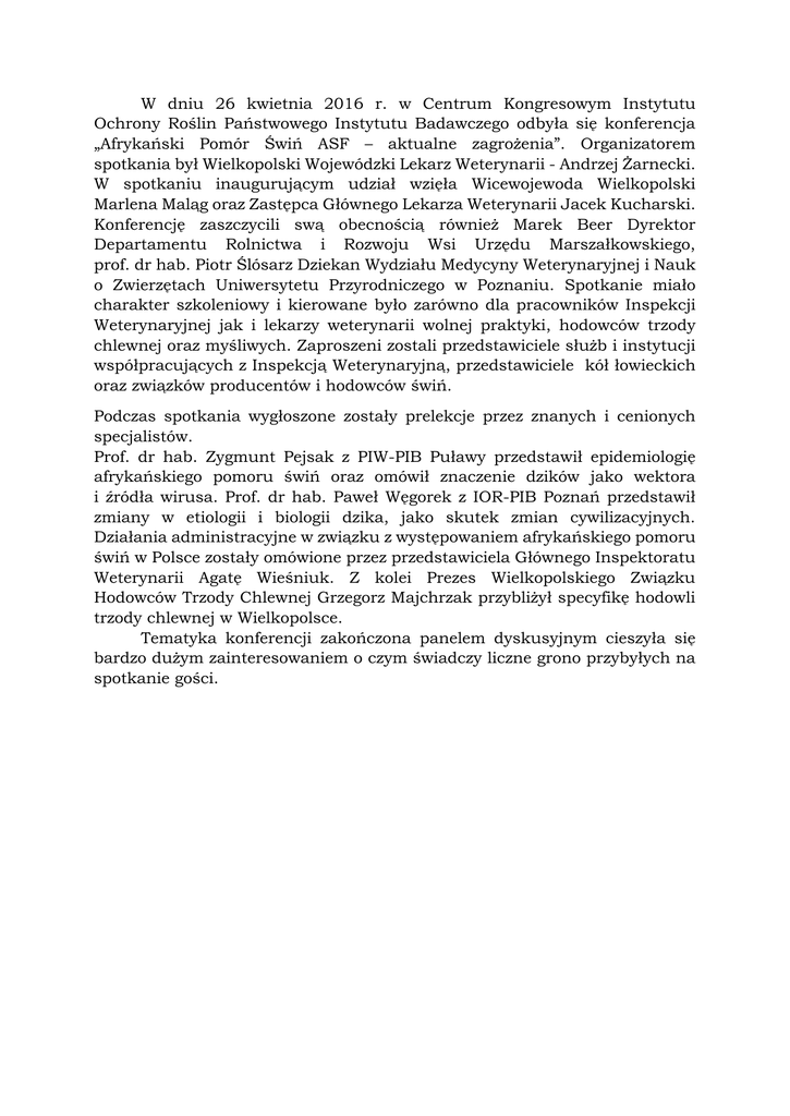 W dniu 26 kwietnia 2016 r. w Centrum Kongresowym Instytutu Ochrony Roślin Państwowego Instytutu Badawczego odbyła się konferencja „Afrykański Pomór Świń ASF – aktualne zagrożenia”. Organizatorem spotkania był Wielkopolski Wojewódzki Lekarz Weterynarii - Andrzej Żarnecki. W spotkaniu inaugurującym udział wzięła Wicewojewoda Wielkopolski Marlena Maląg oraz Zastępca Głównego Lekarza Weterynarii Jacek Kucharski. Konferencję zaszczycili swą obecnością również Marek Beer Dyrektor Departamentu Rolnictwa i Rozwoju Wsi Urzędu Marszałkowskiego, prof. dr hab. Piotr Ślósarz Dziekan Wydziału Medycyny Weterynaryjnej i Nauk o Zwierzętach Uniwersytetu Przyrodniczego w Poznaniu. Spotkanie miało charakter szkoleniowy i kierowane było zarówno dla pracowników Inspekcji Weterynaryjnej jak i lekarzy weterynarii wolnej praktyki, hodowców trzody chlewnej oraz myśliwych. Zaproszeni zostali przedstawiciele służb i instytucji współpracujących z Inspekcją Weterynaryjną, przedstawiciele kół łowieckich oraz związków producentów i hodowców świń. Podczas spotkania wygłoszone zostały prelekcje przez znanych i cenionych specjalistów. Prof. dr hab. Zygmunt Pejsak z PIW-PIB Puławy przedstawił epidemiologię afrykańskiego pomoru świń oraz omówił znaczenie dzików jako wektora i źródła wirusa. Prof. dr hab. Paweł Węgorek z IOR-PIB Poznań przedstawił zmiany w etiologii i biologii dzika, jako skutek zmian cywilizacyjnych. Działania administracyjne w związku z występowaniem afrykańskiego pomoru świń w Polsce zostały omówione przez przedstawiciela Głównego Inspektoratu Weterynarii Agatę Wieśniuk. Z kolei Prezes Wielkopolskiego Związku Hodowców Trzody Chlewnej Grzegorz Majchrzak przybliżył specyfikę hodowli trzody chlewnej w Wielkopolsce. Tematyka konferencji zakończona panelem dyskusyjnym cieszyła się bardzo dużym zainteresowaniem o czym świadczy liczne grono przybyłych na spotkanie gości.
