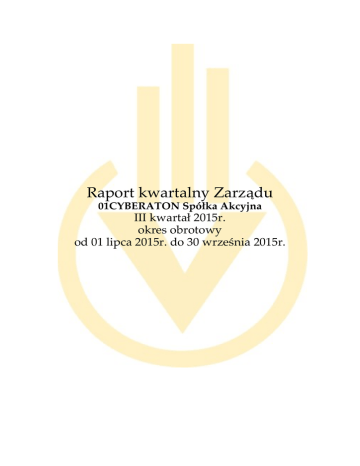 Raport kwartalny Zarządu 01CYBERATON Spółka Akcyjna III kwartał 2015r. okres obrotowy od 01 lipca 2015r. do 30 września 2015r. SPIS TREŚCI: I. Informacja o zasadach przyjętych przy sporządzaniu Raportu kwartalnego 3 II. Informacje Ogólne 3 III. Walne zgromadzenie Akcjonariuszy spółki z dnia 30.06.2015 4 IV. Podział stanowisk w ramach Rady Nadzorczej Emitenta 7 V. Powołanie zarządu spółki 01CYBERATON S. A. 7 VI. Przekazanie środków pieniężnych na wypłatę dywidendy do Krajowego Depozytu Papierów Wartościowych S. A. 8 VII. Strategia spółki 01CYBERATON S. A. na lata 2015/2016 VIII. Rozpoczęcie budowy instalacji fotowoltaicznych w Gminie Bukowina Tatrzańska 10 IX. Dane bilansowe oraz rachunek zysków i strat za III kwartał 2015r. 11 X. Zatrudnienie 11 XI. Informacje na temat prognoz opublikowanych w III kwartale 2015r.11 XII. Aktualna struktura akcjonariatu Emitenta 12 XIII. Terminy przekazywania Raportów okresowych w 2015 roku 12 XIV. Oświadczenie Zarządu 12 XV. Bilans 13 XVI. Rachunek Zysków i Strat 18 XVII. Przepływy Pieniężne 20 XVIII. Zestawienie zmian w Kapitale(Funduszu) Własnym 22 XIX. Komentarz Zarządu na temat czynników i zdarzeń, które miały wpływ na osiągnięte wyniki fnansowe w III kwartale 26 ———————————————————————— ——--—— Biuro Zarządu Spółki ul. Słomińskiego 15/504, 00-195 Warszawa www.01cyberaton.eu tel.: +48 22 415 41 46 tel./fax: +48 22 758 34 74 email: [email protected] 01CYBERATON S.A. jest Spółką notowaną na NewConnect I. Informacja o zasadach przyjętych przy sporządzaniu Raportu kwartalnego: W związku z brakiem formalnego wymogu opiniowania kwartalnego raportu okresowego przez biegłego rewidenta, niniejszy raport, obejmujący III kwartał 2015 roku, nie podlegał badaniu ani przeglądowi przez podmiot uprawniony do badania sprawozdań finansowych. Raport kwartalny obejmuje dane za okres od 1. lipca 2015 do 30. września 2015 wraz z okresem porównawczym w roku 2014. Sprawozdanie finansowe i dane porównawcze zaprezentowane w niniejszym raporcie sporządzone zostały zgodnie z obowiązującymi Spółkę zasadami rachunkowości, odzwierciedlają w sposób prawdziwy, rzetelny i jasny sytuację majątkową i finansową Spółki oraz jej wynik finansowy. II. Informacje Ogólne: A. Dane podstawowe Spółki: Nazwa: 01CYBERATON Spółka Akcyjna Nazwa skrócona: 01CYBERATON S.A. Siedziba: Warszawa ul. Słomińskiego 15 lok. 504 Adres: Warszawa 00-195 Przynależność do indeksów: Kod ISIN: Symbol Spółki: Ticker GPW: NCIndex, NCIndex30 PLVCAOC00015 01CYBATON 01C Telefon: Faks: Adres poczty elektronicznej: Adres strony internetowej: +48 22 415 41 46 +48 22 758 34 74 [email protected] www.01cyberaton.eu Forma prawna: NIP: REGON: Spółka Akcyjna 525-24-12-727 141220241 Sąd Rejonowy dla m. st. Warszawy, XII Wydział Gospodarczy Krajowego Rejestru Sądowego pod numerem 0000293918 35 866 608zł, w całości opłacony KRS: Kapitał zakładowy: ———————————————————————— ——--—— Biuro Zarządu Spółki ul. Słomińskiego 15/504, 00-195 Warszawa www.01cyberaton.eu tel.: +48 22 415 41 46 tel./fax: +48 22 758 34 74 email: [email protected] 01CYBERATON S.A. jest Spółką notowaną na NewConnect B. Zarząd Spółki: Robert Ziółek - Prezes Zarządu Marcin Stanisław Orzechowski – Członek Zarządu Marek Górka – Członek Zarządu C. Prokurent Spółki: Michał Janowski- Prokurent D. Rada Nadzorcza Spółki: Andrzej Olafa Foremnego- Członek Rady Nadzorczej Marek Jacka Dmochowskiego- Członek Rady Nadzorczej Edward Wincentego Gocał- Członek Rady Nadzorczej Renata Irenę Śliwińską- Członek Rady Nadzorczej Agnieszka Irenę Gocał- Członek Rady Nadzorczej Jacek Franasik- Członek Rady Nadzorczej Stanisław Franciszka Klimczak- Członek Rady Nadzorczej Beata Telenga-Pośpiech- Członek Rady Nadzorczej Marzena Aleksandrowicz- Członek Rady Nadzorczej III. Walne Zgromadzenie Akcjonariuszy spółki z dnia 30 czerwca 2015 r. a) Podział zysków spółki 01CYBERATON S. A. za rok obrotowy 2014 Walne Zgromadzenie Emitenta, które odbyło się w dniu 30 czerwca 2015 roku, na mocy podjętej uchwały nr 6, postanowiło zysk netto za rok obrotowy kończący się w dniu 31 grudnia 2014 r., w wysokości 13.556.402,08 zł (trzynaście milionów pięćset pięćdziesiąt sześć tysięcy czterysta dwa złote osiem groszy), podzielić w następujący sposób: 1) kwotę 8.012.920,74 zł (osiem milionów dwanaście tysięcy dziewięćset dwadzieścia złotych siedemdziesiąt cztery grosze), przeznaczyć na pokrycie strat z lat poprzednich; 2) kwotę w wysokości 448.332,60 zł (czterysta czterdzieści osiem tysięcy trzysta trzydzieści dwa złote sześćdziesiąt groszy), przeznaczyć na wypłatę dywidendy dla akcjonariuszy Spółki, co, mając na uwadze, że w Spółce jest 4.483.326 (cztery miliony czterysta osiemdziesiąt trzy tysiące trzysta dwadzieścia sześć) sztuk akcji, z których wszystkie są uprawnione do udziału w dywidendzie oraz w pełni pokryte, a żadna nie jest uprzywilejowana w zakresie dywidendy, oznacza, że na jedną akcję Spółki będzie przypadała dywidenda w wysokości 0,10 zł (zero złotych dziesięć groszy); 3) pozostałą kwotę w wysokości 5.095.148,74 zł (pięć milionów dziewięćdziesiąt pięć tysięcy sto czterdzieści osiem złotych siedemdziesiąt cztery grosze), przenieść na kapitał zapasowy. ———————————————————————— ——--—— Biuro Zarządu Spółki ul. Słomińskiego 15/504, 00-195 Warszawa www.01cyberaton.eu tel.: +48 22 415 41 46 tel./fax: +48 22 758 34 74 email: [email protected] 01CYBERATON S.A. jest Spółką notowaną na NewConnect b) Decyzja WZ o dokonaniu splitu akcji Emitenta. Zwyczajne Walne Zgromadzenie Emitenta, które odbyło się w dniu 30 czerwca 2015 roku, podjęło uchwałę, na mocy której postanowiło dokon