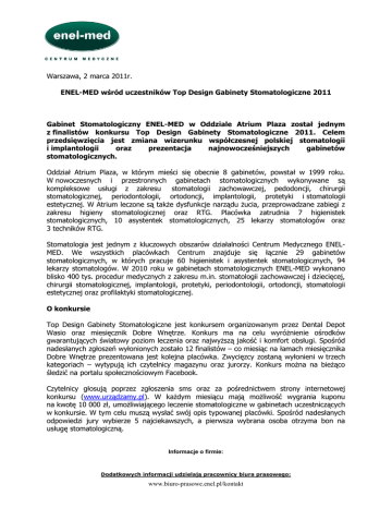 Warszawa, 2 marca 2011r. ENEL-MED wśród uczestników Top Design Gabinety Stomatologiczne 2011 Gabinet Stomatologiczny ENEL-MED w Oddziale Atrium Plaza został jednym z finalistów konkursu Top Design Gabinety Stomatologiczne 2011. Celem przedsięwzięcia jest zmiana wizerunku współczesnej polskiej stomatologii i implantologii oraz prezentacja najnowocześniejszych gabinetów stomatologicznych. Oddział Atrium Plaza, w którym mieści się obecnie 8 gabinetów, powstał w 1999 roku. W nowoczesnych i przestronnych gabinetach stomatologicznych wykonywane są kompleksowe usługi z zakresu stomatologii zachowawczej, pedodoncji, chirurgii stomatologicznej, periodontologii, ortodoncji, implantologii, protetyki i stomatologii estetycznej. W Atrium leczone są także dysfunkcje narządu żucia, przeprowadzane zabiegi z zakresu higieny stomatologicznej oraz RTG. Placówka zatrudnia 7 higienistek stomatologicznych, 10 asystentek stomatologicznych, 25 lekarzy stomatologów oraz 3 techników RTG. Stomatologia jest jednym z kluczowych obszarów działalności Centrum Medycznego ENELMED. We wszystkich placówkach Centrum znajduje się łącznie 29 gabinetów stomatologicznych, w których pracuje 60 higienistek i asystentek stomatologicznych, 94 lekarzy stomatologów. W 2010 roku w gabinetach stomatologicznych ENEL-MED wykonano blisko 400 tys. procedur medycznych z zakresu m.in. stomatologii zachowawczej i dziecięcej, chirurgii stomatologicznej, implantologii, protetyki, periodontologii, ortodoncji, stomatologii estetycznej oraz profilaktyki stomatologicznej. O konkursie Top Design Gabinety Stomatologiczne jest konkursem organizowanym przez Dental Depot Wasio oraz miesięcznik Dobre Wnętrze. Konkurs ma na celu wyróżnienie ośrodków gwarantujących światowy poziom leczenia oraz najwyższą jakość i komfort obsługi. Spośród nadesłanych zgłoszeń wyłonionych zostało 12 finalistów – co miesiąc na łamach miesięcznika Dobre Wnętrze prezentowana jest kolejna placówka. Zwycięzcy zostaną wyłonieni w trzech kategoriach – wytypują ich czytelnicy magazynu oraz jurorzy. Konkurs można na bieżąco śledzić na portalu społecznościowym Facebook. Czytelnicy głosują poprzez zgłoszenia sms oraz za pośrednictwem strony internetowej konkursu (www.urządzamy.pl). W każdym miesiącu mają możliwość wygrania kuponu na kwotę 10 000 zł, umożliwiającego leczenie stomatologiczne w gabinetach uczestniczących w konkursie. W tym celu muszą wysłać swój opis typowanej placówki. Spośród nadesłanych odpowiedzi jury wybierze 5 najciekawszych, a pierwsza wybrana osoba otrzyma bon na usługę stomatologiczną. Informacje o firmie: Dodatkowych informacji udzielają pracownicy biura prasowego: www.biuro-prasowe.enel.pl/kontakt Centrum Medyczne ENEL-MED S.A. (www.enel.pl) istnieje od 1993 roku. Obecnie na sieć medyczną ENEL-MED składa się kilkaset placówek medycznych w całej Polsce. Wśród nich są własne oddziały Centrum zlokalizowane w Warszawie (Atrium, Arkadia, Blue City, Domaniewska, Puławska, Zacisze), Gdańsku (Grunwaldzka), Łodzi (Manufaktura), Krakowie (Galeria Krakowska), Poznaniu (Kupiec Poznański) i Wrocławiu (Arkady Wrocławskie) oraz wielospecjalistyczny szpital (na warszawskim Zaciszu) funkcjonujący od 1998 roku i otwarty w 2012 roku Szpital Centrum w Warszawie. ENEL-MED posiada także własne oddziały i pracownie diagnostyczne (Bielany, Centrum i Zacisze w Warszawie, Lublin, Łomża, Mielec, Poznań, Wołomin, Konin, Gdańsk). Centrum oferuje pełną obsługę medyczną, prowadzi pacjenta od konsultacji, przez diagnozę, hospitalizację, operację, aż po rehabilitację – czyli przez cały zamknięty cykl leczenia. Usługi świadczone są w następujących zakresach: - przychodnie specjalistyczne (lekarze wszystkich specjalności) kliniki stomatologiczne diagnostyka obrazowa (tomograf komputerowy, rezonans magnetyczny, RTG, mammograf, USG i inne) szpital rehabilitacja centrum psychologiczne teleradiologia i outsourcing szkoła rodzenia autorskie programy profilaktyczne wysokospecjalistyczna poradnia okulistyczna Centrum posiada w ofercie produkty zarówno dla klientów korporacyjnych – system abonamentowej opieki medycznej dla firm Enel-Care, jak i klientów indywidualnych – program komercyjnych ubezpieczeń zdrowotnych medi-care, który realizowany jest wspólnie z InterRisk S.A. Vienna Insurance Group. Zespół ENEL-MED liczy obecnie ok. 1770 osób, w tym ok. 850 lekarzy i ok. 450 pracowników personelu medycznego nielekarskiego. 95% kadry medycznej posiada II stopień specjalizacji. Z usług ENEL-MED korzysta ponad 300 tys. pacjentów. W ramach programu Enel-Care, Centrum obsługuje blisko 117 tys. pacjentów abonamentowych (maj 2012 r.). W 2004 roku Centrum uzyskało Certyfikat Systemu Zarządzania Jakością zgodnie z wymogami normy ISO 9001:2000, a re-certyfikacja przeprowadzona w styczniu 2010 roku zakończyła się rekomendacją do wydania certyfikatu na zgodność z normą ISO 9001:2008. Dodatkowych informacji udzielają pracownicy biura prasowego: www.biuro-prasowe.enel.pl/kontakt