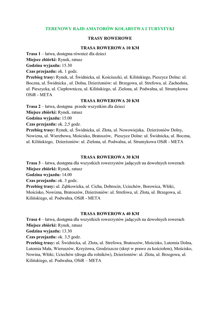 TERENOWY RAJD AMATORÓW KOLARSTWA I TURYSTYKI TRASY ROWEROWE TRASA ROWEROWA 10 KM Trasa 1 – łatwa, dostępna również dla dzieci Miejsce zbiórki: Rynek, ratusz Godzina wyjazdu: 15.30 Czas przejazdu: ok. 1 godz. Przebieg trasy: Rynek, ul. Świdnicka, ul. Kościuszki, ul. Kilińskiego, Pieszyce Dolne: ul. Boczna, ul. Świdnicka , ul. Dolna, Dzierżoniów: ul. Brzegowa, ul. Strefowa, ul. Zachodnia, ul. Pieszycka, ul. Ciepłownicza, ul. Kilińskiego, ul. Zielona, ul. Podwalna, ul. Strumykowa OSiR - META TRASA ROWEROWA 20 KM Trasa 2 – łatwa, dostępna przede wszystkim dla dzieci Miejsce zbiórki: Rynek, ratusz Godzina wyjazdu: 15.00 Czas przejazdu: ok. 2,5 godz. Przebieg trasy: Rynek, ul. Świdnicka, ul. Złota, ul. Nowowiejska, Dzierżoniów Dolny, Nowizna, ul. Wierzbowa, Mościsko, Bratoszów, Pieszyce Dolne: ul. Świdnicka, ul. Boczna, ul. Kilińskiego, Dzierżoniów: ul. Zielona, ul. Podwalna, ul. Strumykowa OSiR - META TRASA ROWEROWA 30 KM Trasa 3 – łatwa, dostępna dla wszystkich rowerzystów jadących na dowolnych rowerach Miejsce zbiórki: Rynek, ratusz Godzina wyjazdu: 14.00 Czas przejazdu: ok. 3 godz. Przebieg trasy: ul. Ząbkowicka, ul. Cicha, Dobrocin, Uciechów, Borowica, Włóki, Mościsko, Nowizna, Bratoszów, Dzierżoniów: ul. Strefowa, ul. Złota, ul. Brzegowa, ul. Kilińskiego, ul. Podwalna, OSiR - META TRASA ROWEROWA 40 KM Trasa 4 – łatwa, dostępna dla wszystkich rowerzystów jadących na dowolnych rowerach Miejsce zbiórki: Rynek, ratusz Godzina wyjazdu: 13.30 Czas przejazdu: ok. 3,5 godz. Przebieg trasy: ul. Świdnicka, ul. Złota, ul. Strefowa, Bratoszów, Mościsko, Lutomia Dolna, Lutomia Mała, Wieruszów, Krzyżowa, Grodziszcze (skręt w prawo za kościołem), Mościsko, Nowina, Włóki, Uciechów (droga dla rolników), Dzierżoniów: ul. Złota, ul. Brzegowa, ul. Kilińskiego, ul. Podwalna, OSiR – META TRASA ROWEROWA 50 KM Trasa 5 – średnio trudna na dobrych nawierzchniach, dla rowerzystów jadących na rowerach szosowych („kolarskich”) i innych (trekkingowych, górskich, itp.) Miejsce zbiórki: Rynek, ratusz Godzina wyjazdu: 13.30 Czas przejazdu: ok. 5 godz. Przebieg trasy: ul. Świdnicka, ul. Złota, Włóki, Tuszyn, Kiełczyn, Jędrzejowice, Wiry, Przełęcz Tąpadła, Sulistrowiczki, Sulistrowice, Oleszna, Słupice, Stoszów, Kołaczów, Roztocznik, Dobrocin, Dzierżoniów: ul. Cicha, ul. Ząbkowicka, Bat. Chłopskich, ul. Kopernika, ul. Strumykowa, OSiR-META TRASA ROWEROWA GÓRSKA OK. 55 KM Trasa 6 – trudna, dla rowerzystów jadących na rowerach górskich, OBOWIĄZKOWE KASKI Miejsce zbiórki: Rynek, ratusz Godzina wyjazdu na trasę: 11.30 Czas przejazdu z odpoczynkami: ok. 6 godz. Przebieg trasy: ul. Świdnicka, ul. Kościuszki, ul. Nowowiejska, Bratoszów, Pieszyce Dolne, Pieszyce, Rościszów, Przełęcz Walimska, niebieskim szlakiem na Wielką Sowę, czerwonym szlakiem na Kalenicę przez Kozie Siodło, Przełęcz Jugowską, Zimną Polanę, powrót czerwonym szlakiem z Kalenicy na Zimną Polanę, żółtym szlakiem na Trzy Buki, niebieskim szlakiem do Bielawy: Leśny Dworek, ul. Nowobielawska, OWW Sudety i trasą rowerową z Bielawy, OSiR – META TRASA ROWEROWA 60 KM Trasa 7 – średnio trudna, dla rowerzystów jadących na dowolnych rowerach Miejsce zbiórki: Rynek, ratusz Godzina wyjazdu: 12.30 Czas przejazdu: ok. 5,5 godz. Przebieg trasy: ul. Ząbkowicka, ul. Cicha, Dobrocin, Roztocznik, Kołaczów, Stoszów, Słupice, Jaźwina, Kiełczyn, Tuszyn, Mościsko, Grodziszcze, Krzyżowa, Wieruszów, Bojanice, Lutomia Górna, Piskorzów, Bratoszów, Dzierżoniów: ul. Brzegowa, ul. Kilińskiego, ul. Podwalna, OSiR – META TRASA ROWEROWA 100 KM Trasa 8 – bardzo trudna, wymagająca dobrego przygotowania kondycyjnego Miejsce zbiórki: Rynek, ratusz Godzina wyjazdu: 11.00 Czas przejazdu: ok. 8 godz. Przebieg trasy: Rynek, ul. Świdnicka, ul. Złota, ul. Nowowiejska, Dzierżoniów Dolny, Nowizna, Mościsko, Bratoszów, Piskorzów, Pieszyce, Rościszów, Glinno, Zagórze Śląskie, Jugowice, Walim, Rzeczka, Sokolec, Przełęcz Sokola, Jugów, Wolibórz, Przełęcz Srebrna, Srebrna Góra, Jemna, Rudnica, Grodziszcze, Różana, Owiesno, Piława Dolna, Bielawa, Dzierżoniów: ul. Bat. Chłopskich, ul. Kolejowa , ul. Strumykowa, OSiR – META TRASA MOTOCYKLOWA Miejsce zbiórki: Rynek, ratusz Godzina wyjazdu: 12:00 Przebieg trasy: Dzierżoniów, Rościszów, Walim (zwiedzanie sztolni walimskich), Dzierżoniów: OSiR - META