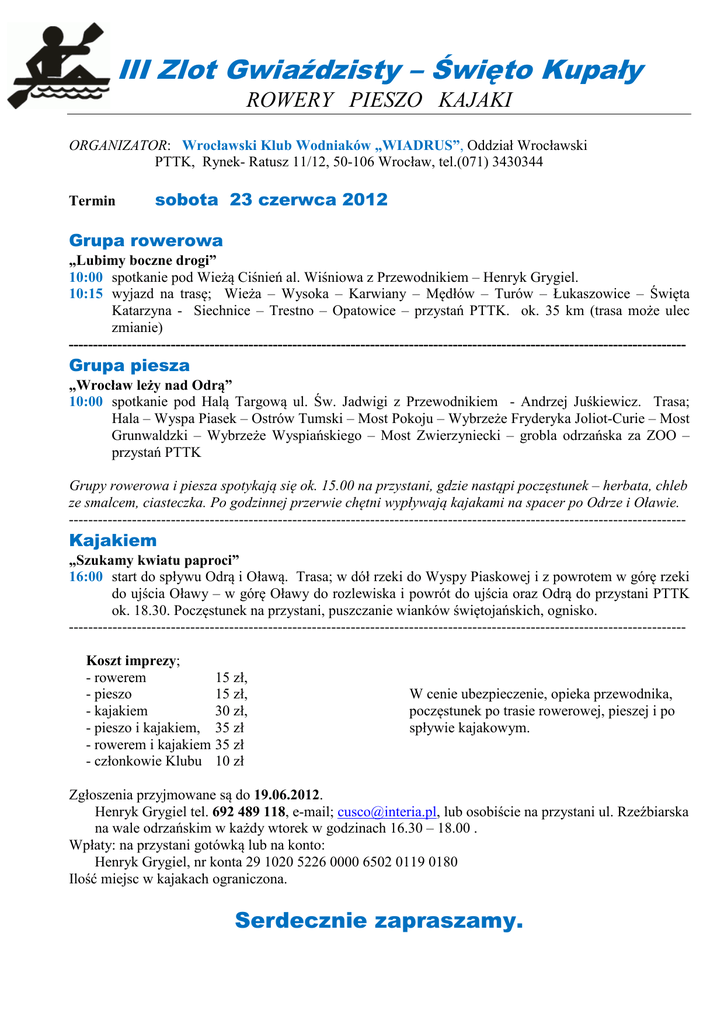 III Zlot Gwiaździsty – Święto Kupały ROWERY PIESZO KAJAKI ORGANIZATOR: Wrocławski Klub Wodniaków „WIADRUS”, Oddział Wrocławski PTTK, Rynek- Ratusz 11/12, 50-106 Wrocław, tel.(071) 3430344 Termin sobota 23 czerwca 2012 Grupa rowerowa „Lubimy boczne drogi” 10:00 spotkanie pod Wieżą Ciśnień al. Wiśniowa z Przewodnikiem – Henryk Grygiel. 10:15 wyjazd na trasę; Wieża – Wysoka – Karwiany – Mędłów – Turów – Łukaszowice – Święta Katarzyna - Siechnice – Trestno – Opatowice – przystań PTTK. ok. 35 km (trasa może ulec zmianie) ------------------------------------------------------------------------------------------------------------------------------- Grupa piesza „Wrocław leży nad Odrą” 10:00 spotkanie pod Halą Targową ul. Św. Jadwigi z Przewodnikiem - Andrzej Juśkiewicz. Trasa; Hala – Wyspa Piasek – Ostrów Tumski – Most Pokoju – Wybrzeże Fryderyka Joliot-Curie – Most Grunwaldzki – Wybrzeże Wyspiańskiego – Most Zwierzyniecki – grobla odrzańska za ZOO – przystań PTTK Grupy rowerowa i piesza spotykają się ok. 15.00 na przystani, gdzie nastąpi poczęstunek – herbata, chleb ze smalcem, ciasteczka. Po godzinnej przerwie chętni wypływają kajakami na spacer po Odrze i Oławie. ------------------------------------------------------------------------------------------------------------------------------- Kajakiem „Szukamy kwiatu paproci” 16:00 start do spływu Odrą i Oławą. Trasa; w dół rzeki do Wyspy Piaskowej i z powrotem w górę rzeki do ujścia Oławy – w górę Oławy do rozlewiska i powrót do ujścia oraz Odrą do przystani PTTK ok. 18.30. Poczęstunek na przystani, puszczanie wianków świętojańskich, ognisko. ------------------------------------------------------------------------------------------------------------------------------Koszt imprezy; - rowerem 15 zł, - pieszo 15 zł, - kajakiem 30 zł, - pieszo i kajakiem, 35 zł - rowerem i kajakiem 35 zł - członkowie Klubu 10 zł W cenie ubezpieczenie, opieka przewodnika, poczęstunek po trasie rowerowej, pieszej i po spływie kajakowym. Zgłoszenia przyjmowane są do 19.06.2012. Henryk Grygiel tel. 692 489 118, e-mail; [email protected], lub osobiście na przystani ul. Rzeźbiarska na wale odrzańskim w każdy wtorek w godzinach 16.30 – 18.00 . Wpłaty: na przystani gotówką lub na konto: Henryk Grygiel, nr konta 29 1020 5226 0000 6502 0119 0180 Ilość miejsc w kajakach ograniczona. Serdecznie zapraszamy.