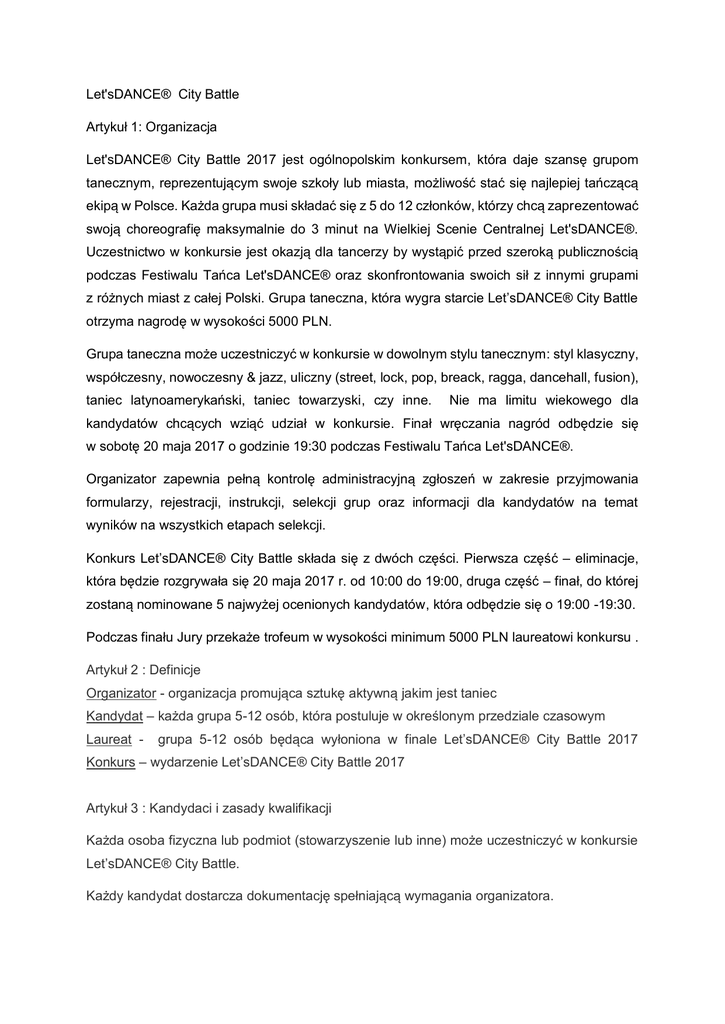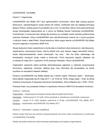 Let'sDANCE® City Battle Artykuł 1: Organizacja Let'sDANCE® City Battle 2017 jest ogólnopolskim konkursem, która daje szansę grupom tanecznym, reprezentującym swoje szkoły lub miasta, możliwość stać się najlepiej tańczącą ekipą w Polsce. Każda grupa musi składać się z 5 do 12 członków, którzy chcą zaprezentować swoją choreografię maksymalnie do 3 minut na Wielkiej Scenie Centralnej Let'sDANCE®. Uczestnictwo w konkursie jest okazją dla tancerzy by wystąpić przed szeroką publicznością podczas Festiwalu Tańca Let'sDANCE® oraz skonfrontowania swoich sił z innymi grupami z różnych miast z całej Polski. Grupa taneczna, która wygra starcie Let’sDANCE® City Battle otrzyma nagrodę w wysokości 5000 PLN. Grupa taneczna może uczestniczyć w konkursie w dowolnym stylu tanecznym: styl klasyczny, współczesny, nowoczesny & jazz, uliczny (street, lock, pop, breack, ragga, dancehall, fusion), taniec latynoamerykański, taniec towarzyski, czy inne. Nie ma limitu wiekowego dla kandydatów chcących wziąć udział w konkursie. Finał wręczania nagród odbędzie się w sobotę 20 maja 2017 o godzinie 19:30 podczas Festiwalu Tańca Let'sDANCE®. Organizator zapewnia pełną kontrolę administracyjną zgłoszeń w zakresie przyjmowania formularzy, rejestracji, instrukcji, selekcji grup oraz informacji dla kandydatów na temat wyników na wszystkich etapach selekcji. Konkurs Let’sDANCE® City Battle składa się z dwóch części. Pierwsza część – eliminacje, która będzie rozgrywała się 20 maja 2017 r. od 10:00 do 19:00, druga część – finał, do której zostaną nominowane 5 najwyżej ocenionych kandydatów, która odbędzie się o 19:00 -19:30. Podczas finału Jury przekaże trofeum w wysokości minimum 5000 PLN laureatowi konkursu . Artykuł 2 : Definicje Organizator - organizacja promująca sztukę aktywną jakim jest taniec Kandydat – każda grupa 5-12 osób, która postuluje w określonym przedziale czasowym Laureat - grupa 5-12 osób będąca wyłoniona w finale Let’sDANCE® City Battle 2017 Konkurs – wydarzenie Let’sDANCE® City Battle 2017 Artykuł 3 : Kandydaci i zasady kwalifikacji Każda osoba fizyczna lub podmiot (stowarzyszenie lub inne) może uczestniczyć w konkursie Let’sDANCE® City Battle. Każdy kandydat dostarcza dokumentację spełniającą wymagania organizatora. Kandydaci zakwalifikowani do udziału w konkursie muszą dostarczyć zaświadczenie lekarskie o zdolności do wykonywania praktyki w zakresie tańca. Kandydaci, którzy nie ukończyli jeszcze 18 roku życia zobowiązani są dostarczyć zgodę rodzica bądź prawnego opiekuna. Jedna szkoła/organizacja/stowarzyszenie może być reprezentowana przez maksymalnie 3 grupy. Grupa biorąca udział w konkursie musi składać się z 5-12 uczestników. Artykuł 4: Kryteria oceny Ocena będzie liczona jako suma punktów uzyskanych w ramach każdej z kategorii. Kandydat może łącznie uzyskać 100 punktów. Ocena kandydatów będzie składała się z następujących kategorii: pomysł na choreografię (40 punktów), wykonanie (wykonanie 35 punktów), muzykalność (20 punktów) oraz ogólne wrażenie ( 5 punktów). Kandydat (grupa taneczna) musi składać się z 5-12 członków, z których każda osoba uiszcza opłatę rejestracyjną. Kandydat, który uzyska najlepsze oceny końcowe, zostanie wyłoniony jako laureat konkursu Let’sDANCE® City Battle, której zostanie przyznana nagroda podczas ceremonii wręczania nagród w sobotę 20 maja 2017 roku. Let’sDANCE® City Battle będzie trwało przez cały dzień Festiwalu Tańca Let’sDANCE® w sobotę 20 maja 2017. Narada jury odbędzie się w sobotę 20 maja 2017 przed finałem wręczania nagród. Artykuł 5: Formularz zgłoszeniowy i jego elementy Kandydat może zapisać się do udziału w konkursie Let’sDANCE® City Battle przez stronę internetową letsdancepoland.com. Procedura zapisu ma charakter pisemny. Kandydat jest zobowiązany do pobrania formularza ze strony letsdancepoland.com : Pobierz formularz rejestracyjny do Let’sDANCE® City Battle Po zarejestrowaniu i weryfikacji kompletności dokumentów, każdy z członków grupy uiszcza opłatę rejestracyjną (opłata rejestracyjna zawiera podatek VAT) 65 PLN opłata rejestracyjna Let’sDANCE® City Battle (w tym bilet jednodniowy) 55 PLN opłata rejestracyjna Let’sDANCE® City Battle (do lat 15) (w tym bilet jednodniowy) 85 PLN opłata rejestracyjna Let’sDANCE® City Battle (w tym bilet dwudniowy) 75 PLN opłata rejestracyjna Let’sDANCE® City Battle (do lat 15) (w tym bilet dwudniowy) Termin zgłaszania kandydatów będzie otwarty od 1 lutego 2017 roku do 30 kwietnia 2017 roku. Kandydat dostanie mailowe potwierdzenie jego rejestracji do konkursu Let’sDANCE® City Battle. Artykuł 6: Obowiązki kandydatów Udział w konkursie oznacza akceptację oraz respektowanie przez kandydata regulaminu uczestnictwa w konkursie. Kandydaci muszą również zapewnić, że posiadają niezbędne prawa do wykorzystywania choreografii i muzyki lub innej twórczości intelektualnej. Każde naruszenie popełnione w zakresie praw autorskich chronionych przez kodeks prawny zobowiązuje kandydata z wyłączenia z odpowiedzialności organizatora. Każdy z kandydatów akceptuje warunki rejestracji i uczestnictwa w konkursie. Kandydat nie może domagać się zwrotu opłaty po tym jak jego rejestracja została sfinalizowana. Zawiadomienie: 1- Kandydaci zostaną zawiadomieni nie później niż 14 maja 2017 o szczegółach dotyczących ich wystąpienia na scenie w ramach konkursu. Informacje ogólne na temat Let’sDANCE® City Battle będą podawane do wiadomości kandydatów od 1 lutego 2017. Kandydaci są proszeni o wysłanie na adres mailowy [email protected] potwierdzenia w tytule maila wpisując Rejestracja-Let’sDANCE® City Battle 2017, w treści podając nazwę grupy, dane uczestników wchodzących w skład grupy oraz styl tańca, który chcą zaprezentować ( za