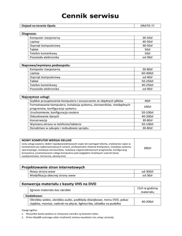 Cennik serwisu Dojazd na terenie Opola GRATIS !!! Diagnoza: Komputer stacjonarny Laptop Osprzęt komputerowy Tablet Telefon komórkowy Pozostała elektronika 30-50zł 40-50zł 30-50zł 50zł 50zł od 30zł Naprawa/wymiana podzespołu: Komputer stacjonarny Laptop Osprzęt komputerowy Tablet Telefon komórkowy Pozostała elektronika 30-80zł 60-400zł od 40zł 50-250zł 40-250zł od 40zł Najczęstsze usługi: Szybkie przyspieszenie komputera i oczyszczenie ze zbędnych plików Formatowanie komputera, instalacja systemu, sterowników, niezbędnych programów, konfiguracja systemu Uruchomienie, konfiguracja routera Odzyskiwanie danych Konserwacja Wymiana ekranu w telefonie/tablecie Doradztwo w zakupie i rozbudowie sprzętu 40zł 100zł 50-100zł 40-200zł 30-80zł 50-100zł 30-80zł NOWY KOMPUTER WERSJA DELUXE Cena usługi zawiera: dobór najodpowiedniejszych części do wymagao klienta, znalezienie części w hurtowniach po najkorzystniejszych cenach, profesjonalne złożenie komputera, instalacja systemu operacyjnego, instalacja sterowników, instalacja najpotrzebniejszych programów, konfigurację komputera, przetestowanie całego komputera pod względem możliwych usterek (testy wydajnościowe, termiczne, akustyczne) 300zł Projektowanie stron internetowych Nowa strona www Modyfikacja obecnej strony www od 300zł od 30zł Konwersja materiału z kasety VHS na DVD Zgranie materiału bez obróbki Dodatkowo: Obróbka wideo, obróbka audio, podkłady dźwiękowe, menu DVD, pokaz slajdów, montaż, nadruki na płycie, lightscribe, okładka na pudełko Uwagi ogólne: 1. Wszystkie kwoty podane w niniejszym cenniku są kwotami netto. 2. Firma Aleja88 zastrzega sobie możliwośd zmiany wysokości cen usług i prowizji. 15zł za godzinę materiału 40-200zł