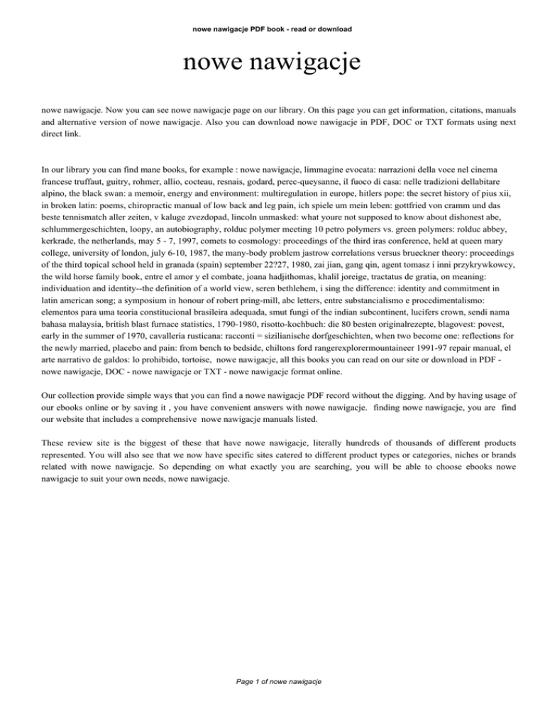 nowe nawigacje PDF book - read or download nowe nawigacje nowe nawigacje. Now you can see nowe nawigacje page on our library. On this page you can get information, citations, manuals and alternative version of nowe nawigacje. Also you can download nowe nawigacje in PDF, DOC or TXT formats using next direct link. In our library you can find mane books, for example : nowe nawigacje, limmagine evocata: narrazioni della voce nel cinema francese truffaut, guitry, rohmer, allio, cocteau, resnais, godard, perec-queysanne, il fuoco di casa: nelle tradizioni dellabitare alpino, the black swan: a memoir, energy and environment: multiregulation in europe, hitlers pope: the secret history of pius xii, in broken latin: poems, chiropractic manual of low back and leg pain, ich spiele um mein leben: gottfried von cramm und das beste tennismatch aller zeiten, v kaluge zvezdopad, lincoln unmasked: what youre not supposed to know about dishonest abe, schlummergeschichten, loopy, an autobiography, rolduc polymer meeting 10 petro polymers vs. green polymers: rolduc abbey, kerkrade, the netherlands, may 5 - 7, 1997, comets to cosmology: proceedings of the third iras conference, held at queen mary college, university of london, july 6-10, 1987, the many-body problem jastrow correlations versus brueckner theory: proceedings of the third topical school held in granada (spain) september 22?27, 1980, zai jian, gang qin, agent tomasz i inni przykrywkowcy, the wild horse family book, entre el amor y el combate, joana hadjithomas, khalil joreige, tractatus de gratia, on meaning: individuation and identity--the definition of a world view, seren bethlehem, i sing the difference: identity and commitment in latin american song; a symposium in honour of robert pring-mill, abc letters, entre substancialismo e procedimentalismo: elementos para uma teoria constitucional brasileira adequada, smut fungi of the indian subcontinent, lucifers crown, sendi nama bahasa malaysia, british blast furnace statistics, 1790-1980, risotto-kochbuch: die 80 besten originalrezepte, blagovest: povest, early in the summer of 1970, cavalleria rusticana: racconti = sizilianische dorfgeschichten, when two become one: reflections for the newly married, placebo and pain: from bench to bedside, chiltons ford rangerexplorermountaineer 1991-97 repair manual, el arte narrativo de galdos: lo prohibido, tortoise, nowe nawigacje, all this books you can read on our site or download in PDF nowe nawigacje, DOC - nowe nawigacje or TXT - nowe nawigacje format online. Our collection provide simple ways that you can find a nowe nawigacje PDF record without the digging. And by having usage of our ebooks online or by saving it , you have convenient answers with nowe nawigacje. finding nowe nawigacje, you are find our website that includes a comprehensive nowe nawigacje manuals listed. These review site is the biggest of these that have nowe nawigacje, literally hundreds of thousands of different products represented. You will also see that we now have specific sites catered to different product types or categories, niches or brands related with nowe nawigacje. So depending on what exactly you are searching, you will be able to choose ebooks nowe nawigacje to suit your own needs, nowe nawigacje. Page 1 of nowe nawigacje