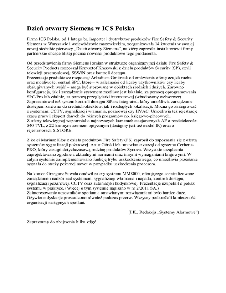Dzień otwarty Siemens w ICS Polska Firma ICS Polska, od 1 lutego br. importer i dystrybutor produktów Fire Safety & Security Siemens w Warszawie i województwie mazowieckim, zorganizowała 14 kwietnia w swojej nowej siedzibie pierwszy „Dzień otwarty Siemens”, na który zaprosiła instalatorów i firmy partnerskie chcące bliżej poznać nowości produktowe tego producenta. Od przedstawienia firmy Siemens i zmian w strukturze organizacyjnej działu Fire Safety & Security Products rozpoczął Krzysztof Krasowski z działu produktów Security (SP), czyli telewizji przemysłowej, SSWiN oraz kontroli dostępu. Prezentacje produktowe rozpoczął Arkadiusz Gmitrzak od omówienia oferty czujek ruchu oraz możliwości central SPC, które – w zależności od liczby użytkowników czy liczby obsługiwanych wejść – mogą być stosowane w obiektach średnich i dużych. Zarówno konfiguracja, jak i zarządzanie systemem możliwe jest lokalnie, za pomocą oprogramowania SPC-Pro lub zdalnie, za pomocą przeglądarki internetowej (wbudowany webserwer). Zaprezentował też system kontroli dostępu SiPass integrated, który umożliwia zarządzanie dostępem zarówno do średnich obiektów, jak i rozległych lokalizacji. Można go zintegrować z systemami CCTV, sygnalizacji włamania, pożarowej czy HVAC. Umożliwia też rejestrację czasu pracy i eksport danych do różnych programów np. księgowo-płacowych. Z oferty telewizyjnej wspomniał o najnowszych kamerach stacjonarnych AF o rozdzielczości 540 TVL, z 22-krotnym zoomem optycznym (dostępny jest też model IR) oraz o rejestratorach SISTORE. Z kolei Mariusz Kłos z działu produktów Fire Safety (FS) zaprosił do zapoznania się z ofertą systemów sygnalizacji pożarowej. Artur Górski ich omawianie zaczął od systemu Cerberus PRO, który zastąpi dotychczasową rodzinę produktów Synova. Wszystkie urządzenia zaprojektowano zgodnie z aktualnymi normami oraz innymi wymaganiami krajowymi. W całym systemie zaimplementowano funkcję trybu uszkodzeniowego, co umożliwia przesłanie sygnału do straży pożarnej nawet w przypadku uszkodzenia procesora. Na koniec Grzegorz Suwała omówił zalety systemu MM8000, oferującego scentralizowane zarządzanie i nadzór nad systemami sygnalizacji włamania i napadu, kontroli dostępu, sygnalizacji pożarowej, CCTV oraz automatyki budynkowej. Prezentację uzupełnił o pokaz systemu w praktyce. (Więcej o tym systemie napisano w nr 2/2011 SA.) Zainteresowanie uczestników spotkania omawianymi rozwiązaniami było bardzo duże. Ożywione dyskusje prowadzono również podczas przerw. Wszyscy podkreślali konieczność organizacji następnych spotkań. (I.K., Redakcja „Systemy Alarmowe”) Zapraszamy do obejrzenia kilku zdjęć. źródło: http://systemyalarmowe.com.pl/index.php/pl/relacje/634-dzie-otwary-siemens-w-icspolska
