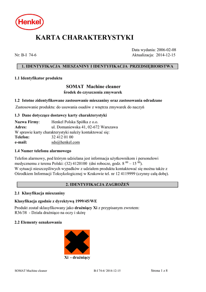 KARTA CHARAKTERYSTYKI Data wydania: 2006-02-08 Aktualizacja: 2014-12-15 Nr: B-I 74-6 1. IDENTYFIKACJA MIESZANINY I IDENTYFIKACJA PRZEDSIĘBIORSTWA 1.1 Identyfikator produktu SOMAT Machine cleaner środek do czyszczenia zmywarek 1.2 Istotne zidentyfikowane zastosowanie mieszaniny oraz zastosowania odradzane Zastosowanie produktu: do usuwania osadów z wnętrza zmywarek do naczyń 1.3 Dane dotyczące dostawcy karty charakterystyki Nazwa Firmy: Henkel Polska Spółka z o.o. Adres: ul. Domaniewska 41, 02-672 Warszawa W sprawie karty charakterystyki należy kontaktować się: Telefon: 32 412 01 00 e-mail: [email protected] 1.4 Numer telefonu alarmowego Telefon alarmowy, pod którym udzielana jest informacja użytkownikom i personelowi medycznemu z terenu Polski: (32) 4120100 (dni robocze, godz. 8 00 – 15 00). W sytuacji nieszczęśliwych wypadków z udziałem produktu kontaktować się można także z Ośrodkiem Informacji Toksykologicznej w Krakowie tel. nr 12 4119999 (czynny całą dobę). 2. IDENTYFIKACJA ZAGROŻEŃ 2.1 Klasyfikacja mieszaniny Klasyfikacja zgodnie z dyrektywą 1999/45/WE Produkt został sklasyfikowany jako drażniący Xi z przypisanym zwrotem: R36/38 - Działa drażniąco na oczy i skórę 2.2 Elementy oznakowania Xi - drażniący SOMAT Machine cleaner B-I 74-6/ 2014-12-15 Strona 1 z 8 Zwrot R: Działa drażniąco na oczy i skórę Zwroty S: Chronić przed dziećmi Unikać zanieczyszczenia skóry i oczu Zanieczyszczone oczy przemyć natychmiast dużą ilością wody i zasięgnąć porady lekarza W razie połknięcia niezwłocznie zasięgnij porady lekarza - pokazać opakowanie lub etykietę. Składniki, deklarowane zgodnie z załącznikiem VII A do Rozporządzenia (WE) Nr 648/2004 Parlamentu Europejskiego i Rady z dnia 31 marca 2004 w sprawie detergentów: 5 - 15 % niejonowe środki powierzchniowo czynne. Zawiera kompozycję zapachową . 2.3 Inne zagrożenia \ Brak w przypadku stosowania zgodnie z przeznaczeniem i w sposób zgodny z zaleceniami. 3. SKŁAD /INFORMACJA O SKŁADNIKACH MIESZANINY Niebezpieczne substancje z klasyfikacją wg dyrektywy 67/548/EWG, implementowanej do prawa polskiego w Rozporządzeniu Ministra Zdrowia z dnia 10.08.2012 r. w sprawie kryteriów i sposobu klasyfikacji substancji chemicznych i ich mieszanin: Zawartość [%] \ Substancja Symbol >=1,0 -<5,0 Xi Alkohole C13 – 15, etoksy- i butoksy-lowane; 12,6EO i 2,1 BuO C Kwas mrówkowy >=1,0 -<5,0 Kwas cytrynowy >=5,0 -<10,0 Xi Zwroty R CAS WE Nr rej. REACH Nie dotyczy - polimer 36/38 111905-53-4 10, 35 64-18-6 200-579-1 01-2119491174-37 36 77-92-9 201-069-1 01-2119457026-42 Substancje stwarzające zagrożenie z klasyfikacją wg rozporządzenia (WE) nr 1272/2008 (CLP): Kwas mrówkowy: Flammable liquids 3[ Substancje ciekłe łatwopalne kat. 3]; Skin Corr.1A [Działanie żrące na skórę, kategoria 1A], H314 Kwas cytrynowy: Eye Irrit.2 [Działanie drażniące na oczy, Kategoria 2], H319 Brzmienie zwrotów R i H – patrz sekcja 16 4. ŚRODKI PIERWSZEJ POMOCY 4.1 Opis środków pierwszej pomocy Ogólna informacja: przy wystąpieniu dolegliwości skonsultować się z lekarzem. Po zanieczyszczeniu oczu: płukać oczy pod bieżącą wodą (10 min.) i zasięgnąć porady okulisty. Po kontakcie ze skórą: zanieczyszczone powierzchnie skóry spłukać pod bieżącą wodą. Zdjąć zanieczyszczoną odzież. Po wdychaniu: osoby wrażliwe na zapach wyprowadzić na świeże powietrze, w przypadku wystąpienia trudności w oddychaniu skorzystać niezwłocznie z pomocy medycznej. Po połknięciu: nie wywoływać wymiotów. Wypłukać usta wodą (nie dotyczy osób nieprzytomnych). Natychmiast zasięgnąć porady lekarza. SOMAT Machine cleaner B-I 274-6/ 2014-12-15 Strona 2 z 8 4.2 Najważniejsze ostre i opóźnione objawy oraz skutki narażenia Przy narażeniu inhalacyjnym: podrażnienie dróg oddechowych, kaszel, a w przypadku większego (dłuższego) narażenia: skurcze krtani i płytki oddech. Po kontakcie ze skórą: przejściowe podrażnienie skóry (zaczerwienienie, pieczenie, opuchlizna) Po kontakcie z oczami: podrażnienie o średniej do mocnej intensywności (zaczerwienienie, pieczenie, spuchnięcie, łzawienie) Po połknięciu: możliwe jest podrażnienie jamy ustnej, przełyku i całego przewodu pokarmowego, wystąpienie biegunki i wymiotów. Wymiociny mogą dostać się do dróg oddechowych powodując uszkodzenie płuc (aspiracja). 4.3 Wskazania dotyczące wszelkiej natychmiastowej pomocy lekarskiej i szczególnego postępowania z poszkodowanym. Po połknięciu: nie wywoływać wymiotów. Podać jednorazowo niegazowany napój (wodę lub herbatę). W przypadku połknięcia większych lub nieznanych ilości produktu podać środek antypienny (Dimeticon lub Simeticon). 5. POSTĘPOWANIE W PRZYPADKU POŻARU 5.1 Środki gaśnicze: Odpowiednie środki gaśnicze: Wszystkie powszechnie stosowane. W miarę możliwości unikać pełnego strumienia wody. W stadium początkowym pożaru mogą być stosowane gaśnice wszelkich typów. Należy uwzględnić zalecenia dotyczące środków gaśniczych odpowiednich do materiałów składowanych w pobliżu. Produkt nie ulega samozapłonowi. Niewłaściwe środki gaśnicze: brak danych. 5.2 Szczególne zagrożenia związane z mieszaniną Podczas pożaru mogą powstawać tlenek węgla oraz stwarzające zagrożenie produkty pirolizy 5.3 Informacje dla straży pożarnej: Produkt jest palny, nie ulega samozapłonowi W strefie zagrożenia należy stosować niezależne izolujące aparaty oddechowe.. 6. POSTĘPOWANIE W PRZYPADKU NIEZAMIERZONEGO UWOLNIENIA DO ŚRODOWISKA 6.1 Indywidualne środki ostrożności, wyposażenie ochronne i procedury w sytuacjach awaryjnych Unikać pośliźnięcia na rozlanym produkcie. Unikać kontaktu z oczami i ze skórą. Zapewnić dostateczną wentylację. 6.2. Środki ostrożności w zakresie ochrony środowiska Uniemożliwić przedostanie się do kanalizacji oraz do wód powierzchniowych i wód gruntowych. 6.3 Metody i materiały zapobiegające 