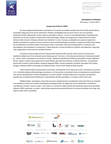 INFORMACJA PRASOWA Warszawa, 7 marca 2014 r. Inauguracja konkursu PNSA Na czym polega profesjonalizm sprzedawcy? Czy polski sprzedawca działa etycznie? W jaki sposób liderzy sprzedaży mogą przyczynid się do wdrożenia młodych przedsiębiorców do pracy? Na te oraz inne pytania, próbowali znaleźd odpowiedź, znawcy sektora sprzedaży w Polsce. 3 marca w sali balowej Pałacu TyszkiewiczówPotockich na terenie kampusu Uniwersytetu Warszawskiego, odbyła się Inauguracja VI edycji konkursu Polish National Sales Awards, którego zadaniem jest działanie na rzecz rozwoju przedsiębiorstw poprzez wspieranie działów sprzedaży przy jednoczesnym tworzeniu etosu profesjonalnego sprzedawcy. Inauguracja PNSA, była okazją do przedstawienia wyników badao, dotyczących etyki w sprzedaży, definicji profesjonalizmu w sektorze oraz postrzegania roli sprzedawcy w korporacji, a także dyskusji na temat kształcenia młodych sprzedawców i tego jaką rolę mogą pełnid w tym procesie, praktycy biznesu. Uroczyste otwarcie tegorocznej VI Edycji Polish National Sales Awards miało wymiar merytoryczny. Spotkanie odbyło się w formie dwóch paneli dyskusyjnych. Pierwszy z nich dotyczył prezentacji i omówienia badao pt. „Sami o sobie. Sprzedawcy we własnych oczach”. Badanie specjalnie dla PNSA przeprowadził instytut Millward Brown. Raport z badao zaprezentował dr Paweł Wójcik, New Business Director w Millward Brown. Uczestnikami panelu byli: Profesor Andrzej Blikle z Kapituły Nagrody PNSA, Tomasz Dakowski, Dyrektor Sprzedaży UPC Polska, Grzegorz Sobiecki, BMPS Consulting oraz Elżbieta Pełka, Prezes Polish National Sales Awards. Celem badania było przedstawienie wizerunku sprzedawców w ich własnych oczach. Pozwoliły one poznad m.in. charakterystykę profesjonalnego sprzedawcy, ich stanowisko w kwestiach etyki, przewidywania sprzedażowe oraz opinię sprzedawców na temat dostępnych na rynku szkoleo. Przeprowadzono je na grupie menedżerów, dyrektorów, przedstawicieli handlowych i pracowników działów sprzedaży, w miesiącu lutym 2014 roku. Według badao, sprzedawcy mają duże poczucie zaangażowania w budowaniu wizerunku firmy, jej rozwoju oraz pełnienia ważnej roli w dziale marketingu przedsiębiorstwa. W większości są też zadowoleni z możliwości i perspektyw rozwoju. Znaczna częśd z nich uważa, że uczciwośd wobec klienta jest podstawą skutecznej sprzedaży, jednak aż 68%, przyznaje, że często wykorzystuje ograniczoną wiedzę klientów na temat produktów lub usług, aby ułatwid sobie proces sprzedaży. - Badania wykazały, że wielu sprzedawców kieruje się pokusą osiągnięcia jak najwyższego wyniku finansowego, zapominając o satysfakcji i zadowoleniu klienta - twierdzi Elżbieta Pełka, prezes PNSA. –Handlowcy często zatajając informacje o produkcie czy mówiąc o nim nieprawdę, chcą jak najszybciej zakooczyd proces sprzedaży. Nie zdają sobie jednak sprawy, iż jest to działanie dające rezultaty tylko w krótkiej perspektywie czasu. Cele, jakie przyświecają PNSA, to propagowanie wartości etycznych, budowanie długofalowej relacji z klientem i skuteczna komunikacja w przedsiębiorstwie. Według mnie właśnie te wartości powinny stanowid trzon każdej firmy. Podobne stanowisko w tej sprawie zajmuje Profesor Andrzej Blikle, członek Kapituły Nagrody PNSA, który jest zdecydowanym przeciwnikiem takich nagannych zachowao. Dlatego zajmuje on zdecydowane stanowisko w tej sprawie i podkreśla, że należy kontynuowad tego rodzaju badania i dogłębnie zbadad zjawisko oraz jego przyczyny. Profesor twierdzi, że często to warunki skłaniają sprzedawców do nieetycznych zachowao. Ten fakt, nie tyle go dziwi, ile mocno niepokoi. Jego dewizą jest troska o klienta i wzbudzenie w nim rzeczywistego zainteresowania produktem. Zdanie Profesora tylko takie podejście gwarantuje, że klient wróci nawet, jeśli pierwotnie nie dokonał zakupu. -Raport odpowiada na pytanie czy warto, czy opłaca się byd sprzedawcą w Polsce, czy jesteś dumny z tego zawodu - mówi Ireneusz Martyniuk, Prezes Zarządu Polpharma Biuro Handlowe - Tak warto, ale wokół mnie są inni, którzy zachowują się źle i ma to negatywny wpływ na nasz wizerunek. Uważam, że chętnych do wykonywania tego zawodu będzie coraz więcej, o ile firmy staną na straży etycznych zachowao w procesie sprzedażowym. Przewidywania odnośnie sprzedaży produktów i usług w Polsce nie napawają optymizmem – dwie trzecie badanych sądzi, że w ciągu najbliższego roku sprzedaż będzie coraz trudniejsza. Fakt ten nie dziwi, ponieważ oferowane produkty, na tak konkurencyjnym rynku, stają się coraz bardziej skomplikowane. Dlatego aż 79% ankietowanych uważa, że profesjonalny sprzedawca musi dogłębnie znad swój produkt i rynek, na którym działa oraz umied budowad długofalowe relacje z klientami. Grzegorz Sobiecki z firmy BMS Consulting, w nawiązaniu do badao stwierdził, że podstawą procesu sprzedażowego powinno byd właśnie długotrwałe budowanie kontaktów z klientem i uczciwośd. Podkreślił także ważną rolę, jaką pełni PNSA w sektorze sprzedaży: Naszemu rynkowi potrzebna jest organizacja taka jak Polish National Sales Awards, gdzie w procesie oceny na równi stawia się wyniki sprzedaży i sposób postępowania. Drugi panel dyskusyjny z kolei dotyczył roli, jaką odgrywają praktycy biznesu dla młodych sprzedawców. Paneliści debatowali na temat systemu edukacji w służbie młodym sprzedawcom, metod wdrażania adeptów do pracy w ich organizacjach, kryteriów oceny efektywności oraz systemu ich nagradzania w organizacji. Głos w tej sprawie zabrali: Ewa Kudlioska-Pyrz, Przewodnicząca Zarządu Polskiego Stowarzyszenia Sprzedaży Bezpośredniej, Adam Jarubas, Marszałek Województwa Świętokrzyskiego, Lech Pilawski, Dyrektor Generalny Konfederacji Lewiatan, Rajmund I. Martyniuk, Prezes Zarządu Polpharma Biuro Handlowe oraz Tomasz Ambroziak, Kierownik ds.