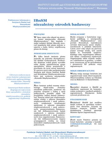 Podstawowe informacje o Instytucie Badań nad Stosunkami Międzynarodowymi IBnSM niezależny ośrodek badawczy POCZĄTKI DZIAŁALNOŚĆ W lipcu 1999 roku ukazał się pierw- Osoby związane z Instytutem regularnie publikują w miesięczniku „Stosunki Międzynarodowe” oraz portalu Stosunki.pl, największym serwisie dotyczącym spraw międzynarodowych w polskim Internecie. Latem 2007 roku ukaże się pierwszy numer nowego tytułu, tym razem będzie to kwartalnik naukowy. Każdego roku organizujemy kilkanaście debat i konferencji naukowych. Organizujemy także wyjazdy naukowe i szkoleniowe za granicą, a redaktorzy towarzyszą od lat prezydentowi i premierowi RP podczas wizyt zagranicznych. szy numer miesięcznika „Stosunki Międzynarodowe”. Bez kapitału i stałej redakcji Michał Sikorski stworzył popularne dziś pismo jedynie w oparciu o ludzi, którzy współtworzą pismo do dzisiaj. POWSTANIE INSTYTUTU Po kilku latach istnienia pisma Głównym realizowanym przez Instytut zadaniem jest wydawanie ogólnopolskiego miesięcznika „Stosunki Międzynarodowe”. pojawiła się potrzeba sformalizowania działań wydawniczych. Środowisko skupione wokół gazety wyrobiło sobie markę opiniotwórczej grupy specjalistów, którzy postanowili o powołaniu do życia nowej instytucji. W czerwcu 2003 roku zarejestrowano fundację pod nazwą Instytut Badań nad Stosunkami Międzynarodowymi, który jest wydawcą miesięcznika „Stosunki Międzynarodowe”. MISJA Nasz Instytut zyskał renomę niezaInstytut jest think-tankiem skupiającym najwyższej klasy specjalistów z dziedzin stosunków międzynarodowych, polityki zagranicznej i dyplomacji. leżnego think-tanku. Jesteśmy niezależni politycznie, ponieważ nie jesteśmy związani z żadną z opcji politycznych, ponadto nigdy nie przyjęliśmy żadnej dotacji państwowej. Naszym celem jest rozpowszechnianie wiedzy z zakresu stosunków międzynarodowych i nauk pokrewnych, zwiększanie świadomości społecznej w zakresie stosunków międzynarodowych i nauk pokrewnych, przeprowadzanie, finansowanie lub dofinansowywanie badań naukowych z zakresu stosunków międzynarodowych i nauk pokrewnych oraz organizowanie, finansowanie lub dofinansowywanie imprez propagujących wiedzę na temat stosunków międzynarodowych i nauk pokrewnych. MISJE OBSERWACYJNE Ważną misją naszego Instytutu jest organizowanie misji obserwacyjnych. Obserwowaliśmy wybory na Ukrainie oraz na Białorusi i w Kazachstanie. MEDIA Specjaliści skupieni w IBnSM są regularnie zapraszani do komentowania wydarzeń w mediach polskich i zagranicznych. Miesięczna liczba cytowań przekracza 20. FINANSOWANIE Działalność IBnSM jest możliwa dzięki zyskom ze sprzedaży wydawnictw oraz darowizn. Liczymy na Państwa wsparcie. Nadzór nad działalnością Fundacji sprawuje Minister Spraw Zagranicznych. KONTAKT Jeżeli macie Państwo pytania na temat Instytutu– prosimy o kontakt: [email protected], tel. (22) 498 15 37. Fundacja Instytut Badań nad Stosunkami Międzynarodowymi ul. Ordynacka 11/5, 00-364 Warszawa tel. (22) 498 15 37, e-mail: [email protected] Bank Przemysłowo-Handlowy PBK S.A. 75 1060 0076 0000 3200 0086 4692