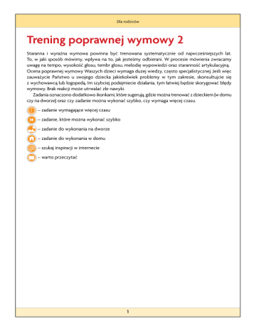Dla rodziców Trening poprawnej wymowy 2 Staranna i wyraźna wymowa powinna być trenowana systematycznie od najwcześniejszych lat. To, w jaki sposób mówimy, wpływa na to, jak jesteśmy odbierani. W procesie mówienia zwracamy uwagę na tempo, wysokość głosu, tembr głosu, melodię wypowiedzi oraz staranność artykulacyjną. Ocena poprawnej wymowy Waszych dzieci wymaga dużej wiedzy, często specjalistycznej. Jeśli więc zauważycie Państwo u swojego dziecka jakiekolwiek problemy w tym zakresie, skonsultujcie się z wychowawcą lub logopedą. Im szybciej podejmiecie działania, tym łatwiej będzie skorygować błędy wymowy. Brak reakcji może utrwalać złe nawyki. Zadania oznaczono dodatkowo ikonkami, które sugerują, gdzie można trenować z dzieckiem (w domu czy na dworze) oraz czy zadanie można wykonać szybko, czy wymaga więcej czasu. – zadanie wymagające więcej czasu – zadanie, które można wykonać szybko – zadanie do wykonania na dworze – zadanie do wykonania w domu – szukaj inspiracji w internecie – warto przeczytać 1 Dla rodziców • Trening poprawnej wymowy 2 Zadanie 1. Niesforne baloniki Jak to wykonać? 1.Wykonajcie wspólnie z dzieckiem następujące czynności: • nadymanie jednego policzka i przesuwanie powietrza z jednej strony jamy ustnej na drugą – wargi złączone; • nadymanie policzków z uwolnieniem nagromadzonego w jamie ustnej powietrza; schodzące powietrze powoduje szmer, który przypomina wymowę głoski „p”; • nadmuchiwanie gumowych zabawek, baloników, puszczanie baniek mydlanych. Zadanie 2. Trening aparatu artykulacyjnego Jak to wykonać? 1. Poproś dziecko, żeby naśladowało następujące zwierzęta i postaci, wykonując określone czynności: • zając – wciąganie policzków do jamy ustnej; policzki przylegają do łuków zębowych, wargi tworzą zajęczy pyszczek; • łakomczuszek – oblizywanie warg (usta szeroko otwarte) ruchem okrężnym: w prawo i w lewo; • zmęczony piesek – wysuwanie języka na brodę. 2.Następnie niech dziecko imituje: • wąsy – trzymanie słomki między nosem a górną wargą; 3.Niech pobawi się: • zabawa w chowanego – wysuwa język na zewnątrz i cofa w głąb jamy ustnej; następnie niech wykonuje językiem poziome ruchy od prawej do lewej, wewnętrznej ściany policzka. Zadanie 3. Zabawa utrwalająca wymowę głoski „sz” Jak to wykonać? 1. Na początku niech dziecko wykonuje ruchy: • język podnosi do góry, do podniebienia, nie wysuwa go z jamy ustnej; • zsuwa zęby; • wargi wysuwa do przodu, robiąc „dziobek”; • dmucha na czubek języka. 2.Naśladowanie szumu drzew – dziecko długo wymawia głoskę „sz”: • sz... sz... sz... 3.Dziecko powtarza sylaby z głoską „sz”: • sza, sze, szo, szu, szy; • asz, esz, osz, usz, ysz; • asza, esze, oszo, uszu, yszy. 2 Dla rodziców • Trening poprawnej wymowy 2 Zadanie 4. Zabawa ze słomką Doskonałym treningiem narządów mowy jest rozdmuchiwanie piasku przez słomkę. Co przygotować? • drobny, przesiany piasek (świetnie sprawdza się piasek nadmorski); • tacka lub podkładka; • słomka. Jak to wykonać? 1. Poproś dziecko, by za pomocą piasku i słomki tworzyło dowolne piaskowe obrazki. Można różnicować kąt ustawienia słomki, siłę i sposób dmuchania. Najwygodniej byłoby wykonać to zadanie, gdyby dziecko mogło obchodzić tackę dookoła. Może też dmuchać na siedząco i ostrożnie okręcać tackę. 3
