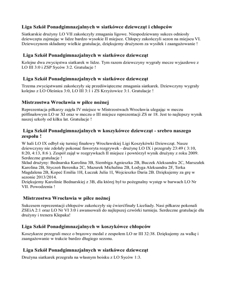 Liga Szkół Ponadgimnazjalnych w siatkówce dziewcząt i chłopców Siatkarskie drużyny LO VII zakończyły zmagania ligowe. Niespodziewany sukces odniosły dziewczęta zajmując w lidze bardzo wysokie II miejsce. Chłopcy zakończyli sezon na miejscu VI. Dziewczynom składamy wielkie gratulacje, dziękujemy drużynom za wysiłek i zaangażowanie ! Liga Szkół Ponadgimnazjalnych w siatkówce dziewcząt Kolejne dwa zwycięstwa siatkarek w lidze. Tym razem dziewczyny wygrały mecze wyjazdowe z LO III 3:0 i ZSP Syców 3:2. Gratulacje ! Liga Szkół Ponadgimnazjalnych w siatkówce dziewcząt Trzema zwycięstwami zakończyły się przedświąteczne zmagania siatkarek. Dziewczyny wygrały kolejno z LO Oleśnica 3:0, LO III 3:1 i ZS Krzyżowice 3:1. Gratulacje ! Mistrzostwa Wrocławia w piłce nożnej Reprezentacja piłkarzy zajęła IV miejsce w Mistrzostwach Wrocławia ulegając w meczu półfinałowym LO nr XI oraz w meczu o III miejsce reprezentacji ZS nr 18. Jest to najlepszy wynik naszej szkoły od kilku lat. Gratulacje ! Liga Szkół Ponadgimnazjalnych w koszykówce dziewcząt - srebro naszego zespołu ! W hali LO IX odbył się turniej finałowy Wrocławskiej Ligi Koszykówki Dziewcząt. Nasze dziewczyny nie zdołały pokonać faworyta rozgrywek - drużynę LO IX i przegrały 23:49 ( 3:10, 8:20, 4:13, 8:6 ). Zespół zajął w rozgrywkach II miejsce i powtórzył wynik drużyny z roku 2009. Serdeczne gratulacje ! Skład drużyny: Bednarska Karolina 3B, Siembiga Agnieszka 2B, Buczek Aleksandra 2C, Marszałek Karolina 2B, Styczeń Berenika 2C, Mazurek Michalina 2B, Łodyga Aleksandra 2F, Terka Magdalena 2B, Kopeć Emilia 1H, Łuczak Julia 1I, Wojcieszko Daria 2B. Dziękujemy za grę w sezonie 2013/2014. Dziękujemy Karolinie Bednarskiej z 3B, dla której był to pożegnalny występ w barwach LO Nr VII. Powodzenia ! Mistrzostwa Wrocławia w piłce nożnej Sukcesem reprezentacji chłopców zakończyły się ćwierćfinały Liceliady. Nasi piłkarze pokonali ZSEiA 2:1 oraz LO Nr VI 3:0 i awansowali do najlepszej czwórki turnieju. Serdeczne gratulacje dla drużyny i trenera Klepaka! Liga Szkół Ponadgimnazjalnych w koszykówce chłopców Koszykarze przegrali mecz o brązowy medal z zespołem LO nr III 32:38. Dziękujemy za walkę i zaangażowanie w trakcie bardzo długiego sezonu. Liga Szkół Ponadgimnazjalnych w siatkówce dziewcząt Drużyna siatkarek przegrała na własnym boisku z LO Syców 1:3. Mistrzostwa Wrocławia w piłce nożnej Nasza reprezentacja awansowała do ćwierćfinału Licealiady Wrocławskiej. Drużyna wygrała w grupie eliminacyjnej z ZS nr 18 2:1 i zremisowała z LO nr X 1:1. Gratulacje ! Liga Szkół Ponadgimnazjalnych w siatkówce chłopców Siatkarze przegrali w ostatnim meczu ligi z ZS nr 18 0:3. Liga Szkół Ponadgimnazjalnych w koszykówce chłopców Koszykarze przegrali w meczu półfinałowym ligi koszykówki z zespołem LO nr IX 49:57 i w czwartek 10.04 powalczą o brązowe medale z LO nr III. W Hali Sportowej WKS przy ulicy Mieszczańskiej rozegrany zostanie Finał oraz mecz o 3 miejsce Wrocławskiej Ligi SPG chłopców według harmonogramu: Mecz o 3 miejsce: LO III - LO VII godz. 12.00 Mecz o 1 miejsce: LO IX - LO VI godz. 13.15 Zakończenie około 14.15 Liga Szkół Ponadgimnazjalnych w koszykówce dziewcząt - półfinał Nasze koszykarki osiągnęły spory sukces pokonując po twardej walce w półfinale wyżej notowany zespół LO nr XVII 55:48. W ostatniej kwarcie dwie nasze zawodniczki zmuszone były opuścić boisko za pięć przewinień, mimo to udało się utrzymać wcześniej wypracowaną przewagę i wygrać. W finale, który odbędzie się 14.04 w sali LO nr IX naszym przeciwnikiem będzie bardzo silny zespół gospodarza zawodów. Serdeczne gratulacje dla naszych dziewczyn i podziękowania za ofiarną walkę ! Liga Szkół Ponadgimnazjalnych w siatkówce dziewcząt Siatkarki wygrały na własnym boisku z Zespołem Szkół Gastronomicznych 3:0. Gratulacje ! Liga Szkół Ponadgimnazjalnych w siatkówce chłopców Siatkarze przegrali na własnym boisku z LO Oleśnica 2:3. Liga Szkół Ponadgimnazjalnych w siatkówce dziewcząt Dziewczęta przegrały na wyjeździe z ZS Milicz 1:3. Mistrzostwa Wrocławia w piłce ręcznej chłopców i dziewcząt Reprezentacja dziewcząt przegrała w ćwierćfinale Mistrzostw Wrocławia z ZS Nr 25 2:6 i zakończyła swój udział w turnieju na miejscu V - VIII. Wyniki w grupie: LO VII - LO XV 7:1, LO VII - LO IX 2:6, LO VII - ZSEiA 4:4 Reprezentacja chłopców pokonała w grupie LO XII 19:7, przegrała z ZS Nr 18 11:16 i swój ćwierćfinał rozegra 28.03. Liga Szkół Ponadgimnazjalnych w koszykówce dziewcząt W drugim meczu ćwierćfinałowym nasze koszykarki również wysoko pokonały reprezentantki ZS 3 70:6. Gratulujemy awansu do strefy medalowej ! Poniżej harmonogram półfinałów: 31 marzec LO IX - LO III godz. 15.30 ul. Piotra Skargi LO XVII - LO VII godz. 15.15 ul. Trwała Liga Szkół Ponadgimnazjalnych w koszykówce chłopców Koszykarze wygrali mecz ćwierćfinałowy z EZN 68:43 i awansowali do strefy medalowej ligi. Gratulacje ! Liga Szkół Ponadgimnazjalnych w koszykówce dziewcząt W pierwszym meczu ćwierćfinałowym koszykarki pokonały wysoko ZS Nr 3 70:8. Gratulacje ! Mistrzostwa Wrocławia w siatkówce chłopców Reprezentacja siatkarzy po porażkach z LO Nr X 0:2 i ZS Nr 18 0:2 zakończyła swój udział we Wrocławskiej Licealiadzie. Liga Szkół Ponadgimnazjalnych w koszykówce chłopców Koszykarze przegrali z EZN 40:41. W wyniku tej porażki gospodarzem meczu ćwierćfinałowego będzie drużyna EZN. Mistrzostwa Wrocławia w siatkówce dziewcząt Siatkarska reprezentacja dziewcząt zajęła V miejsce w Mistrzostwach Wrocławia. Dziewczyny rozegrały cztery mecze wygrywając dwa. Dziękujemy za walkę ! Wyniki: LO VII - LO VIII 2:0, LO VII - LO XIV 1:2, LO VII - LO IX 2:0, LO VII - LO XII 0:2. Liga Szkół Ponadgimnazjalnych w siatkówce chłopców Siatkarze wygrali w meczu wyjazdowym z