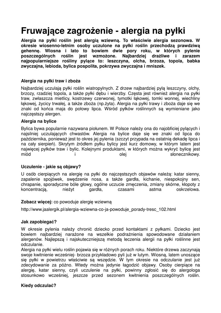 Fruwające zagrożenie - alergia na pyłki Alergia na pyłki roślin jest alergią wziewną. To właściwie alergia sezonowa. W okresie wiosenno-letnim osoby uczulone na pyłki roślin przechodzą prawdziwą gehennę. Wiosna i lato to bowiem dwie pory roku, w których pylenie poszczególnych roślin jest wzmożone. Najbardziej drażliwe i zarazem najpopularniejsze rośliny pylące to: leszczyna, olcha, brzoza, topola, babka zwyczajna, lebioda, bylica pospolita, pokrzywa zwyczajna i mniszek. Alergia na pyłki traw i zboża Najbardziej uczulają pyłki roślin wiatropylnych. Z drzew najbardziej pylą leszczyny, olchy, brzozy, rzadziej topola, a także pyłki dębu i wierzby. Częsta jest również alergia na pyłki traw, zwłaszcza mietlicy, kostrzewy czerwonej, tymotki łąkowej, tomki wonnej, wiechliny łąkowej, życicy trwałej, a także zboża (np.żyta). Alergia na pyłki trawy i zboża daje się we znaki od końca maja do połowy lipca. Wśród pyłków roślinnych są wymieniane jako najczęstszy alergen. Alergia na bylice Bylica bywa popularnie nazywana piołunem. W Polsce należy ona do najobficiej pylących i najsilniej uczulających chwastów. Alergia na bylice daje się we znaki od lipca do października, ponieważ jest to okres jej pylenia (szczyt przypada na ostatnią dekadę lipca i na cały sierpień). Skrytym źródłem pyłku bylicy jest kurz domowy, w którym latem jest najwięcej pyłków traw i bylic. Kolejnymi produktami, w których można wykryć bylicę jest miód i olej słonecznikowy. Uczulenie - jakie są objawy? U osób cierpiących na alergię na pyłki do najczęstszych objawów należą: katar sienny, zapalenie spojówek, swędzenie nosa, a także gardła, kichanie, niespokojny sen, chrapanie, sporadyczne bóle głowy, ogólne uczucie zmęczenia, zmiany skórne, kłopoty z koncentracją, nieżyt gardła, czasami astma oskrzelowa. Zobacz więcej: co powoduje alergię wziewną http://www.jaalergik.pl/alergia-wziewna-co-ja-powoduje_porady-tresc_102.html Jak zapobiegać? W okresie pylenia należy chronić dziecko przed kontaktami z pyłkami. Dziecko jest bowiem najbardziej narażone na wszelkie podrażnienia spowodowane działaniem alergenów. Najlepszą i najskuteczniejszą metodą leczenia alergii na pyłki roślinne jest odczulanie. Alergia na pyłki wielu roślin pojawia się w różnych porach roku. Niektóre drzewa zaczynają swoje kwitnienie wcześniej- brzoza przykładowo pyli już w lutym. Wiosną, latem unoszące się pyłki w powietrzu właściwie są wszędzie. W tym okresie na odczulanie jest już zdecydowanie za późno. Wtedy można jedynie łagodzić objawy. Osoby cierpiące na alergię, katar sienny, czyli uczulenie na pyłki, powinny zgłosić się do alergologa stosunkowo wcześniej, jeszcze przed sezonem kwitnienia poszczególnych roślin. Kiedy odczulać? Alergia na trawy i zboża oznacza, że już w lutym należy zacząć odczulanie. Cała kuracja polega na stopniowym przyzwyczajaniu organizmu do alergenu. Lekarz alergolog najczęściej przepisuje szczepionkę w postaci tabletek pod język albo tradycyjnych podskórnych zastrzyków. Szczepionka po okresie próbnym najczęściej zaczyna blokować rozwój substancji białkowych, które są źródłem objawów alergicznych. W przypadku alergii na pyłki chwastów odczulanie należy przeprowadzić w kwietniu. Chwasty bowiem pylą od połowy sierpnia, czasami nawet do połowy października. Przy alergii na pyłki drzew, kurację zaczynamy w październiku lub listopadzie, a po indywidualną szczepionkę należy zgłosić się pod koniec września. Jak unikać pyłków w okresie największego pylenia? W okresie największego pylenia należy zdecydowanie unikać miejsc, gdzie najmocniej pylą rośliny, na które jesteśmy uczuleni. W okresie największego pylenia zaleca się spędzanie czasu na świeżym powietrzu tylko rano po rosie albo deszczu. Należy odpowiednio się zabezpieczyć zakładając odpowiednie ubranie. Po powrocie z miejsc, gdzie występuje największe pylenie, dość ważne jest opłukanie skóry, a także zmiana odzieży, w celu pozbycia się osiadających pyłków. Jeżeli unikanie kontaktów z pyłkami nie jest skuteczne, to należy niezwłocznie zastosować odpowiednie leczenie. Lekarz-alergolog najczęściej zaleca doustne leki przeciwhistaminowe, a także krople do oczu lub nosa. Małe dzieci narażone na duże pylenie w okresie spacerów również należy odpowiednio zabezpieczyć poprzez stosowanie odzieży ochronnej, specjalnych kremów zabezpieczających, a także okularów przeciwsłonecznych, bowiem oczy w okresie pylenia są dość mocno narażone na podrażnienia. Anna Włoszek Redakcja portalu www.jaalergik.pl Artykuł zamieszczony w ramach akcji informacyjnej „Nie daj się alergii”. Więcej na temat akcji: www.jaalergik.pl/akcja_strona_101.html