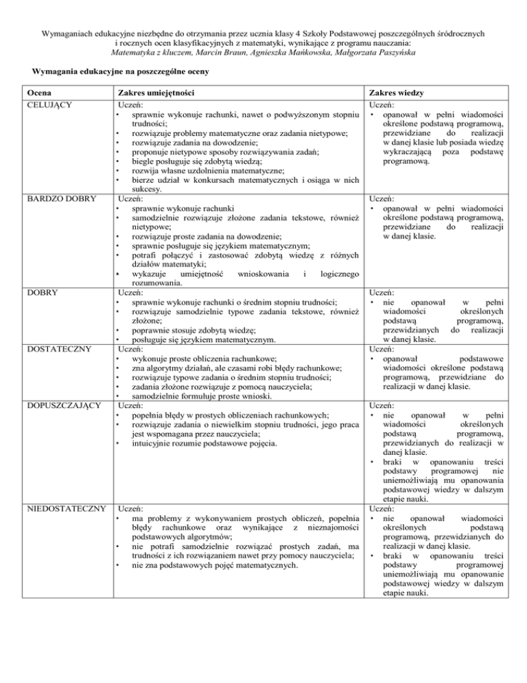 Wymaganiach edukacyjne niezbędne do otrzymania przez ucznia klasy 4 Szkoły Podstawowej poszczególnych śródrocznych i rocznych ocen klasyfikacyjnych z matematyki, wynikające z programu nauczania: Matematyka z kluczem, Marcin Braun, Agnieszka Mańkowska, Małgorzata Paszyńska Wymagania edukacyjne na poszczególne oceny Ocena CELUJĄCY BARDZO DOBRY DOBRY DOSTATECZNY DOPUSZCZAJĄCY NIEDOSTATECZNY Zakres umiejętności Uczeń: • sprawnie wykonuje rachunki, nawet o podwyższonym stopniu trudności; • rozwiązuje problemy matematyczne oraz zadania nietypowe; • rozwiązuje zadania na dowodzenie; • proponuje nietypowe sposoby rozwiązywania zadań; • biegle posługuje się zdobytą wiedzą; • rozwija własne uzdolnienia matematyczne; • bierze udział w konkursach matematycznych i osiąga w nich sukcesy. Uczeń: • sprawnie wykonuje rachunki • samodzielnie rozwiązuje złożone zadania tekstowe, również nietypowe; • rozwiązuje proste zadania na dowodzenie; • sprawnie posługuje się językiem matematycznym; • potrafi połączyć i zastosować zdobytą wiedzę z różnych działów matematyki; • wykazuje umiejętność wnioskowania i logicznego rozumowania. Uczeń: • sprawnie wykonuje rachunki o średnim stopniu trudności; • rozwiązuje samodzielnie typowe zadania tekstowe, również złożone; • poprawnie stosuje zdobytą wiedzę; • posługuje się językiem matematycznym. Uczeń: • wykonuje proste obliczenia rachunkowe; • zna algorytmy działań, ale czasami robi błędy rachunkowe; • rozwiązuje typowe zadania o średnim stopniu trudności; • zadania złożone rozwiązuje z pomocą nauczyciela; • samodzielnie formułuje proste wnioski. Uczeń: • popełnia błędy w prostych obliczeniach rachunkowych; • rozwiązuje zadania o niewielkim stopniu trudności, jego praca jest wspomagana przez nauczyciela; • intuicyjnie rozumie podstawowe pojęcia. Uczeń: • ma problemy z wykonywaniem prostych obliczeń, popełnia błędy rachunkowe oraz wynikające z nieznajomości podstawowych algorytmów; • nie potrafi samodzielnie rozwiązać prostych zadań, ma trudności z ich rozwiązaniem nawet przy pomocy nauczyciela; • nie zna podstawowych pojęć matematycznych. Zakres wiedzy Uczeń: • opanował w pełni wiadomości określone podstawą programową, przewidziane do realizacji w danej klasie lub posiada wiedzę wykraczającą poza podstawę programową. Uczeń: • opanował w pełni wiadomości określone podstawą programową, przewidziane do realizacji w danej klasie. Uczeń: • nie opanował w pełni wiadomości określonych podstawą programową, przewidzianych do realizacji w danej klasie. Uczeń: • opanował podstawowe wiadomości określone podstawą programową, przewidziane do realizacji w danej klasie. Uczeń: • nie opanował w pełni wiadomości określonych podstawą programową, przewidzianych do realizacji w danej klasie. • braki w opanowaniu treści podstawy programowej nie uniemożliwiają mu opanowania podstawowej wiedzy w dalszym etapie nauki. Uczeń: • nie opanował wiadomości określonych podstawą programową, przewidzianych do realizacji w danej klasie. • braki w opanowaniu treści podstawy programowej uniemożliwiają mu opanowanie podstawowej wiedzy w dalszym etapie nauki. Uczeń po klasie czwartej potrafi: 1. W zakresie sprawności rachunkowej uczeń: • wykonuje proste działania pamięciowe na liczbach naturalnych, • zna i stosuje algorytmy działań pisemnych (oprócz dzielenia) oraz wykorzystuje te umiejętności w sytuacjach praktycznych, • wykonuje dzielenie z resztą liczb naturalnych, • stosuje wygodne dla niego sposoby ułatwiające obliczenia, w tym przemienność i łączność dodawania i mnożenia, • rozpoznaje liczby naturalne podzielne przez 2, 3, 5, 9, 10, • oblicza kwadraty i sześciany liczb naturalnych, • dodaje i odejmuje ułamki zwykłe o jednakowych mianownikach, • dodaje i odejmuje ułamki dziesiętne (w prostych przykładach), • stosuje reguły dotyczące kolejności wykonywania działań, • szacuje wyniki działań, • posługuje się kalkulatorem, • interpretuje liczby naturalne na osi liczbowej, • porównuje liczby naturalne, • mnoży ułamki zwykłe przez liczby naturalne, • wykonuje obliczenia związane z czasem oraz jednostkami masy i pieniędzy, • dokonuje prawidłowego wyboru modelu matematycznego w celu rozwiązania zadania tekstowego (na poziomie elementarnym). 2. W zakresie wykorzystania i tworzenia informacji uczeń: • interpretuje i przetwarza informacje tekstowe, liczbowe, graficzne, w tabelach i na diagramach, • rozumie i interpretuje odpowiednie pojęcia matematyczne, • zna podstawową terminologię, • formułuje odpowiedzi i prawidłowo zapisuje wyniki. 3. W zakresie modelowania matematycznego uczeń: • dobiera odpowiedni model matematyczny do nieskomplikowanej sytuacji, • korzysta z prostych wzorów, w których występują oznaczenia literowe, zamienia wzór na formę słowną, • oblicza pola kwadratów i prostokątów przedstawionych na rysunkach oraz w sytuacjach praktycznych, • stosuje jednostki długości i ich zamianę, • przetwarza tekst zadania na działania arytmetyczne. 4. W zakresie kształcenia wyobraźni geometrycznej uczeń: • sprawnie posługuje się przyrządami matematycznymi, wykonując rysunki, • rozpoznaje i nazywa podstawowe figury geometryczne, w tym wielokąty, • rozpoznaje odcinki, proste prostopadłe i równoległe, • rozpoznaje i nazywa wielokąty oraz zna ich najważniejsze własności, • wskazuje wśród graniastosłupów prostopadłościany i sześciany. 5. W zakresie rozumowania i tworzenia strategii uczeń: • czyta ze zrozumieniem prosty tekst zawierający informacje liczbowe, • odczytuje dane ilościowe przedstawione w różny sposób (tabele, rysunki, mapy, diagramy), • dostrzega zależności matematyczne w otaczającym świecie, • ustala kolejność czynności (w tym