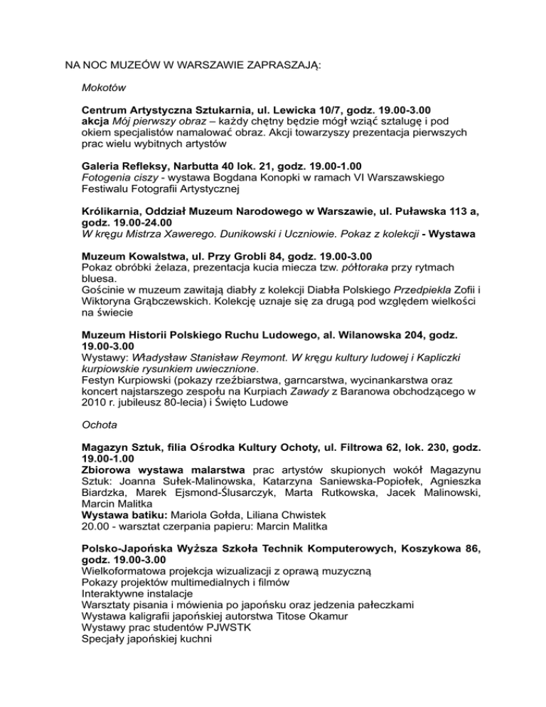 NA NOC MUZEÓW W WARSZAWIE ZAPRASZAJĄ: Mokotów Centrum Artystyczna Sztukarnia, ul. Lewicka 10/7, godz. 19.00-3.00 akcja Mój pierwszy obraz – każdy chętny będzie mógł wziąć sztalugę i pod okiem specjalistów namalować obraz. Akcji towarzyszy prezentacja pierwszych prac wielu wybitnych artystów Galeria Refleksy, Narbutta 40 lok. 21, godz. 19.00-1.00 Fotogenia ciszy - wystawa Bogdana Konopki w ramach VI Warszawskiego Festiwalu Fotografii Artystycznej Królikarnia, Oddział Muzeum Narodowego w Warszawie, ul. Puławska 113 a, godz. 19.00-24.00 W kręgu Mistrza Xawerego. Dunikowski i Uczniowie. Pokaz z kolekcji - Wystawa Muzeum Kowalstwa, ul. Przy Grobli 84, godz. 19.00-3.00 Pokaz obróbki żelaza, prezentacja kucia miecza tzw. półtoraka przy rytmach bluesa. Gościnie w muzeum zawitają diabły z kolekcji Diabła Polskiego Przedpiekla Zofii i Wiktoryna Grąbczewskich. Kolekcję uznaje się za drugą pod względem wielkości na świecie Muzeum Historii Polskiego Ruchu Ludowego, al. Wilanowska 204, godz. 19.00-3.00 Wystawy: Władysław Stanisław Reymont. W kręgu kultury ludowej i Kapliczki kurpiowskie rysunkiem uwiecznione. Festyn Kurpiowski (pokazy rzeźbiarstwa, garncarstwa, wycinankarstwa oraz koncert najstarszego zespołu na Kurpiach Zawady z Baranowa obchodzącego w 2010 r. jubileusz 80-lecia) i Święto Ludowe Ochota Magazyn Sztuk, filia Ośrodka Kultury Ochoty, ul. Filtrowa 62, lok. 230, godz. 19.00-1.00 Zbiorowa wystawa malarstwa prac artystów skupionych wokół Magazynu Sztuk: Joanna Sułek-Malinowska, Katarzyna Saniewska-Popiołek, Agnieszka Biardzka, Marek Ejsmond-Ślusarczyk, Marta Rutkowska, Jacek Malinowski, Marcin Malitka Wystawa batiku: Mariola Gołda, Liliana Chwistek 20.00 - warsztat czerpania papieru: Marcin Malitka Polsko-Japońska Wyższa Szkoła Technik Komputerowych, Koszykowa 86, godz. 19.00-3.00 Wielkoformatowa projekcja wizualizacji z oprawą muzyczną Pokazy projektów multimedialnych i filmów Interaktywne instalacje Warsztaty pisania i mówienia po japońsku oraz jedzenia pałeczkami Wystawa kaligrafii japońskiej autorstwa Titose Okamur Wystawy prac studentów PJWSTK Specjały japońskiej kuchni 20:00-2:00 - konkursy z nagrodami Tramwaje Warszawskie. Muzeum na szynach, pl. Narutowicza, godz. 19.001.00 wystawa zabytkowych wagonów przygotowana specjalnie na Noc Muzeów w Warszawie UWAGA! Na wystawę można dojechać specjalną linią tramwajową M uruchomioną na czas akcji – trasa: PL. NARUTOWICZA -> Grójecka -. pl. Zawiszy -> Al. Jerozolimskie -> Most Poniatowskiego -> al. Poniatowskiego -> Rondo Waszyngtona -> al. Zieleniecka -> Targowa -> al. "Solidarności" -> Most Śląsko-Dąbrowski -> al. "Solidarności" -> Towarowa -> pl. Zawiszy -> Grójecka -> PL. NARUTOWICZA Stacja Filtrów MPWiK, ul. Koszykowa 81, godz. 19.00-1.00 Zwiedzający zapoznają się z historią wodociągów warszawskich, obejrzą unikatową ekspozycję rysunków autorstwa Williama Lindleya oraz Zakład Filtrów Pospiesznych i Wieżę Ciśnień. Punktem kulminacyjnym wycieczki będzie zwiedzanie zabytkowego dziewiętnastowiecznego filtra powolnego. Na koniec każdy będzie mógł skosztować smacznej wody, produkowanej przez Zakład Wodociągu Centralnego. UWAGA! Wejście na teren Stacji Filtrów możliwy wyłącznie na podstawie zaproszeń. Można je odbierać od 6 maja w godz. 8.00-20.00 w portierni Zakładu Wodociągu Centralnego przy ul. Koszykowej 81. Organizatorzy nie przewidują wcześniejszych rezerwacji zaproszeń Praga Południe Galeria w Centrum Promocji Kultury w Dzielnicy Praga Południe, ul. Podskarbińska 2, godz. 19.00-1.00 Kalejdoskop - wystawa interdyscyplinarna /otwarte pracownie plastyczne/ 17.00-23.00 - Transfer Tożsamości działania interaktywne - EAS Iwona Cur Gadające Głowy 11.00-21.00 – Pokaz zrealizowanych filmów przez grupę twórców weźtonakręć 21.00 - 23.00 - Wizualizacja samochodu na Pradze Południe 15.00-20.00 - kiermasz form plastycznych - Hanna Mrozowska, Miłka Bobowska 17.00-23.30 - wizaż i charakteryzacja make up. Ryszard, Beata Dróżdż www.szkolawizazu.pl Galeria Sztuki Milano, ul. Waszyngtona 2a, godz. 19.00-1.00 Shapes of Colour/All Size - prezentacja I edycji projektu Marzeny Turek-Gaś Galeria Sztuk Pięknych vV, ul. Obrońców 12/1b, godz. 19.00-1.00 Mostowania - wystawa malarstwa i rysunku Anny Marii Kram Muzeum Nocy przy Galerii van Golik, ul. Berezyńska 27/6, godz. 19.00-1.00 Specjalna prezentacja prac poświęconych nocy - Beata Bigaj - malarstwo, Janusz Golik-grafika, Jacek Gowik-malarstwo, Maciej Hoffman-malarstwo, Jolanta Johnsson-malarstwo, Ida i Marek Karkoszka-rzeźba, Anna Krawczyk-grafika, Piotr Pawiński – malarstwo, Ryszard Piotrowski-fotografia, Tadeusz Serafinpastele, Tomasz Szuminski-rzezba, Adam Krzysztof Wieczorek-rzezba, Ryszard Wrzesinski-malarstwo, Krzysztof Wyzner-malarstwo 21.00 - Występ acapella Tomasza Szumińskiego - arie Skoluby z opery Straszny Dwór Stanisława Moniuszki Pracownia i Galeria Fotografii Portretowej Katarzyny Fortuny, ul. Walecznych 12/8, godz. 19.00-1.00 Pocztówki z przyszłości - wernisaż wystawy Pierwszych 20 osób będzie mogło pozować do zdjęć malowanych światłem, które następnie otrzymają w prezencie Sinfonia Varsovia (nowa siedziba), ul. Grochowska 272, godz. 19.00 – 24.00 Wystawa współczesnej polskiej ilustracji Ilustracja PL 2010 zorganizowana w ramach Polskiego Festiwalu Reklamy (www.festiwalreklamy.pl) Na wystawie będzie można zobaczyć m.in. prace: Tomka Bagińskiego, Pawła Borowskiego, Krzysztofa Gawronkiewicza, Tymka Jezierskiego, Grzegorza Jonkajtysa, Jana Kallwejta, Janka Kozy, Andrzeja Mleczki, Agaty „Endo” Nowickiej, Sebastiana Pańczyka, Marka Raczkowskiego, Tomka Sadurskiego, Henryka Sawki, Macieja Sieńczyka, Piotra Sochy, Marka Sobczyka, Rafała Szczepaniaka, Przemka „Trust” Truścińskiego, Tomasza Walenty Stowarzyszenie Pracownie Twórcze Lubelska, ul. Lubelska 30/32. godz. 19.00-3.00 Pracownia Teresy i Dariusza Kowalsk