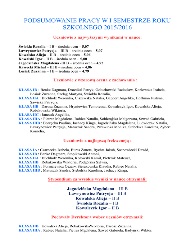PODSUMOWANIE PRACY W I SEMESTRZE ROKU SZKOLNEGO 2015/2016 Uczniowie z najwyższymi wynikami w nauce: Świokła Rozalia – I B – średnia ocen – 5,07 Ławrynowicz Patrycja – III B – średnia ocen – 5,07 Kowalska Alicja – II B – średnia ocen – 5,06 Kowalski Igor – II B – średnia ocen – 5,00 Jagodzińska Magdalena -III B – średnia ocen – 4,93 Kawecki Michał – III B – średnia ocen – 4,86 Łosiak Zuzanna – I B – średnia ocen – 4,79 Uczniowie z wzorową oceną z zachowania : KLASA IB : Benke Dagmara, Drożdżal Patryk, Gołuchowski Radosław, Kozłowska Izabela, Łosiak Zuzanna, Szeląg Martyna, Świokła Rozalia, KLASA IIA : Buchholz Weronika, Ciszewska Natalia, Geppert Angelika, Hoffman Justyna, Sawicka Patrycja, KLASA IIB : Darosz Zuzanna, Hryniewicz Tymoteusz, Kowalczyk Igor, Kowalska Alicja, Robakowska Wiktoria, KLASA IIC : Janczak Angelika, KLASA IIIA : Pietraz Magdalena, Rabiec Natalia, Sobierajska Małgorzata, Szwed Gabriela, KLASA IIIB : Borzęcka Paulina, Jachacy Kinga, Jagodzińska Magdalena, Ludwiczak Natalia, Ławrynowicz Patrycja, Matuszak Sandra, Przewłoka Monika, Stebelska Karolina, Zybert Kornelia, Uczniowie z najlepszą frekwencją : KLASA IA : Czarnecka Izabela, Buras Żaneta, Rychta Jakub, Sosnowiecki Dawid, KLASA IB : Benke Dagmara, Stopikowski Antoni, KLASA IIA : Buchholz Weronika, Kotowski Kamil, Pietrzak Mateusz, KLASA IIB : Robakowska Wiktoria, Podgórska Sylwia, KLASA IIIA : Formalewicz Cezary, Sierakowska Klaudia, Rabiec Natalia, KLASA IIIB : Matuszak Sandra, Stebelska Karolina, Jachacy Kinga, Stypendium za wysokie wyniki w nauce otrzymali: Jagodzińska Magdalena – III B Ławrynowicz Patrycja – III B Kowalska Alicja – II B Świokła Rozalia – I B Kowalczyk Igor – II B Pochwały Dyrektora wobec uczniów otrzymali: KLASA IIB : Kowalska Alicja, RobakowskaWiktoria, Darosz Zuzanna, KLASA IIIA : Rabiec Natalia, Pietras Mgdalena, Szwed Gabriela, Badyński Wiktor, Pochwały Dyrektora wobec rodziców otrzymali: • • Kowalska Alicja – II B Rabiec Natalia – III A Sukcesy uczniów w konkursach: • • • • • • • • • • • • • Kawecki Michał - Wojewódzki konkurs fizyczny organizowany przez KO w Szczecinie – Finalista Ławrynowicz Patrycja - Wojewódzki konkurs przedmiotowy z chemii – Finalista Kowalska Alicja - Finał ogólnopolskiego konkursu” Gimnazjalne potyczki” - VII miejsce Hryniewicz Tymoteusz - Finał ogólnopolskiego konkursu” Gimnazjalne potyczki” - VII miejsce Hoffman Justyna - Finał ogólnopolskiego konkursu” Gimnazjalne potyczki” - VII miejsce Darosz Zuzanna - Finał ogólnopolskiego konkursu” Gimnazjalne potyczki” - VII miejsce Sowa Maciej - Powiatowy Turniej Piłki Nożnej Chłopców – IV miejsce Markowski Adrian - Powiatowy Turniej Piłki Nożnej Chłopców – IV miejsce Piórkowski Kornel - Powiatowy Turniej Piłki Nożnej Chłopców – IV miejsce Badyński Wiktor - Powiatowy Turniej Piłki Nożnej Chłopców – IV miejsce Robakowski Marek - Powiatowy Turniej Piłki Nożnej Chłopców – IV miejsce Cichoń Aleks - Powiatowy Turniej Piłki Nożnej Chłopców – IV miejsce Ratajczyk Jakub – Powiatowy Turniej Piłki Nożnej Chłopców – IV miejsce Kowalczyk Igor - Konkurs Krajoznawczy organizowany przez PTTK Koszalin – II miejsce Szkolne Koło LOP – Najlepiej pracujące Koło Ligi Ochrony Przyrody w Okręgu Koszalińskim w 2014/2015 – II miejsce Uczniowie z najwyższymi ocenami z poszczególnych przedmiotów: Blok przedmiotów humanistycznych: • • • • • • • Historia - Świokła Rozalia, Kowalczyk Igor, Kowalska Alicja, Jagodzińska Magdalena Język polski – Świokła Rozalia, Ciszewska Natalalia, Darosz Zuzanna, Kowalczyk Igor, Kowalska Alicja, Ławrynowicz Patrycja Wiedza o społeczeństwie – Ciszewska Natalia, Geppert Angelika, Kowalska Alicja, Robakowska Wiktoria, Kawecki Michał, Ławrynowicz Patrycja Język niemiecki – Kowalczyk Igor, Kowalska Alicja, Jagodzińska Magdalena, Ławrynowicz Patrycja Język angielski – Sosnowiecki Dawid, Kozłowska Izabela, Łosiak Zuzanna, Świokła Rozalia, Ciszewska Natalia, Geppert Angelika, Kowalczyk Igor, Kowalska Alicja, Nowak Michał, Formalewicz Cezary, Jachacy Kinga, Jagodzińska Magdalena, Ławrynowicz Patrycja Podstawy przedsiębiorczości – Gałka Szymon, Kotowski Kamil, Kucab Mikołaj, Markowska Weronika, Pietrzak Mateusz, Sawicka Patrycja, Woźny Jakub, Zacholski Kamil, Bylski Bartosz, Cichoń Aleks,Gąsiorowska Weronika, Kilar Weronika, Nadolny Krystian, Nowak Michał, Podgórska Sylwia, Pedrycz Katarzyna, Robakowska Wiktoria, Robakowski Marek, Zybert Szymon, Buchholz Weronika, Ciszewska Natalia, Geppert Angelika, Hoffman Justyna, Indyka Samanta, Janiszewska Jolanta, Nowacka Patrycja, Wypych Julia, Darosz Zuzanna, Hryniewicz Tymoteusz, Kowalczyk Igor, Kowalska Alicja, Wilczek Eryk Religia – Kowalska Alicja, Czarnecka Izabela, Płomińska Emilia, Sosnowiecki Dawid, Benke Dagmara, Drożdźal Patryk, Jóźwiak Jakub, Kozłowska Izabela, Łosiak Zuzanna, Sobczyk Kacper, Szeląg Martyna, Świokła Rozalia, Buchholz Weronika, Ciszewska Natalia, Geppert Angelika, Hoffman Justyna, Janiszewska Jolanta, Markowska Weronika, Nowacka Patrycja, Sawicka Patrycja, Wypych Julia, Darosz Zuzanna, Gasiorowska Weronika, Hryniewicz Tymoteusz, Kilar Weronika, Kowalczyk Igor, Nowak Michał, Pedrycz Katarzyna, Robakowska Wiktoria, Robakowski Marek, Badyński Wiktor, Formalewicz Cezary, Jóźwiak Wiktoria, Kocińska Anita, Pietras Magdalena, Piórkowski Kornel, Rabiec Natalia, Ratajczyk Sandra, Sobierajska Małgorzata, Strzelczyk Natalia, Szwed Gabriela, Błaszczuk Karol, Dzieciątkowski Adrian, Jachacy Kinga, Jagodzińska Magdalena, Kawecki Michał, Konecki Jakub, Zybert Kornelia, Tatarowicz Klaudia, Stebelska Karolina, Rogula Radosław, Przewłoka Monika, Matuszak Sandra, Ławrynowicz Patrycja, Ludwiczak Natalia, Kościelski Piotr Blok przedmiotów matematyczno – przyrodniczych: • • • 