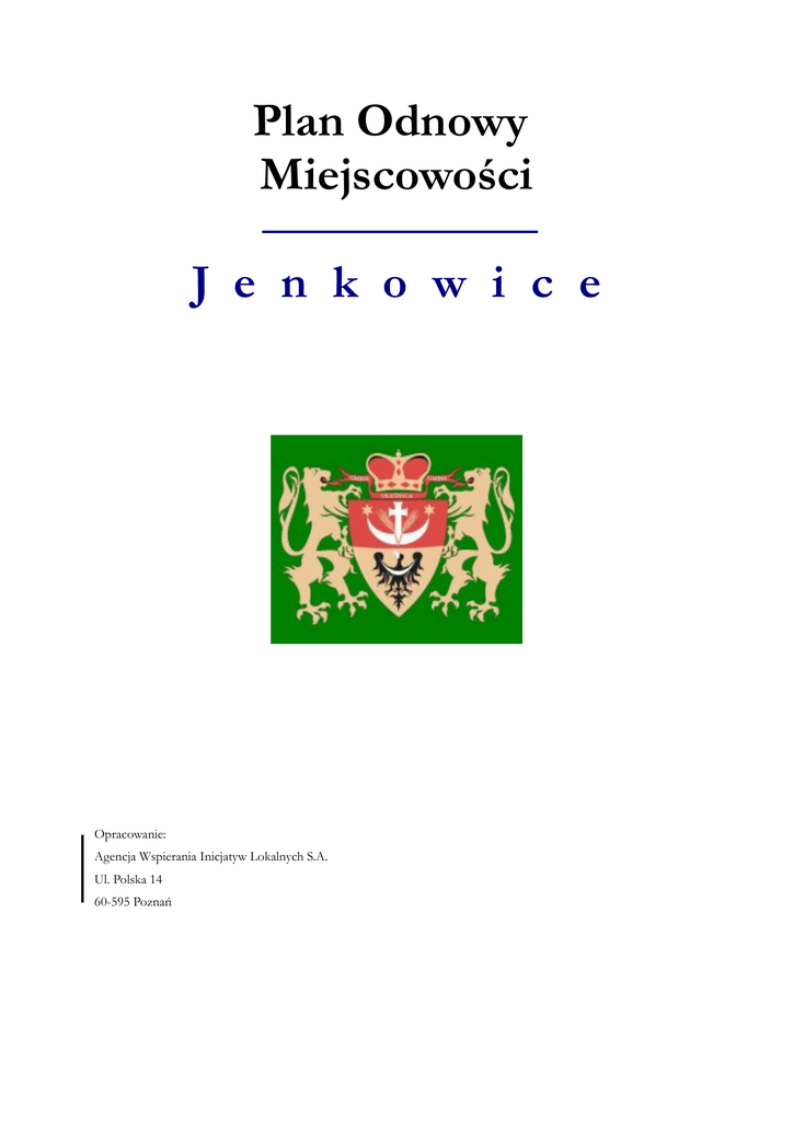 Plan Odnowy Miejscowości J e n k o w i c e Opracowanie: Agencja Wspierania Inicjatyw Lokalnych S.A. Ul. Polska 14 60-595 Poznań Plan Odnowy Miejscowości Jenkowice SPIS TREŚCI I. WSTĘP....................................................................................................................................3 II. ANALIZA ZASOBÓW MIEJSCOWOŚCI...........................................................................4 Rodzaj zasobu....................................................................................................................4 Środowisko kulturowe..................................................................................................4 Dziedzictwo religijne i historyczne..............................................................................4 Obiekty i tereny.............................................................................................................4 - działki pod zabudowę mieszkaniową.........................................................................4 - działki pod zakłady usługowe i przemysł...................................................................4 - place i miejsca publicznych spotkań..........................................................................4 Gospodarka, rolnictwo..................................................................................................5 SĄSIEDZI I PRZYJEZDNI........................................................................................................5 Instytucje.......................................................................................................................5 Ludzie, organizacje społeczne......................................................................................5 1. Położenie geograficzne......................................................................................................5 2. Uwarunkowania historyczne...............................................................................................6 3. Walory przyrodnicze i krajobrazowe..................................................................................7 4. Demografia..........................................................................................................................9 5. Infrastruktura techniczna...................................................................................................13 6. Infrastruktura społeczna ...................................................................................................17 III. ANALIZA SWOT...............................................................................................................20 IV. ZIDENTYFIKOWANE PROBLEMY................................................................................22 V. INWESTYCJE WE WSI JENKOWICE..............................................................................22 1.Plan inwestycji na lata 2008 – 2013...................................................................................22 VI. JAKA JEST MIEJSCOWOŚĆ JENKOWICE....................................................................24 VII. WIZJA ROZWOJU MIEJSCOWOŚCI JENKOWICE.....................................................24 VIII. ZARZĄDZANIE ............................................................................................................25 1. Wdrażanie.........................................................................................................................25 Instrumenty realizacji...............................................................................25 2. Monitorowanie..................................................................................................................26 Wskaźniki produktu....................................................................................................26 Wskaźniki rezultatu....................................................................................................26 Wskaźniki oddziaływania...........................................................................................26 2 Plan Odnowy Miejscowości Jenkowice I. Wstęp Polska wieś, odstająca w dostępie do dóbr cywilizacyjnych, z zaniedbaną infrastrukturą i niską opłacalnością produkcji rolnej staje, na początku XXI wieku, do rywalizacji gospodarczej z cywilizacją krajów Unii Europejskiej. Dla zapewnienia zrównoważonego rozwoju obszarów wiejskich niezbędne jest zapewnienie wielofunkcyjności rolnictwa i wsi, zwiększenie funkcji gospodarczych i społecznych wsi, ochrony środowiska na obszarach wiejskich, ograniczenie bezrobocia oraz poprawa warunków życia ludności wiejskiej. Warunkiem niezbędnym do aktywnego włączenia się miejscowości wiejskich w realizację przedsięwzięć na rzecz rozwoju i promocji lokalnych walorów kulturowych i przyrodniczych jest integracja społeczności lokalnej wokół budowy wspólnego planu działania, który można nazwać planem rozwoju wsi. Jest to postępowanie odmienne od działań podejmowanych w innych programach ze względu na element integracji na najniższym poziomie współdziałania mieszkańców pojedynczej wsi. Niniejsze opracowanie jest właśnie takim Planem działania przygotowanym dla miejscowości Jenkowice, w której mieszkańcy zintegrowali się wokół wspólnych celów i postanowili wykorzystać szansę jaką daje jej wyjątkowe bogactwo krajobrazu i dorobek artystyczny ludzi, którzy tą wieś wybrali jako miejsce stałego zamieszkania. 3 Plan Odnowy Miejscowości Jenkowice II. Analiza zasobów miejscowości Analizę zasobów miejscowości przeprowadzono na podstawie danych statystycznych oraz informacji zgromadzonych przez Urząd Gminy w Oleśnicy. Zasoby miejscowości to wszelkie elementy materialne i niematerialne wsi oraz otaczającego ją obszaru, które mogą być wykorzystane obecnie bądź w przyszłości przy budowaniu czy realizacji publicznych i prywatnych przedsięwzięć odnowy wsi. Przy analizie zasob