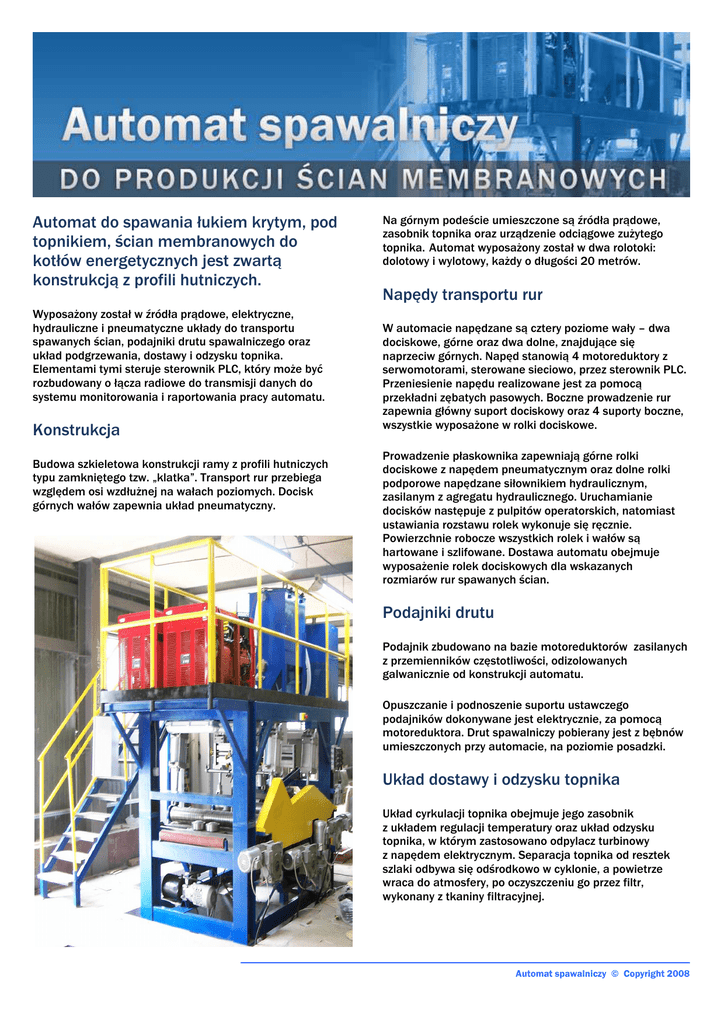 Automat do spawania łukiem krytym, pod topnikiem, ścian membranowych do kotłów energetycznych jest zwartą konstrukcją z profili hutniczych. WyposaŜony został w źródła prądowe, elektryczne, hydrauliczne i pneumatyczne układy do transportu spawanych ścian, podajniki drutu spawalniczego oraz układ podgrzewania, dostawy i odzysku topnika. Elementami tymi steruje sterownik PLC, który moŜe być rozbudowany o łącza radiowe do transmisji danych do systemu monitorowania i raportowania pracy automatu. Konstrukcja Budowa szkieletowa konstrukcji ramy z profili hutniczych typu zamkniętego tzw. „klatka”. Transport rur przebiega względem osi wzdłuŜnej na wałach poziomych. Docisk górnych wałów zapewnia układ pneumatyczny. Na górnym podeście umieszczone są źródła prądowe, zasobnik topnika oraz urządzenie odciągowe zuŜytego topnika. Automat wyposaŜony został w dwa rolotoki: dolotowy i wylotowy, kaŜdy o długości 20 metrów. Napędy transportu rur W automacie napędzane są cztery poziome wały – dwa dociskowe, górne oraz dwa dolne, znajdujące się naprzeciw górnych. Napęd stanowią 4 motoreduktory z serwomotorami, sterowane sieciowo, przez sterownik PLC. Przeniesienie napędu realizowane jest za pomocą przekładni zębatych pasowych. Boczne prowadzenie rur zapewnia główny suport dociskowy oraz 4 suporty boczne, wszystkie wyposaŜone w rolki dociskowe. Prowadzenie płaskownika zapewniają górne rolki dociskowe z napędem pneumatycznym oraz dolne rolki podporowe napędzane siłownikiem hydraulicznym, zasilanym z agregatu hydraulicznego. Uruchamianie docisków następuje z pulpitów operatorskich, natomiast ustawiania rozstawu rolek wykonuje się ręcznie. Powierzchnie robocze wszystkich rolek i wałów są hartowane i szlifowane. Dostawa automatu obejmuje wyposaŜenie rolek dociskowych dla wskazanych rozmiarów rur spawanych ścian. Podajniki drutu Podajnik zbudowano na bazie motoreduktorów zasilanych z przemienników częstotliwości, odizolowanych galwanicznie od konstrukcji automatu. Opuszczanie i podnoszenie suportu ustawczego podajników dokonywane jest elektrycznie, za pomocą motoreduktora. Drut spawalniczy pobierany jest z bębnów umieszczonych przy automacie, na poziomie posadzki. Układ dostawy i odzysku topnika Układ cyrkulacji topnika obejmuje jego zasobnik z układem regulacji temperatury oraz układ odzysku topnika, w którym zastosowano odpylacz turbinowy z napędem elektrycznym. Separacja topnika od resztek szlaki odbywa się odśrodkowo w cyklonie, a powietrze wraca do atmosfery, po oczyszczeniu go przez filtr, wykonany z tkaniny filtracyjnej. Automat spawalniczy © Copyright 2008 Źródła prądowe Pulpity operatora W automacie zastosowano dwa źródła prądowe typu DC655 i K1610-1, produkcji LINCOLN ELECTRIC, o parametrach: 655A/44VDC/100%, 815/44V/ADC/60%, 50-815A (13...44VDC). Pulpity wyposaŜone są w przyciski sterujące poszczególnymi czynnościami, panel operatorski wyposaŜony w wyświetlacz LCD, mierniki wskazówkowe oraz kontrolki sygnalizacyjne. Komplet stanowią kable wysokoprądowe z zaprasowanymi końcówkami oczkowymi oraz elementy dodatkowe umoŜliwiające podłączenie źródeł prądu do sterownika PLC w celu sterowania i pomiaru parametrów pracy źródeł. Okablowanie Szafa sterownicza automatu Szafa sterownicza dostarczana jest gotowa do montaŜu z kompletnym wyposaŜeniem: • • • • sterowniki PLC, przemienniki częstotliwości, styczniki, przekaźniki, zabezpieczenia elektryczne. W skład dostawy wchodzi komplet kabli sterowniczych i koryt kablowych, kable sterownicze i zasilające do źródeł prądu, do pulpitów i silników. Do prowadzenia tras kablowych stosowane są metalowe koryta kablowe. Dostawa Kompleksowa dostawa obejmuje obejmuje: bejmuje: • • • • montaŜ, uruchomienie, przekazanie do eksploatacji, szkolenia pracowników, przekazanie dokumentacji budowlanej, mechanicznej i elektrycznej oraz instrukcji obsługi. AMEplus Sp. z o.o. ul. śernicka 35, 44-105 Gliwice tel. +48 (32) 239 27 00 fax +48 (32) 239 27 01 e-mail: [email protected] www.ameplus.pl Automat spawalniczy © Copyright 2008