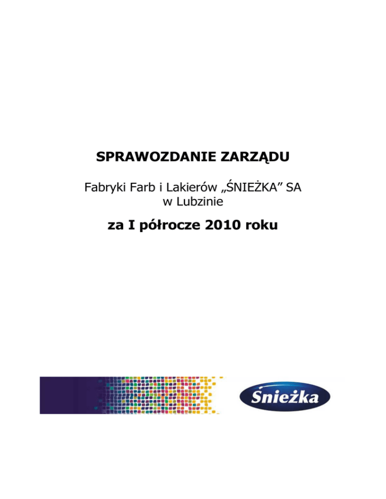 SPRAWOZDANIE ZARZĄDU Fabryki Farb i Lakierów „ŚNIEŻKA” SA w Lubzinie za I półrocze 2010 roku Fabryka Farb i Lakierów Śnieżka S.A. w Lubzinie Sprawozdanie Zarządu za 6 miesięcy 2010 roku 1. WSTĘP DO SPRAWOZDANIA ZARZĄDU ZA 6 MIESIĘCY 2010 ROKU ........... 3 2. OPIS DZIAŁALNOŚCI SPÓŁKI W I PÓŁROCZU 2010 ROKU ............................. 4 3. STRATEGICZNE CELE SPÓŁKI .............................................................................. 6 4. SPRZEDAŻ I PORTFEL ZAMÓWIEŃ........................................................................ 7 5. BADANIA I ROZWÓJ.................................................................................................... 8 6. POLITYKA ZAOPATRZENIA ..................................................................................... 8 7. ZATRUDNIENIE............................................................................................................. 8 8. INWESTYCJE W ŚRODKI TRWAŁE I WARTOŚCI NIEMATERIALNE ........... 9 9. FINANSE ........................................................................................................................ 11 10. PODSTAWOWE RYZYKA I ZAGROŻENIA ZWIĄZANE Z DZIAŁALNOŚCIĄ NA RYNKU FARB I LAKIERÓW .................................................. 13 11. NAGRODY, WYRÓŻNIENIA ................................................................................. 17 12. PODSUMOWANIE ................................................................................................... 19 Strona 2 Fabryka Farb i Lakierów Śnieżka S.A. w Lubzinie Sprawozdanie Zarządu za 6 miesięcy 2010 roku 1. Wstęp do Sprawozdania Zarządu za 6 miesięcy 2010 roku Nazwa: Fabryka Farb i Lakierów „Śnieżka” SA Siedziba Zarządu Spółki: 39-102 Lubzina 34 a pow. ropczycko - sędziszowski woj. podkarpackie Rejestracja Spółki: Spółka została wpisana do rejestru przedsiębiorców KRS w dniu 12.11.2001 r. w Sądzie Rejonowym w Rzeszowie, w XII Wydziale Gospodarczym Krajowego Rejestru Sądowego pod numerem KRS 0000060537. Przedmiot działalności Spółki: Produkcja farb, lakierów, rozpuszczalników, klei, szpachli itp. Oddziały: 1. Lubzina 34 a 39-102 Lubzina pow. ropczycko – sędziszowski woj. podkarpackie 2. Brzeźnica 18 39-207 Brzeźnica pow. dębicki woj. podkarpackie 3. Pustków 604 39-205 Pustków pow. dębicki woj. Podkarpackie 4. Bytów 77-100 Bytów ul. Leśna 5 woj. Pomorskie Od dnia 1 sierpnia 2009 r. FFiL Śnieżka S.A. przejęła od Fabryki Farb i Lakierów Proszkowych PROXIMAL w Bytowie Sp. z o.o. Grupa Śnieżka produkcję farb i lakierów proszkowych. Produkcja farb i lakierów proszkowych realizowana była w obiekcie spółki PROXIMAL w Bytowie. W II półroczu 2010 r. produkcja farb proszkowych zostanie przeniesiona do obiektów Oddziału Spółki w Lubzinie. Strona 3 Fabryka Farb i Lakierów Śnieżka S.A. w Lubzinie Sprawozdanie Zarządu za 6 miesięcy 2010 roku Kapitał Akcyjny: Na dzień 30 czerwca 2010 r.: 13 553 587 zł - 13 553 587 akcji o wartości nominalnej 1zł. W dniu 21 czerwca 2010 r. Walne Zgromadzenie Akcjonariuszy na podstawie art. 359 KSH umorzyło akcje własne na okaziciela serii F w łącznej ilości 2.911 sztuk na kwotę 2.911 zł. Umorzenie to było umorzeniem dobrowolnym. Podstawą prawną umorzenia był § 6 ust. 8 Statutu Spółki i art. 359 i 360 k.s.h. Umorzenie nastąpiło poprzez obniżenie kapitału zakładowego na podstawie art. 455 § 1 k.s.h. Umorzenie akcji nastąpiło z czystego zysku. Akcje serii D w ilości 2.911 zostały umorzone po cenie 31,04 zł każda. Nadwyżka ponad wartość nominalną akcji serii F w wysokości 87.446,44 zł została pokryta z kapitału zapasowego. Do dnia opracowania niniejszego sprawozdania sąd rejestrowy nie dokonał rejestracji tych zmian. Reprezentacja Spółki: Rada Nadzorcza Stanisław Cymbor – Przewodniczący RN Jerzy Pater - Wiceprzewodniczący RN Stanisław Mikrut – Sekretarz RN Anna Pater – Członek RN Jakub Bentke – Członek RN Zbigniew Łapiński - Członek RN W dniu 21 czerwca 2010r. Zwyczajne Walne Zgromadzenie Akcjonariuszy zwiększyło skład Rady Nadzorczej i powołało na członka Rady Nadzorczej Panią Annę Pater. Zarząd Piotr Mikrut - Prezes Zarządu od dnia 31 marca 2004 r. do dnia dzisiejszego. Witold Waśko - Wiceprezes Zarządu od dnia 1 kwietnia 2005 r. do dnia dzisiejszego. Joanna Wróbel -Lipa - Członek Zarządu od dnia 18 grudnia 2007 r. do dnia dzisiejszego. Walentyna Ochab - Członek Zarządu od dnia 18 grudnia 2007 r. do dnia dzisiejszego. W I półroczu 2010 r. w składzie osobowym Zarządu nie wystąpiły zmiany. Zasady prezentacji sprawozdania finansowego zostały zawarte we wprowadzeniu do półrocznego sprawozdania finansowego FFiL Śnieżka S.A. 2. Opis działalności Spółki w I półroczu 2010 roku W I półroczu br. wartość sprzedaży FFiL Śnieżka SA wyniosła 212,4 mln zł, co oznacza 99,3% dynamikę w porównaniu do analogicznego okresu roku 2009. Wpływ na taką dynamikę miał niewielki spadek przychodów ze sprzedaży wyrobów i materiałów. Strona 4 Fabryka Farb i Lakierów Śnieżka S.A. w Lubzinie Sprawozdanie Zarządu za 6 miesięcy 2010 roku Dynamika 2010/2009 115.5% 100.1% 99.2% Prz ychody z e sprz e daż y wyrobów 95.2% Poz ostałe prz ychody Prz ychody z e sprz e daż y towarów Prz ychody z e sprz e daż y mate riałów Najważniejsze działania i osiągnięcia Spółki w I półroczu 2010 roku oraz do dnia sporządzenia niniejszego sprawozdania: • Doskonalono struktury sprzedaży i procesy logistyczne. • Rozpoczęto realizację strategii multibrandingowej polegającej na budowaniu silnych marek, będących specjalistami w swojej dziedzinie. • W dniu 21 czerwca 2010 roku odbyło się Zwyczajne Walne Zgromadzenie Akcjonariuszy, które: zatwierdziło sprawozdanie Zarządu z działalności Spółki oraz sprawozdanie finansowe Spółki za 2009 rok, udzieliło absolutorium członkom organów Spółki z wykonania obowią