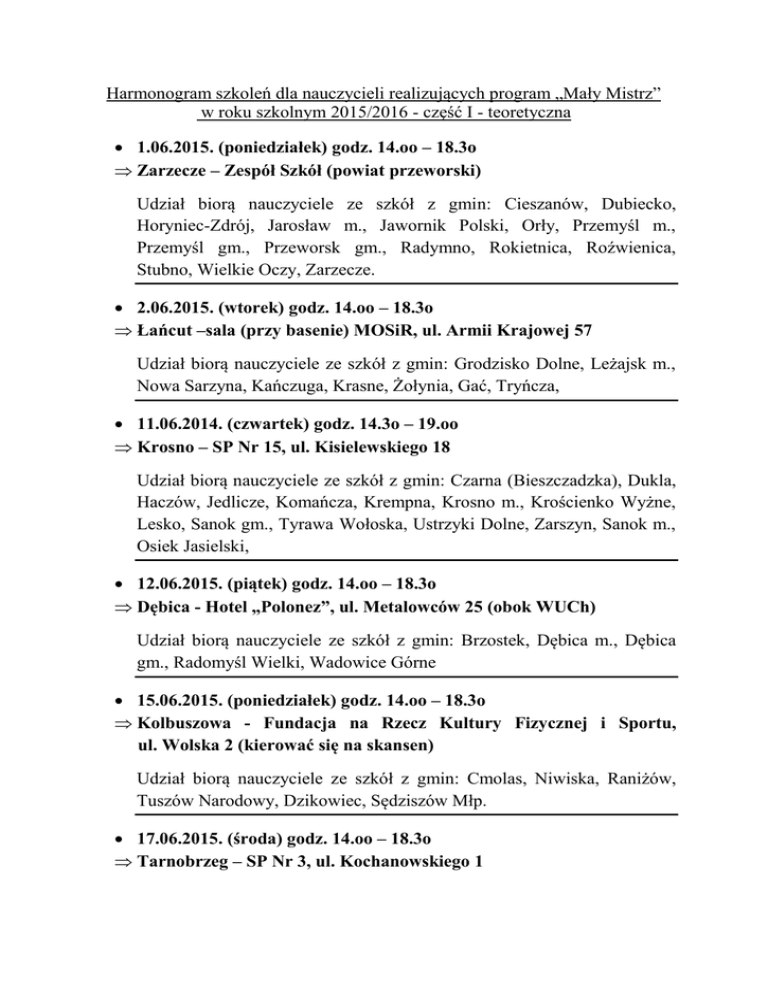 Harmonogram szkoleń dla nauczycieli realizujących program „Mały Mistrz” w roku szkolnym 2015/2016 - część I - teoretyczna 1.06.2015. (poniedziałek) godz. 14.oo – 18.3o Zarzecze – Zespół Szkół (powiat przeworski) Udział biorą nauczyciele ze szkół z gmin: Cieszanów, Dubiecko, Horyniec-Zdrój, Jarosław m., Jawornik Polski, Orły, Przemyśl m., Przemyśl gm., Przeworsk gm., Radymno, Rokietnica, Roźwienica, Stubno, Wielkie Oczy, Zarzecze. 2.06.2015. (wtorek) godz. 14.oo – 18.3o Łańcut –sala (przy basenie) MOSiR, ul. Armii Krajowej 57 Udział biorą nauczyciele ze szkół z gmin: Grodzisko Dolne, Leżajsk m., Nowa Sarzyna, Kańczuga, Krasne, Żołynia, Gać, Tryńcza, 11.06.2014. (czwartek) godz. 14.3o – 19.oo Krosno – SP Nr 15, ul. Kisielewskiego 18 Udział biorą nauczyciele ze szkół z gmin: Czarna (Bieszczadzka), Dukla, Haczów, Jedlicze, Komańcza, Krempna, Krosno m., Krościenko Wyżne, Lesko, Sanok gm., Tyrawa Wołoska, Ustrzyki Dolne, Zarszyn, Sanok m., Osiek Jasielski, 12.06.2015. (piątek) godz. 14.oo – 18.3o Dębica - Hotel „Polonez”, ul. Metalowców 25 (obok WUCh) Udział biorą nauczyciele ze szkół z gmin: Brzostek, Dębica m., Dębica gm., Radomyśl Wielki, Wadowice Górne 15.06.2015. (poniedziałek) godz. 14.oo – 18.3o Kolbuszowa - Fundacja na Rzecz Kultury Fizycznej i Sportu, ul. Wolska 2 (kierować się na skansen) Udział biorą nauczyciele ze szkół z gmin: Cmolas, Niwiska, Raniżów, Tuszów Narodowy, Dzikowiec, Sędziszów Młp. 17.06.2015. (środa) godz. 14.oo – 18.3o Tarnobrzeg – SP Nr 3, ul. Kochanowskiego 1 Udział biorą nauczyciele ze szkół z gmin: Baranów Sandomierski, Grębów, Nisko, Tarnobrzeg m., Zaleszany 18.06.2015. (czwartek) godz. 14.oo – 18.3 Strzyżów – Miejski Zespół Szkół, ul. Daszyńskiego 4 Udział biorą nauczyciele ze szkół z gmin: Strzyżów, Wielopole Skrzyńskie, Frysztak, Lubenia, Boguchwała, Błażowa. 22.06.2015. (poniedziałek) godz. 14.3o – 19.oo Rzeszów – Zespół Szkół Nr 6 (SP Nr 28 + Gim. Nr 5), ul. Solarza 12 Udział biorą nauczyciele ze szkół: Nr 1, 2, 3, 4, 6, 7, 8, 9, 11, 12, 13, 14, 15, 16 w Rzeszowie 24.06.2015. (środa) godz. 14.3o – 19.oo Rzeszów – Zespół Szkół Nr 6 (SP Nr 28 + Gim. Nr 5), ul. Solarza 12 Udział biorą nauczyciele ze szkół: Nr 17, 19, 22, 23, 24, 25, 27, 28 w Rzeszowie oraz z gminy Kamień. Uwaga: Szkolenie dla nauczycieli edukacji wczesnoszkolnej jest obowiązkowe. Jeżeli ktoś nie może wziąć udziału w wyznaczonym terminie to może uczestniczyć w innym terminie i miejscu z wyżej wymienionych. Program szkolenia: mgr Jacek Bigus PW SZS Rzeszów Wprowadzenie (przywitanie, określenie celów szkolenia, informacje organizacyjne) Program Mały Mistrz – ogólne + założenia, materiały, strona internetowa i inne 1. dr Adam Przybysz dr Krzysztof Warchoł Charakterystyka rozwoju dziecka w wieku 6-10 lat (ze szczególnym uwzględnieniem rozwoju fizycznego i motorycznego oraz zwróceniem uwagi na okresy Państwowa Wyższa Szkoła sensytywne dla rozwoju koordynacji ruchowej). Zawodowa w Krośnie 2. Znaczenie aktywności ruchowej w życiu dziecka (znaczenie dla zdrowia, rozwoju fizycznego, psychicznego, motorycznego, poznawczego, społeczne, wymiar ekonomiczny) Wprowadzenie do metodyki nauczania: * podstawa programowa, Uniwersytet Rzeszowski * ramowe plany nauczania, * wskazania metodyczne do prowadzenia zajęć ruchowych - Zespół Metodyki Wychowania Fizycznego z dziećmi w wieku młodszym szkolnym, wynikające z wieku, zdrowia oraz potrzeb rozwojowych. i Sportu Metodyka diagnozowania rozwoju fizycznego, motorycznego oraz umiejętności ruchowych dzieci