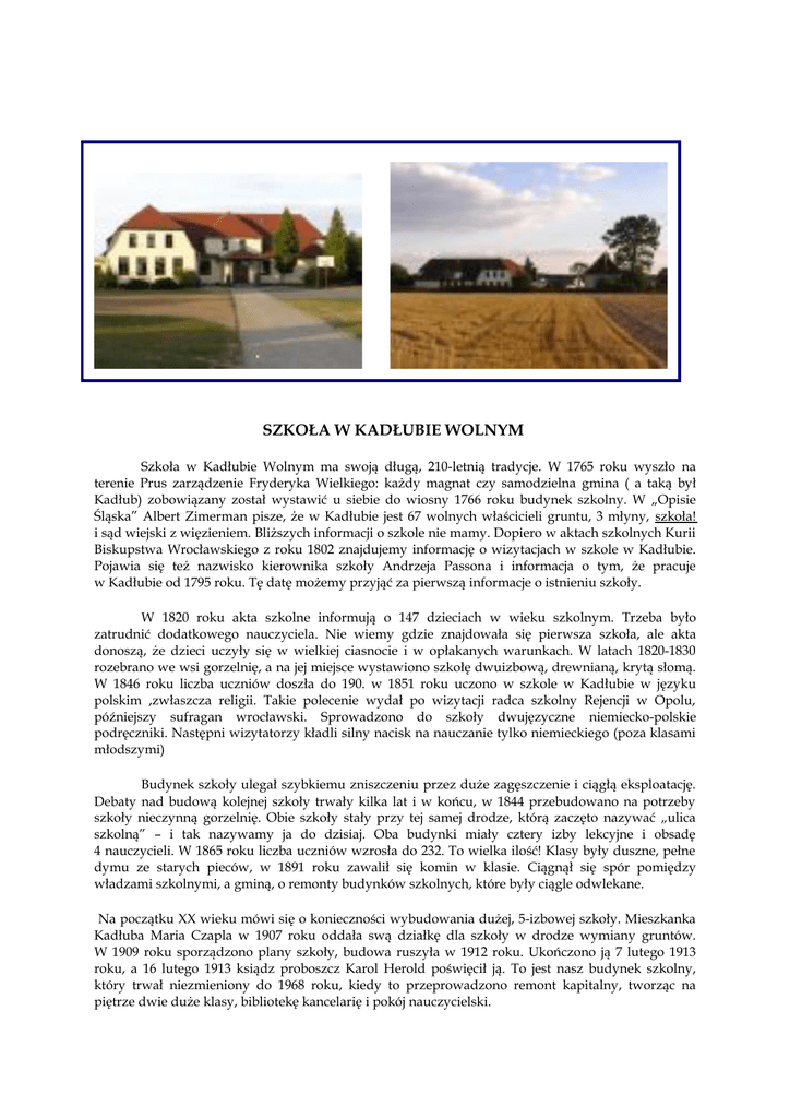 SZKOŁA W KADŁUBIE WOLNYM Szkoła w Kadłubie Wolnym ma swoją długą, 210-letnią tradycje. W 1765 roku wyszło na terenie Prus zarządzenie Fryderyka Wielkiego: każdy magnat czy samodzielna gmina ( a taką był Kadłub) zobowiązany został wystawić u siebie do wiosny 1766 roku budynek szkolny. W „Opisie Śląska” Albert Zimerman pisze, że w Kadłubie jest 67 wolnych właścicieli gruntu, 3 młyny, szkoła! i sąd wiejski z więzieniem. Bliższych informacji o szkole nie mamy. Dopiero w aktach szkolnych Kurii Biskupstwa Wrocławskiego z roku 1802 znajdujemy informację o wizytacjach w szkole w Kadłubie. Pojawia się też nazwisko kierownika szkoły Andrzeja Passona i informacja o tym, że pracuje w Kadłubie od 1795 roku. Tę datę możemy przyjąć za pierwszą informacje o istnieniu szkoły. W 1820 roku akta szkolne informują o 147 dzieciach w wieku szkolnym. Trzeba było zatrudnić dodatkowego nauczyciela. Nie wiemy gdzie znajdowała się pierwsza szkoła, ale akta donoszą, że dzieci uczyły się w wielkiej ciasnocie i w opłakanych warunkach. W latach 1820-1830 rozebrano we wsi gorzelnię, a na jej miejsce wystawiono szkołę dwuizbową, drewnianą, krytą słomą. W 1846 roku liczba uczniów doszła do 190. w 1851 roku uczono w szkole w Kadłubie w języku polskim ,zwłaszcza religii. Takie polecenie wydał po wizytacji radca szkolny Rejencji w Opolu, późniejszy sufragan wrocławski. Sprowadzono do szkoły dwujęzyczne niemiecko-polskie podręczniki. Następni wizytatorzy kładli silny nacisk na nauczanie tylko niemieckiego (poza klasami młodszymi) Budynek szkoły ulegał szybkiemu zniszczeniu przez duże zagęszczenie i ciągłą eksploatację. Debaty nad budową kolejnej szkoły trwały kilka lat i w końcu, w 1844 przebudowano na potrzeby szkoły nieczynną gorzelnię. Obie szkoły stały przy tej samej drodze, którą zaczęto nazywać „ulica szkolną” – i tak nazywamy ja do dzisiaj. Oba budynki miały cztery izby lekcyjne i obsadę 4 nauczycieli. W 1865 roku liczba uczniów wzrosła do 232. To wielka ilość! Klasy były duszne, pełne dymu ze starych pieców, w 1891 roku zawalił się komin w klasie. Ciągnął się spór pomiędzy władzami szkolnymi, a gminą, o remonty budynków szkolnych, które były ciągle odwlekane. Na początku XX wieku mówi się o konieczności wybudowania dużej, 5-izbowej szkoły. Mieszkanka Kadłuba Maria Czapla w 1907 roku oddała swą działkę dla szkoły w drodze wymiany gruntów. W 1909 roku sporządzono plany szkoły, budowa ruszyła w 1912 roku. Ukończono ją 7 lutego 1913 roku, a 16 lutego 1913 ksiądz proboszcz Karol Herold poświęcił ją. To jest nasz budynek szkolny, który trwał niezmieniony do 1968 roku, kiedy to przeprowadzono remont kapitalny, tworząc na piętrze dwie duże klasy, bibliotekę kancelarię i pokój nauczycielski. 6 czerwca 1945 roku po zakończeniu II wojny światowej, została otwarta przez kierownika szkoły Lossego szkoła polska. 7 i 8 czerwca 1969 roku w uroczystościach szkolnych nadano szkole imię Izydora Murka ,mieszkańca wsi, działacza społecznego, patrioty, twórcy kółka rolniczego, uczestnika powstań, zabitego przez grenschutz na Wypychowie. W 1973 roku w ścianę szkoły wmurowano tablicę pamiątkową dokumentującą historię Kadłuba Wolnego. Nasza szkoła jest szkołą środowiskową, działa przy współpracy nauczycieli, uczniów i rodziców. Duża liczba rodziców to byli uczniowie szkoły. Mimo trudności finansowych szkoła działa wypełniając swoje funkcje dydaktyczne, wychowawcze, a także uczestnicząc w życiu wsi. Izydor Murek urodzony dnia 25 maja 1878 roku w Szemrowicach, powiat Lubliniec, zamieszkały w Kadłubie Wolnym, był współzałożycielem i wieloletnim Prezesem Kółka Rolniczego w Kadłubie Wolnym w latach 1912 - 1919 – do dnia 09 czerwca 1919 roku, w którym został zamordowany. Był również: - członkiem zarządu Banku Ludowego w Oleśnie w 1911 roku, - członkiem zarządu „Rolnika ” w Oleśnie w 1912 roku, - współorganizatorem wycieczek chłopów ze Śląska Opolskiego do Polski – Krakowa, Wieliczki, Wielunia i innych miast polskich pod zaborami, - współorganizatorem kursu języka polskiego, historii i geografii oraz kółka śpiewaczego we wsi, - propagatorem postępu technicznego w rolnictwie wśród uciskanego ludu polskiego w Niemczech, - obrońcą mowy polskiej dzieci chłopskich w Kadłubie Wolnym, - organizatorem i prelegentem ludności, na wiecach politycznych dla miejscowej - zastępcą Komendanta Batalionu w „ Małym Powstaniu Oleskim ” w dniach 07 – 09 czerwca 1919 roku. Powyższa działalność Izydora Murka, przedstawiona w skrócie, stała się przyczyną jego zamordowania przez Grenzshutz dnia 09 czerwca 1919 roku. Według opracowania mgr Ryszarda Piecha : „ O Izydorze Murku ” SZKOLNE L.p. Data 1. 1765 r. 2. 3. 4. 5. 6. 7. 8. 9. 10. 11. 12. 13. 14. 15. 16. 17. 1783 r. 1794 r. 1795 r. 1802 r. 1820 r. 1820 r.– 1830 r. 1830 r.- 1846 r. 1844 r. 1865 r. 1899 r. 16 II 1913 r. 06 VI 1945 r. 03 IX 1947 r. 29 VIII 1950 r. 20 VI 1967 r. 1967 – 1968 r. 18. 07/08 VI 1969 r. 19. 20. 21. 22. 23. 24. 25. 26. 1973 r. 1977 r. 1978 r. 1982 r. 1991 r. 1992 r. 1992 r. 1995 r. 27. 28. 29. 30. 31. 1997 r. 1998 r. 10 IV 2002 r. 01 IX 2002 r. 01 IX 2004 r. 32. 01 III 2005 r KALENDARIUM Wydarzenie - zarządzenie Fryderyka Wielkiego o obowiązku wystawiania przez każdego magnata szkoły na swojej ziemi. - pierwsza wzmianka o istnieniu szkoły - szkoła instytucją państwową utrzymywaną przez gminy - na kierownika zostaje powołany ANDRZEJ PASSON - Inspektor szkolny wizytuje szkołę liczącą 80 dzieci - nauczaniem objeto 127 dzieci – informacja z akt Kadłuba - powstaje szkoła dwuizbowa, drewniana, na miejscu dawnej gorzelni - szkoła liczy 190 uczniów - powstaje nowy budynek szkoły w przebudowanej gorzelni - szkoła liczy 232 uczniów - w starym, zniszczonym budynku panuje ciasnota – jest już 300 uczniów - 