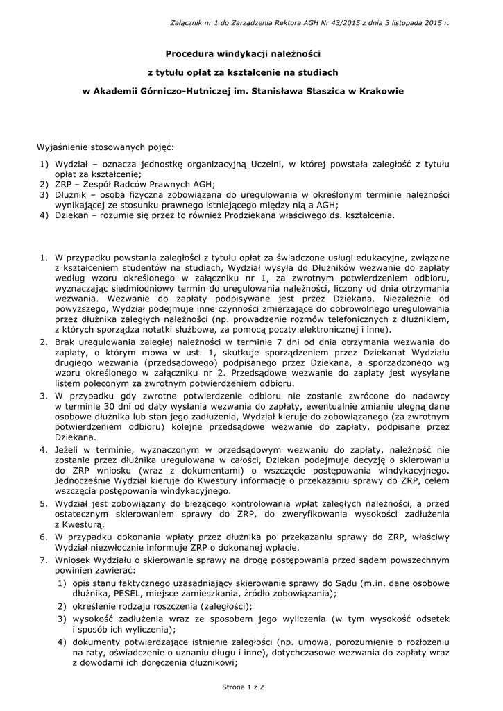 Załącznik nr 1 do Zarządzenia Rektora AGH Nr 43/2015 z dnia 3 listopada 2015 r. Procedura windykacji należności z tytułu opłat za kształcenie na studiach w Akademii Górniczo-Hutniczej im. Stanisława Staszica w Krakowie Wyjaśnienie stosowanych pojęć: 1) Wydział – oznacza jednostkę organizacyjną Uczelni, w której powstała zaległość z tytułu opłat za kształcenie; 2) ZRP – Zespół Radców Prawnych AGH; 3) Dłużnik – osoba fizyczna zobowiązana do uregulowania w określonym terminie należności wynikającej ze stosunku prawnego istniejącego między nią a AGH; 4) Dziekan – rozumie się przez to również Prodziekana właściwego ds. kształcenia. 1. W przypadku powstania zaległości z tytułu opłat za świadczone usługi edukacyjne, związane z kształceniem studentów na studiach, Wydział wysyła do Dłużników wezwanie do zapłaty według wzoru określonego w załączniku nr 1, za zwrotnym potwierdzeniem odbioru, wyznaczając siedmiodniowy termin do uregulowania należności, liczony od dnia otrzymania wezwania. Wezwanie do zapłaty podpisywane jest przez Dziekana. Niezależnie od powyższego, Wydział podejmuje inne czynności zmierzające do dobrowolnego uregulowania przez dłużnika zaległych należności (np. prowadzenie rozmów telefonicznych z dłużnikiem, z których sporządza notatki służbowe, za pomocą poczty elektronicznej i inne). 2. Brak uregulowania zaległej należności w terminie 7 dni od dnia otrzymania wezwania do zapłaty, o którym mowa w ust. 1, skutkuje sporządzeniem przez Dziekanat Wydziału drugiego wezwania (przedsądowego) podpisanego przez Dziekana, a sporządzonego wg wzoru określonego w załączniku nr 2. Przedsądowe wezwanie do zapłaty jest wysyłane listem poleconym za zwrotnym potwierdzeniem odbioru. 3. W przypadku gdy zwrotne potwierdzenie odbioru nie zostanie zwrócone do nadawcy w terminie 30 dni od daty wysłania wezwania do zapłaty, ewentualnie zmianie ulegną dane osobowe dłużnika lub stan jego zadłużenia, Wydział kieruje do zobowiązanego (za zwrotnym potwierdzeniem odbioru) kolejne przedsądowe wezwanie do zapłaty, podpisane przez Dziekana. 4. Jeżeli w terminie, wyznaczonym w przedsądowym wezwaniu do zapłaty, należność nie zostanie przez dłużnika uregulowana w całości, Dziekan podejmuje decyzję o skierowaniu do ZRP wniosku (wraz z dokumentami) o wszczęcie postępowania windykacyjnego. Jednocześnie Wydział kieruje do Kwestury informację o przekazaniu sprawy do ZRP, celem wszczęcia postępowania windykacyjnego. 5. Wydział jest zobowiązany do bieżącego kontrolowania wpłat zaległych należności, a przed ostatecznym skierowaniem sprawy do ZRP, do zweryfikowania wysokości zadłużenia z Kwesturą. 6. W przypadku dokonania wpłaty przez dłużnika po przekazaniu sprawy do ZRP, właściwy Wydział niezwłocznie informuje ZRP o dokonanej wpłacie. 7. Wniosek Wydziału o skierowanie sprawy na drogę postępowania przed sądem powszechnym powinien zawierać: 1) opis stanu faktycznego uzasadniający skierowanie sprawy do Sądu (m.in. dane osobowe dłużnika, PESEL, miejsce zamieszkania, źródło zobowiązania); 2) określenie rodzaju roszczenia (zaległości); 3) wysokość zadłużenia wraz ze sposobem jego wyliczenia (w tym wysokość odsetek i sposób ich wyliczenia); 4) dokumenty potwierdzające istnienie zaległości (np. umowa, porozumienie o rozłożeniu na raty, oświadczenie o uznaniu długu i inne), dotychczasowe wezwania do zapłaty wraz z dowodami ich doręczenia dłużnikowi; Strona 1 z 2 Załącznik nr 1 do Zarządzenia Rektora AGH Nr 43/2015 z dnia 3 listopada 2015 r. 5) informacje o osobie prowadzącej sprawę na danym Wydziale, która będzie bezpośrednio współpracowała z pełnomocnikiem procesowym w ramach postępowania sądowego. 8. Dokumenty przekazywane do ZRP powinny być uporządkowane, ponumerowane i ułożone w teczce, w porządku chronologicznym – od najstarszego do najnowszego dokumentu oraz składane w trzech egzemplarzach (oryginał + 2 x kopia). 9. Wniosek o prowadzenie sprawy przed sądem powszechnym wraz z kompletem dokumentów powinien być złożony w ZRP na co najmniej 3 miesiące przed upływem terminu przedawnienia (wygaśnięcia) roszczenia. Roszczenia wynikające z umowy przedawniają się z upływem trzech lat. 10. Bieg terminu przedawnienia roszczeń o zapłatę należności rozpoczyna się od dnia, w którym roszczenie Uczelni stało się wymagalne (tj. w następnym dniu po upływie terminu, wskazanego w umowie lub w innym dokumencie, jako terminu płatności należności za kształcenie). 11. Akta sprawy nieodpowiadające wymaganiom określonym w ust. 7, będą zwracane na Wydział, celem prawidłowego ich przygotowania na potrzeby postępowania sądowego. 12. Wydział obowiązany jest bezwzględnie przestrzegać wskazanego przez ZRP terminu zajęcia stanowiska, złożenia wyjaśnień w przypadku powstania wątpliwości do okoliczności sprawy, czy też wysokości wskazanego zadłużenia. 13. Radca prawny, któremu zlecono prowadzenie sprawy jest obowiązany informować Dziekana o niecelowości wniesienia pozwu, przedawnieniu sprawy oraz o celowości bądź niecelowości złożenia środka odwoławczego od orzeczenia kończącego sprawę w danej instancji. 14. Po wywiązaniu się dłużnika z obowiązku spłaty wymaganych należności ZRP przekazuje Wydziałowi informacje o zakończeniu windykacji i zwraca oryginały dokumentów. Strona 2 z 2