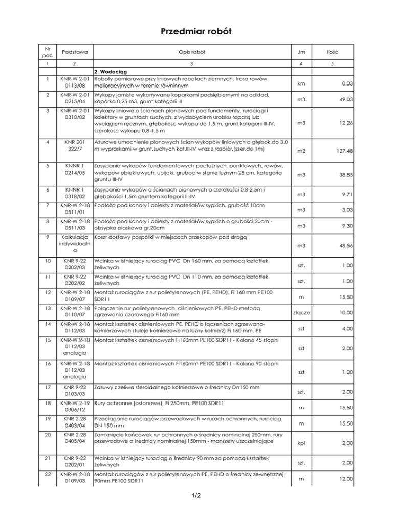 Przedmiar robót Nr poz. Podstawa Opis robót Jm Ilość 1 2 3 4 5 2. Wodociąg KNR-W 2-01 Roboty pomiarowe przy liniowych robotach ziemnych, trasa rowów 0113/08 melioracyjnych w terenie równinnym km 0,03 2 KNR-W 2-01 Wykopy jamiste wykonywane koparkami podsiębiernymi na odkład, 0215/04 koparka 0,25 m3, grunt kategorii III m3 49,03 3 KNR-W 2-01 Wykopy liniowe o ścianach pionowych pod fundamenty, rurociągi i 0310/02 kolektory w gruntach suchych, z wydobyciem urobku łopatą lub wyciągiem ręcznym, głębokosc wykopu do 1,5 m, grunt kategorii III-IV, szerokosc wykopu 0,8-1,5 m m3 12,26 m2 127,48 1 4 KNR 201 322/7 Ażurowe umocnienie pionowych ścian wykopów liniowych o głębok.do 3.0 m wypraskami w grunt.suchych kat.III-IV wraz z rozbiór.(szer.do 1m) KNNR 1 0214/05 Zasypanie wykopów fundamentowych podłużnych, punktowych, rowów, wykopów obiektowych, ubijaki, gruboć w stanie luźnym 25 cm, kategoria gruntu III-IV m3 38,85 KNNR 1 0318/02 Zasypanie wykopów o ścianach pionowych o szerokości 0,8-2,5m i głębokości 1,5m gruntem kategorii III-IV m3 9,71 7 KNR-W 2-18 Podłoża pod kanały i obiekty z materiałów sypkich, grubość 10cm 0511/01 m3 3,03 8 KNR-W 2-18 Podłoża pod kanały i obiekty z materiałów sypkich o grubości 20cm 0511/03 obsypka piaskowa gr.20cm m3 9,30 9 Kalkulacja Koszt dostawy pospółki w miejscach przekopów pod drogą indywidualn a m3 48,56 5 6 10 KNR 9-22 0202/03 Wcinka w istniejący rurociąg PVC Dn 160 mm, za pomocą kształtek żeliwnych szt. 1,00 11 KNR 9-22 0202/02 Wcinka w istniejący rurociąg PVC Dn 110 mm, za pomocą kształtek żeliwnych szt. 1,00 m 15,50 złącze 10,00 12 KNR-W 2-18 Montaż rurociągów z rur polietylenowych (PE, PEHD), Fi 160 mm PE100 0109/07 SDR11 13 KNR-W 2-18 Połączenie rur polietylenowych, ciśnieniowych PE, PEHD metodą 0110/07 zgrzewania czołowego Fi160 mm 14 KNR-W 2-18 Montaż kształtek ciśnieniowych PE, PEHD o łączeniach zgrzewano0112/03 kołnierzowych (tuleje kołnierzowe na luźny kołnierz) Fi 160 mm, PE szt 4,00 15 KNR-W 2-18 Montaż kształtek ciśnieniowych Fi160mm PE100 SDR11 - Kolano 45 stopni 0112/03 analogia szt 2,00 KNR-W 2-18 Montaż kształtek ciśnieniowych Fi160mm PE100 SDR11 - Kolano 90 stopni 0112/03 analogia szt 1,00 szt. 2,00 m 15,50 16 17 18 KNR 9-22 0103/03 Zasuwy z żeliwa sferoidalnego kołnierzowe o średnicy Dn150 mm KNR-W 2-19 Rury ochronne (osłonowe), Fi 250mm, PE100 SDR11 0306/12 19 KNR 2-28 0403/04 Przeciąganie rurociągów przewodowych w rurach ochronnych, rurociąg DN 150 mm m 15,50 20 KNR 2-28 0405/04 Zamknięcie końcówek rur ochronnych o średnicy nominalnej 250mm, rury przewodowe o średnicy nominalnej 150mm - manszety uszczelniające kpl 2,00 KNR 9-22 0202/01 Wcinka w istniejący rurociąg o średnicy 90 mm za pomocą kształtek żeliwnych szt. 2,00 m 12,00 21 22 KNR-W 2-18 Montaż rurociągów z rur polietylenowych PE, PEHD o średnicy zewnętrznej 0109/03 90mm PE100 SDR11 1/2 Przedmiar robót Nr poz. 1 23 Podstawa Opis robót Jm Ilość 2 3 4 5 KNR-W 2-18 Montaż kształtek ciśnieniowych PE, PEHD o połączeniach zgrzewano0112/01 kołnierzowych (tuleje kołnierzowe na luźny kołnierz) o średnicy zewnętrznej do 90mm szt 4,00 24 KNR-W 2-18 Montaż kształtek ciśnieniowych Fi90mm PE100 SDR11 - Kolano 45 stopni 0112/01 szt 2,00 25 KNR-W 2-18 Montaż kształtek ciśnieniowych Fi90mm PE100 SDR11 - Kolano 90 stopni 0112/01 szt 1,00 26 KNR-W 2-18 Połączenie metodą zgrzewania czołowego rur polietylenowych, 0110/03 ciśnieniowych PE, PEHD o średnicy zewnętrznej 90mm złącze 10,00 szt. 2,00 m 12,00 27 28 KNR 9-22 0103/01 Zasuwy z żeliwa sferoidalnego kołnierzowe o średnicy 80 mm KNR-W 2-19 Rury ochronne (osłonowe), Fi 180 mm, PE100 SDR11 0306/09 29 KNR 2-28 0403/02 Przeciąganie rurociągów przewodowych w rurach ochronnych, rurociąg Dn 80 mm m 12,00 30 KNR 2-28 0405/02 Zamknięcie końcówek rur ochronnych, rury osłonowe Dn 150 mm, rury przewodowe Dn 80 mm - manszety uszczelniające kpl 2,00 31 KNR 9-22 0202/01 Wcinka istniejącego rurociągu PVC, Dn 63 mm, kształtki żeliwne szt. 2,00 32 KNR 2-18 0109/01 Rurociągi z polietylenu niskociśnieniowego (PE) łączone metodą zgrzewania, Fi 63 mm m 5,50 złącze 10,00 33 KNR-W 2-18 Połączenie rur polietylenowych, ciśnieniowych PE, PEHD metodą 0110/01 zgrzewania czołowego, Fi 63 mm 34 KNR-W 2-18 Montaż kształtek ciśnieniowych PE, PEHD o łączeniach zgrzewano0112/01 kołnierzowych (tuleje kołnierzowe na luźny kołnierz) Fi63mm PE szt 4,00 35 KNR-W 2-18 Montaż kształtek ciśnieniowych Fi63mm PE100 SDR11 - Kolano 90 stopni 0112/01 szt 4,00 36 KNR-W 2-19 Rury ochronne (osłonowe), Fi 160 mm, PE100 SDR11 0306/08 m 4,00 37 KNR 2-28 0403/01 Przeciąganie rurociągów przewodowych w rurach ochronnych, rurociąg Dn 63 mm m 4,00 38 KNR 2-28 0405/01 Zamknięcie końcówek rur ochronnych, rury osłonowe Dn 160 mm, rury przewodowe Dn 63 mm - manszety uszczelniające kpl 2,00 39 KNR-W 2-18 Układanie mieszanki betonowej w konstrukcjach, transport japonkami: 0508/01 ławy, bloki oporowe - Beton B-15 m3 1,13 40 KNR-W 2-18 Próba wodna szczelności sieci wodociągowych z rur typu HOBAS, PCW, 0704/01 PVC, PE, PEHD Dn 63 mm próba 1,00 41 KNR-W 2-18 Próba wodna szczelności sieci wodociągowych z rur typu HOBAS, PCW, 0704/01 PVC, PE, PEHD Dn 90 mm próba 1,00 42 KNR-W 2-18 Próba wodna szczelności sieci wodociągowych z rur typu HOBAS, PCW, 0704/02 PVC, PE, PEHD Dn 160 mm próba 1,00 43 KNR-W 2-18 Dezynfekcja rurociągów sieci wodociągowej o średnicy nominalnej do 0707/01 150mm (odcinek - 200m) odcine k 1,00 44 KNR-W 2-18 Jednokrotne płukanie sieci wodociągowej z rurociągów o średnicy 0708/01 nominalnej do 150mm (odcinek - 200m) odcine k 1,00 m 33,00 kpl 2,00 45 KNR 2-19 0219/01 Oznakowanie taśmą z tworzywa sztucznego trasy wodociągu ułożonego w ziemi 46 KNR 2-28 0315/02 Oznakowanie trasy rurociągu tabliczkami na słupku betonowym 2/2