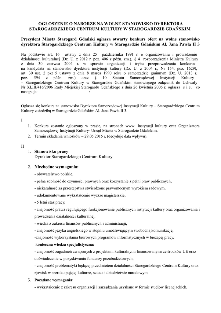 OGŁOSZENIE O NABORZE NA WOLNE STANOWISKO DYREKTORA STAROGARDZKIEGO CENTRUM KULTURY W STAROGARDZIE GDAŃSKIM Prezydent Miasta Starogard Gdański ogłasza otwarty konkurs ofert na wolne stanowisko dyrektora Starogardzkiego Centrum Kultury w Starogardzie Gdańskim Al. Jana Pawła II 3 Na podstawie art. 16 ustawy z dnia 25 października 1991 r. o organizowaniu i prowadzeniu działalności kulturalnej (Dz. U. z 2012 r. poz. 406 z późn. zm.), § 4 rozporządzenia Ministra Kultury z dnia 30 czerwca 2004 r. w sprawie organizacji i trybu przeprowadzania konkursu na kandydata na stanowisko dyrektora instytucji kultury (Dz. U. z 2004 r., Nr 154, poz. 1629), art. 30 ust. 2 pkt 5 ustawy z dnia 8 marca 1990 roku o samorządzie gminnym (Dz. U. 2013 r. poz. 594 z późn. zm.) oraz § 10 Statutu Samorządowej Instytucji Kultury – Starogardzkiego Centrum Kultury w Starogardzie Gdańskim stanowiącego załącznik do Uchwały Nr XLIII/416/2006 Rady Miejskiej Starogardu Gdańskiego z dnia 26 kwietnia 2006 r. ogłasza s i ę, co następuje: : Ogłasza się konkurs na stanowisko Dyrektora Samorządowej Instytucji Kultury – Starogardzkiego Centrum Kultury z siedzibą w Starogardzie Gdańskim Al. Jana Pawła II 3. I 1. Konkurs zostanie ogłoszony w prasie, na stronach www: instytucji kultury oraz Organizatora Samorządowej Instytucji Kultury- Urząd Miasta w Starogardzie Gdańskim. 2. Termin składania wniosków – 29.05.2015 r. (decyduje data wpływu). II 1. Stanowisko pracy Dyrektor Starogardzkiego Centrum Kultury 2. Niezbędne wymagania: - obywatelstwo polskie, - pełna zdolność do czynności prawnych oraz korzystanie z pełni praw publicznych, - niekaralność za przestępstwa stwierdzone prawomocnym wyrokiem sądowym, - udokumentowane wykształcenie wyższe magisterskie, - 5 letni staż pracy, - znajomość prawa regulującego funkcjonowanie publicznych instytucji kultury oraz organizowania i prowadzenia działalności kulturalnej, - wiedza z zakresu finansów publicznych i administracji, - znajomość języka angielskiego w stopniu umożliwiającym swobodną komunikację, -znajomość wykorzystania biurowych programów informatycznych w bieżącej pracy. konieczna wiedza specjalistyczna: - znajomość zagadnień związanych z projektami kulturalnymi finansowanymi ze środków UE oraz doświadczenie w pozyskiwaniu funduszy pozabudżetowych, - znajomość problematyki będącej przedmiotem działalności Starogardzkiego Centrum Kultury oraz zjawisk w szeroko pojętej kulturze, sztuce i dziedzictwie narodowym. 3. Pożądane wymagania: - wykształcenie z zakresu organizacji i zarządzania uzyskane w formie studiów licencjackich, magisterskich, wyższych studiów zawodowych, studiów podyplomowych lub udokumentowanych kursów/szkoleń, - znajomość lokalnych i krajowych środowisk twórczych, - znajomość drugiego języka obcego, - do wniosku mogą być dołączone opinie lub rekomendacje - umiejętność kierowania zespołem oraz predyspozycje, zdolności menedżerskie i organizatorskie. 4. Wnioski składane przez kandydatów muszą zawierać: - podanie z uzasadnieniem ubiegania się o stanowisko dyrektora Starogardzkiego Centrum Kultury, - CV, - kwestionariusz osobowy, - kserokopie świadectw pracy, - autorskie opracowanie koncepcji programowo – organizacyjnej Starogardzkiego Centrum Kultury na okres 3 lat, uwzględniającej możliwości budżetowe instytucji i pozyskiwanie środków zewnętrznych, wraz z pisemnym oświadczeniem o przeniesieniu wszelkich majątkowych praw autorskich do w/w opracowania na rzecz Gminy Miejskiej Starogard Gdański, - kserokopie dokumentów potwierdzających wykształcenie oraz kursy kwalifikacyjne, bądź inne formy kształcenia, - podpisane oświadczenie, że kandydat nie był skazany prawomocnym wyrokiem sądu za umyślne przestępstwo ścigane z oskarżenia publicznego lub umyślne przestępstwo skarbowe, - podpisane oświadczenie o stanie zdrowia i braku przeciwwskazań zdrowotnych do wykonywania pracy na danym stanowisku, - podpisane oświadczenie, że kandydat nie był karany zakazem pełnienia funkcji kierowniczych związanych z dysponowaniem środkami publicznymi, o których mowa w art. 31 ust. 1 pkt 4 ustawy z dnia 17 grudnia 2004 r. o odpowiedzialności za naruszenie dyscypliny finansów publicznych (Dz. U. 2013, poz. 168.), - wyrażam zgodę na przetwarzanie na potrzeby postępowania rekrutacyjnego danych osobowych, zgodnie z ustawą z dnia 29 sierpnia 1997 roku o ochronie danych osobowych (Dz. U. 2014 r. poz. 1182). 5. Warunkiem dopuszczenia oferty do procedury konkursowej jest spełnienie wymagań określonych w ogłoszeniu o konkursie. 6. Wniosek wraz z załącznikami należy przesłać w zamkniętej kopercie z dopiskiem "Konkurs na stanowisko dyrektora Samorządowej Instytucji Kultury – Starogardzkiego Centrum Kultury w Starogardzie Gdańskim Al. Jana Pawła II 3" lub dostarczyć do Biura Obsługi Klienta mieszczącego się w Urzędzie Miasta Starogard Gdański ul. Gdańska 6, 83-200 Starogard Gdański pokój Nr 01 (parter) w nieprzekraczalnym terminie do dnia 29.05.2015 r. Koncepcja programowo – organizacyjna Starogardzkiego Centrum Kultury nie podlega zwrotowi i może być wykorzystana przez Prezydenta Miasta Starogard Gdański. 7. Informacji o konkursie oraz warunkach organizacyjno – finansowych Dyrektora Starogardzkiego Centrum Kultury udziela Wydział Informacji Społecznej Urzędu Miasta przy ul. Gdańskiej 6 w Starogardzie Gdańskim, pokój 125, codziennie w godzinach pracy Urzędu. Osobą uprawnioną do udzielania informacji na temat konkursu jest Pani Anna Gracz – Główny specjalista Wydziału Informacji Społecznej, tel. 58 530-60-93, [email protected] Ze strony Starogardzkiego Centrum Kultury informacji udziela Pan Marek Banach tel., 783-050507, [email protected] 8. Do przeprowadzenia postępowania konkursowego Prezydent powoła komisję konkursową (dalej zwaną komisją), zgodnie z art. 16 ust. 4 ustawy z dnia 25 października 