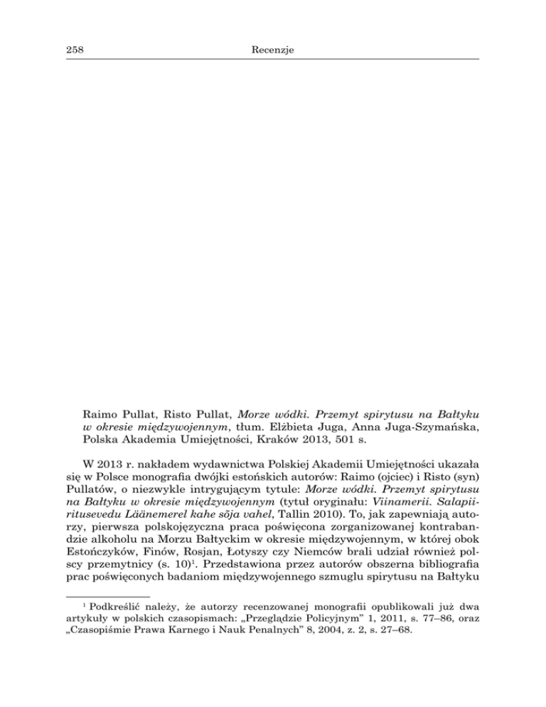 258 Recenzje o akceptowalnej długości spódnicy, szerokości nogawki, kształcie kołnierza… Rzeczą fascynującą byłoby prześledzenie dróg rozchodzenia się takich kodów odzieżowych, dróg zapewne różnych w różnych środowiskach, co zapewne dodałoby smaku rzeczy całej (mogłoby się np. okazać, że arbiter elegantiarum jednej grupy społecznej jest absolutnym antywzorem dla innej). Naturalnie niezwykle ważnym elementem pracy o modzie jest materiał ilustracyjny. Często szybciej i trafniej objaśnia on pewne zjawiska niż grube strony opisów. W pracy Sieradzkiej jest on obfity, ciekawy i różnorodny (zdjęcia sytuacyjne z NAC, reprodukcje z międzywojennych czasopism, reklamy i – najcenniejsze chyba – zdjęcia eksponatów z unikatowej kolekcji Adama Lei), chociaż może nie zawsze trafnie dobrany – np. bardzo skądinąd ciekawej obserwacji, iż Polki były dość powściągliwe w noszeniu biżuterii (szkoda wielka, że autorka nie pokusiła się o próbę wyjaśnienia przyczyn tego zjawiska! Czyżby jakieś zaszłości z czasów żałoby narodowej?) towarzyszy fotografia Ordonki kapiącej od precjozów. Moda to nie tylko katalog rzeczy, które „się nosi”, to również mechanizmy upowszechniania tej wiedzy i wymuszania zastosowania się do niej. Ten blok tematów, mogący wnieść wiele do naszej wiedzy o funkcjonowaniu społeczeństwa II Rzeczypospolitej, nie został jednak rozwinięty w pracy Sieradzkiej. Tym niemniej niezależnie od wskazanych niedoskonałości omawianej pracy oraz nieodpartego poczucia niedosytu, jaki odczuwać można po zakończeniu jej lektury, należy stwierdzić, że otrzymaliśmy interesującą książkę, w istotny sposób poszerzającą zakres naszej wiedzy o rzeczywistości społecznej i kulturze życia codziennego Polski w okresie międzywojennym. Dorota Zamojska Raimo Pullat, Risto Pullat, Morze wódki. Przemyt spirytusu na Bałtyku w okresie międzywojennym, tłum. Elżbieta Juga, Anna Juga-Szymańska, Polska Akademia Umiejętności, Kraków 2013, 501 s. W 2013 r. nakładem wydawnictwa Polskiej Akademii Umiejętności ukazała się w Polsce monografia dwójki estońskich autorów: Raimo (ojciec) i Risto (syn) Pullatów, o niezwykle intrygującym tytule: Morze wódki. Przemyt spirytusu na Bałtyku w okresie międzywojennym (tytuł oryginału: Viinamerii. Salapiiritusevedu Läänemerel kahe sõja vahel, Tallin 2010). To, jak zapewniają autorzy, pierwsza polskojęzyczna praca poświęcona zorganizowanej kontrabandzie alkoholu na Morzu Bałtyckim w okresie międzywojennym, w której obok Estończyków, Finów, Rosjan, Łotyszy czy Niemców brali udział również polscy przemytnicy (s. 10)1. Przedstawiona przez autorów obszerna bibliografia prac poświęconych badaniom międzywojennego szmuglu spirytusu na Bałtyku 1 Podkreślić należy, że autorzy recenzowanej monografii opublikowali już dwa artykuły w polskich czasopismach: „Przeglądzie Policyjnym” 1, 2011, s. 77–86, oraz „Czasopiśmie Prawa Karnego i Nauk Penalnych” 8, 2004, z. 2, s. 27–68. Recenzje 259 jednoznacznie wskazuje, że temat ten w historiografiach państw skandynawskich (do których w tym miejscu zaliczymy także Estonię i Finlandię) ma już długą tradycję. Zdaniem Pullatów najsilniejszą w tej grupie pozostaje zdecydowanie historiografia fińska (s. 25). W znacznie mniejszym stopniu problematyka międzywojennego morskiego przemytu alkoholu budzi zainteresowanie polskich historyków2. Wspomnijmy jednak w tym miejscu, że w polskim piśmiennictwie historycznym podjęto już pierwsze próby analiz zjawiska przemytu w ogóle w XX w.3 Pełniejsza charakterystyka kontrabandy w II Rzeczypospolitej (np. porównanie sytuacji na wszystkich granicach) byłaby istotnym uzupełnieniem badań nad międzywojenną przestępczością. Badań prowadzonych nie przez pryzmat zwalczających ją formacji (co właściwie jest zjawiskiem powszechnym), ale przede wszystkim odpowiedzialnych za jej rozwój ludzi. Próbą napisania historii, której bohaterami są zarówno ścigani (szmuglerzy), jak i ścigający (policja, straż graniczna), pozostaje recenzowana tu praca. Licząca sobie blisko 500 stron monografia jest efektem prowadzonych, przede wszystkim przez Raimo Pullata, już od kilkudziesięciu lat badań, opartych na bogatym materiale źródłowym. Omawiana książka to rozszerzona o analizę kontekstu międzynarodowego wersja wydanej na początku lat 90. XX w. monografii „Przemyt spirytusu z Estonii do Finlandii w latach 1919–1939”, której autorem był właśnie Raimo Pullat. Praca ta nie ukazała się po polsku (ani po angielsku), stąd nie sposób ocenić, w jakim stopniu ustalenia zawarte w Morzu wódki… pozostają różne lub zbieżne z wnioskami płynącymi z pracy z 1993 r. Celem autorów jest omówienie „nielegalnego przemytu spirytusu w okresie prohibicji jako jednej z form przejawu międzynarodowej zorganizowanej przestępczości” (s. 9). Choć obszarem geograficzno-historycznym, po którym autorzy planują nas oprowadzić (wskazuje na to tytuł książki), pozostaje basen Morza Bałtyckiego, to jednak terytorium Zatoki Fińskiej i Botnickiej oraz zachodnich wybrzeży Estonii i Finlandii opuszczamy, z małymi wyjątkami, niezwykle rzadko. W zasadzie praca poświęcona została zjawisku nielegalnego przemytu spirytusu z Estonii do Finlandii (rzadziej w odwrotnym kierunku), który autorzy starają się z różnym skutkiem osadzić w szerszym kontekście kontrabandy alkoholu w całym regionie. Prymat stosunków estońsko-fińskich widoczny jest, poza samą treścią i konstrukcją książki, już w doborze źródeł, które wykorzystano w pracy. Autorzy, poza drobnym wyjątkiem (kwerenda w AAN i w archiwum gdańskim oraz wizyty w bibliotekach niemieckich i łotewskich – celem było uzupełnienie zbiorów fotograficznych), korzystali wyłącznie z zasobów fińskich i estońskich instytucji. Wybór Estonii i Finlandii Przede wszystkim: 