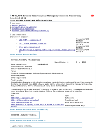 RB-W_ASO: Zwołanie Nadzwyczajnego Walnego Zgromadzenia Akcjonariuszy Data: 2016-06-20 Firma: LOKATY BUDOWLANE SPÓŁKA AKCYJNA 1. 2. 3. 4. Spis tresci: RAPORT BIEŻĄCY MESSAGE (ENGLISH VERSION) INFORMACJE O PODMIOCIE PODPISY OSÓB REPREZENTUJĄCYCH SPÓŁKĘ Spis zalacznikow: Znaleziono 4 załączniki • • • • Arkusz: RAPORT BIEŻĄCY Arkusz: RAPORT LBD__NWZA_projekty_uchwal.pdf BIEŻĄCY Arkusz: RAPORT Wzor_pelnomocnictwa.pdf BIEŻĄCY LBD_Informacja_o_ogolnej_liczbie_akcji_w_Spolce_i_liczbie_glosow.p Arkusz: RAPORT BIEŻĄCY df LBD_WZA_-_ogloszenie.pdf Nazwa arkusza: RAPORT BIEŻĄCY KOMISJA NADZORU FINANSOWEGO Raport bieżący nr Data sporządzenia: 5 / 2016 2016-06-20 Skrócona nazwa emitenta LOKATY BUDOWLANE S.A. Temat Zwołanie Nadzwyczajnego Walnego Zgromadzenia Akcjonariuszy Podstawa prawna Inne uregulowania Treść raportu: Zarząd Lokaty Budowlane S.A. niniejszym ogłasza zwołanie Nadzwyczajnego Walnego Zgro-madzenia Emitenta na dzień 20 lipca 2016 roku, na godz. 11.00, w Kancelarii Notarialnej Katarzyna Borawska, Krzysztof Borawski; 00-042 Warszawa; ul. Nowy Świat 41A lok.89/91. Zarząd przekazuje w załączeniu teść ogłoszenia o zwołaniu NWZ spółki wraz z projektami uchwał oraz wzór formularza do wykonywania głosu na Walnym Zgromadzeniu przez pełno-mocnika. Załączniki Plik Opis LBD_WZA_-_ogloszenie.pdf Ogłoszenie LBD__NWZA_projekty_uchwal.pdf Projekty uchwał Wzor_pelnomocnictwa.pdf Wzór pełnomocnictwa LBD_Informacja_o_ogolnej_liczbie_akcji_w_Spolce_i_liczbie_glos Informacja i liczbie akcji ow.pdf Nazwa arkusza: MESSAGE (ENGLISH VERSION) MESSAGE _ENGLISH VERSION_ Nazwa arkusza: INFORMACJE O PODMIOCIE _pełna nazwa emitenta_ _skrócona nazwa emitenta_ _kod pocztowy_ _sektor wg. klasyfikacji GPW w W-wie_ _miejscowość_ _ulica_ _numer_ _telefon_ _fax_ _e-mail_ _www_ _NIP_ _REGON_ Nazwa arkusza: PODPISY OSÓB REPREZENTUJĄCYCH SPÓŁKĘ PODPISY OSÓB REPREZENTUJĄCYCH SPÓŁKĘ Data Imię i Nazwisko Stanowisko/Funkcja Podpis 2016-06-20 Marek Kwaitkowski Prezes Zarządu Identyfikator raportu ct9oscrwj1 Nazwa raportu RB-W_ASO Symbol raportu RB-W_ASO Nazwa emitenta LOKATY BUDOWLANE SPÓŁKA AKCYJNA Symbol Emitenta LOKATY BUDOWLANE S.A. Tytul Zwołanie Nadzwyczajnego Walnego Zgromadzenia Akcjonariuszy Sektor Developerska (dev) Kod 02-473 Miasto Warszawa Ulica Popularna Nr 19 lok. 2 Tel. 022 241 19 91 Fax 022 241 19 89 e-mail [email protected] NIP 5242659969 REGON Data sporzadzenia 2016-06-20 Rok biezacy 2016 Numer 5 adres www www.lokatybudowlane.pl Serwis Ekonomiczny Polskiej Agencji Prasowej SA 2016 Copyright PAP SA - Wszelkie prawa zastrzezone.