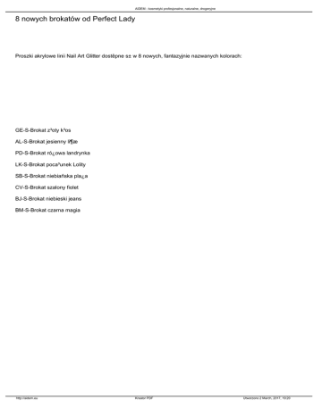AIDEM - kosmetyki profesjonalne, naturalne, drogeryjne 8 nowych brokatów od Perfect Lady Proszki akrylowe linii Nail Art Glitter dostêpne s± w 8 nowych, fantazyjnie nazwanych kolorach: GE-S-Brokat z³oty k³os AL-S-Brokat jesienny li¶æ PD-S-Brokat ró¿owa landrynka LK-S-Brokat poca³unek Lolity SB-S-Brokat niebiañska pla¿a CV-S-Brokat szalony fiolet BJ-S-Brokat niebieski jeans BM-S-Brokat czarna magia http://aidem.eu Kreator PDF Utworzono 2 March, 2017, 19:20